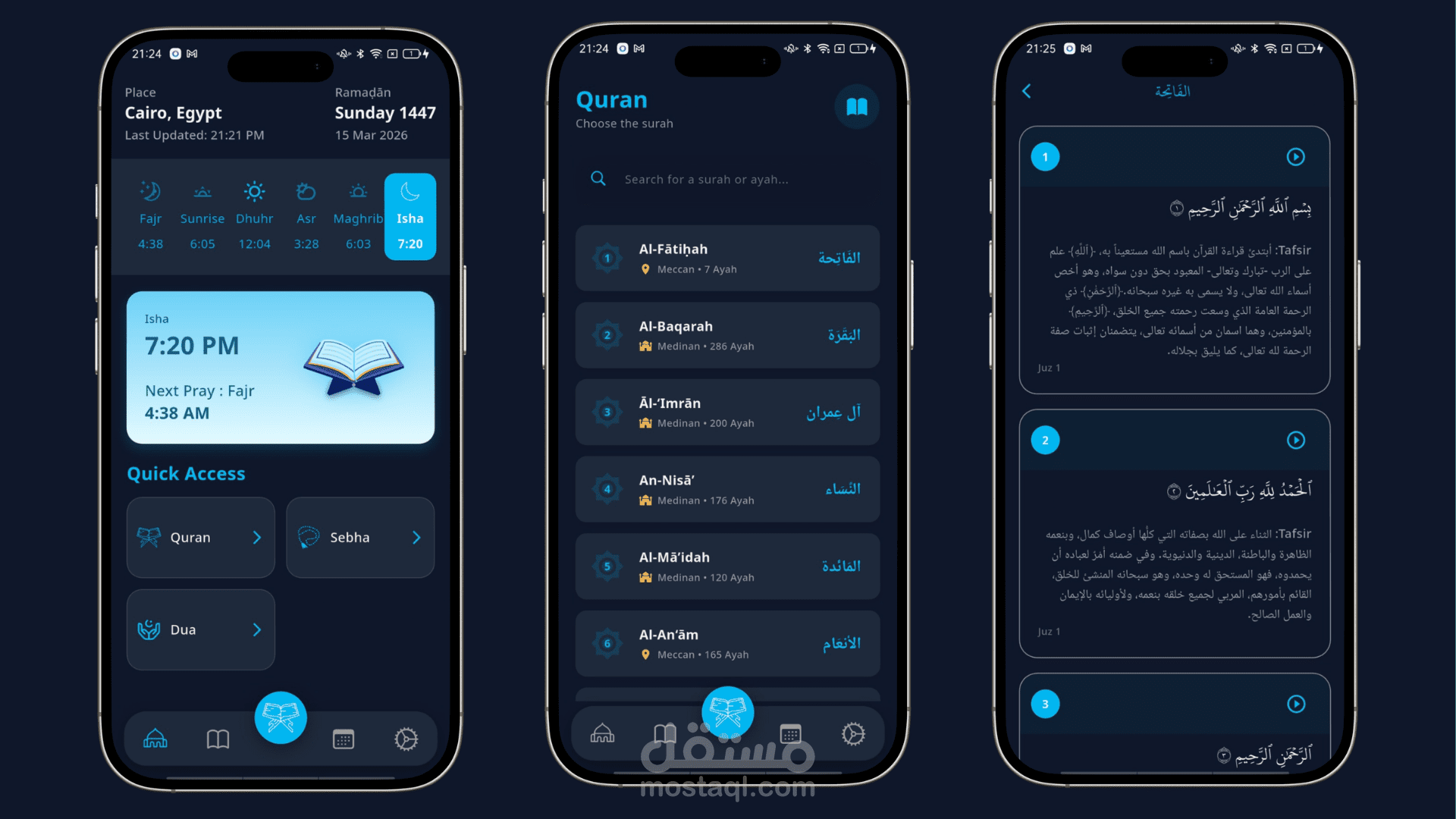 إمكانية قراءة القرآن الكريم بخط واضح مع دعم التفسير وإمكانية حفظ العلامات المرجعية للعودة إلى الآيات لاحقًا.