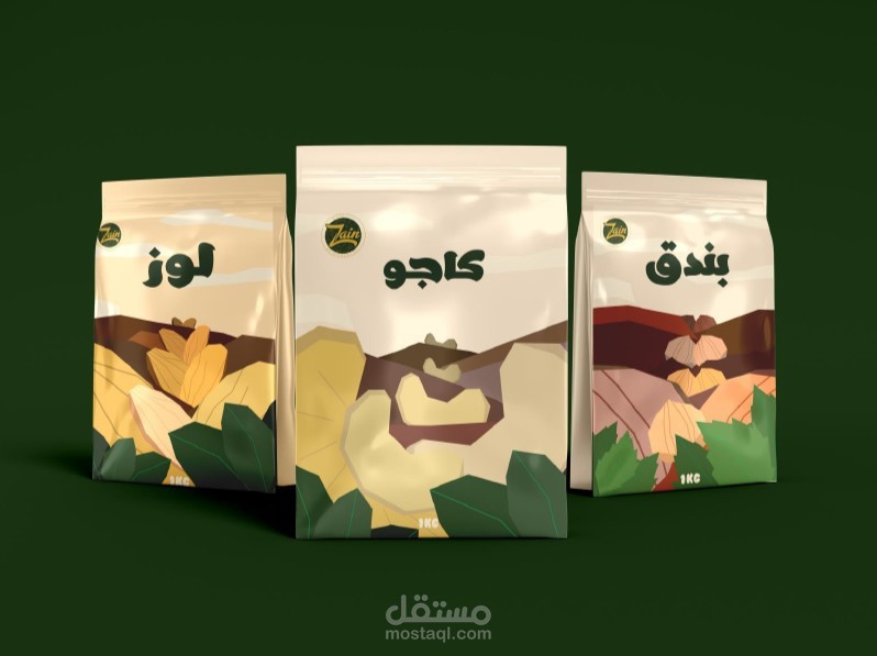 ركز التصميم على وضوح اسم المنتج، وتناغم الألوان، وبناء هوية بصرية جذابة تساعد على تمييز كل نوع من المكسرات مثل اللوز، الفستق، والبندق مع الحفاظ على طابع عصري وبسيط.