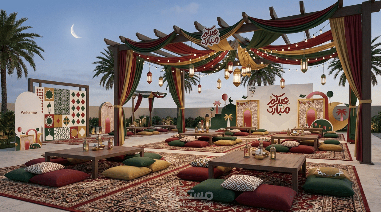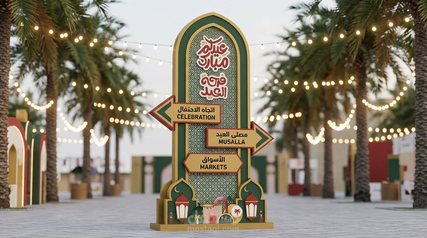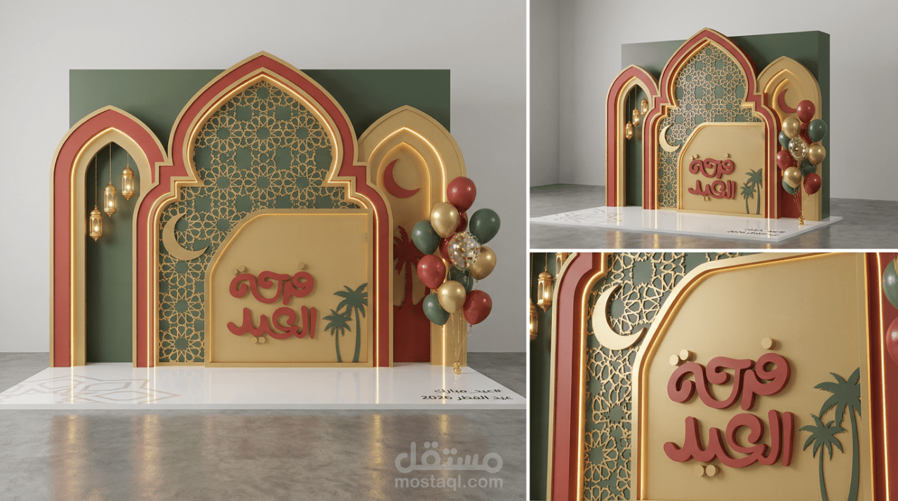 يقدم هذا المشروع تصميم تجربة متكاملة لفعالية عيد الفطر، حيث يجمع بين الهوية الثقافية والجماليات المكانية المعاصرة. يركز المفهوم على خلق بيئات دافئة واحتفالية تعكس روح العيد من خلال هياكل معيارية، وأقواس زخرفية، ومنصات عرض، وزوايا تصوير، ومكاتب استقبال.