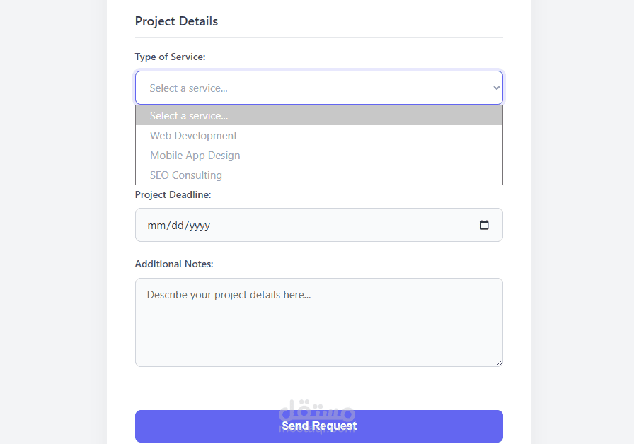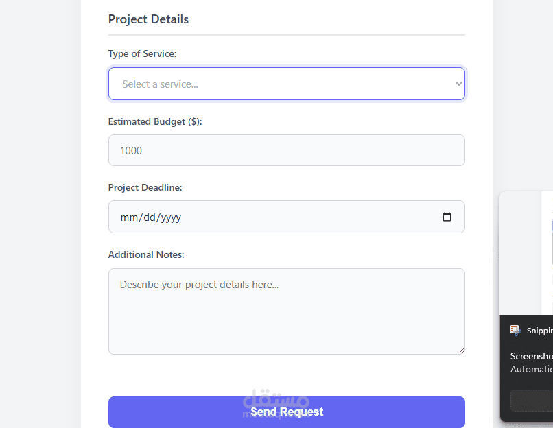 قمت بتطوير نموذج طلب خدمة متكامل يجمع بين بساطة الكود وجمال التصميم (UI/UX)، مخصص للشركات التقنية والمستقلين لجمع بيانات المشاريع من العملاء بشكل منظم واحترافي.