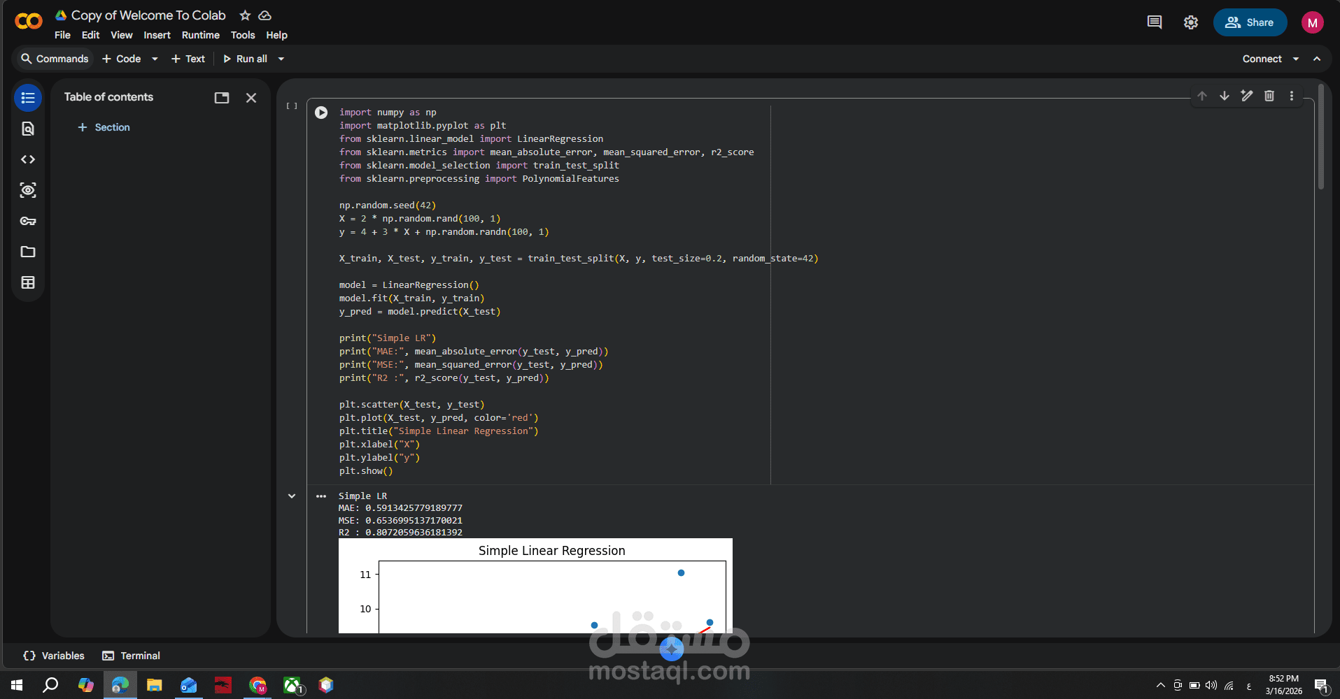 المشروع عبارة عن بناء model قادر علي التنبؤ بالقيم باستخدام خوارزميات الانحدار المختلفة. في البداية اقدم له بعض الأرقام العشوائية المختلفة ثم تقسيمها إلى بيانات تدريب واختبار لبناء النموذج وتقييم أدائه. بعد ذلك يتم تطبيق عدة أنواع من نماذج الانحدار لمقارنة أدائها في التنبؤ بالبيانات.