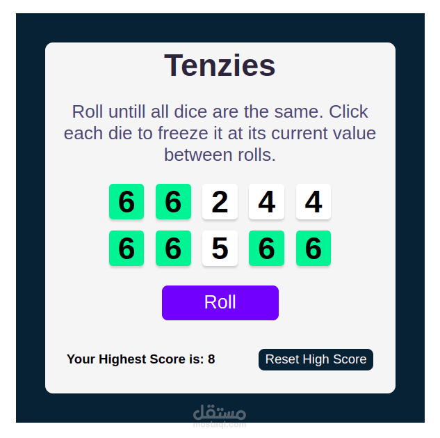 Tenzie Game is a game that gives you 10 Dices where your task or your way to win the game is when you get all 10 Dices has the same value, in order to achieve this you have a button called "Roll" for each time you press it, it changes the value of each unholded dice. by pressing on the dice you hold it's value making the roll button not changing the value of the holded dice. So simply to win you choose a value and press each dice has this value then press roll button and the other dices value changes then hold the dices that gives you the holded and needed value for you, keep doing this untill you make all 10 dices match. then you know how many roll button you needed to win.
