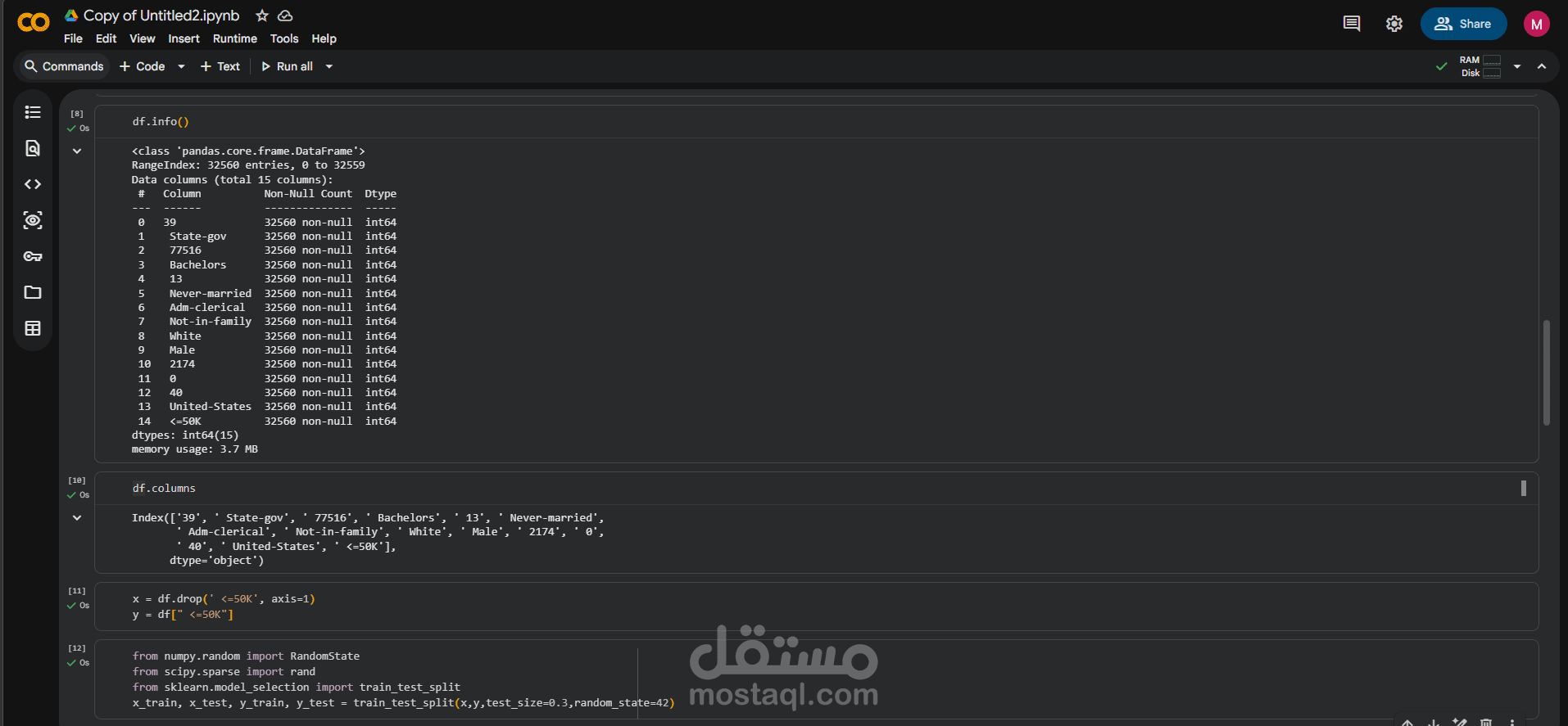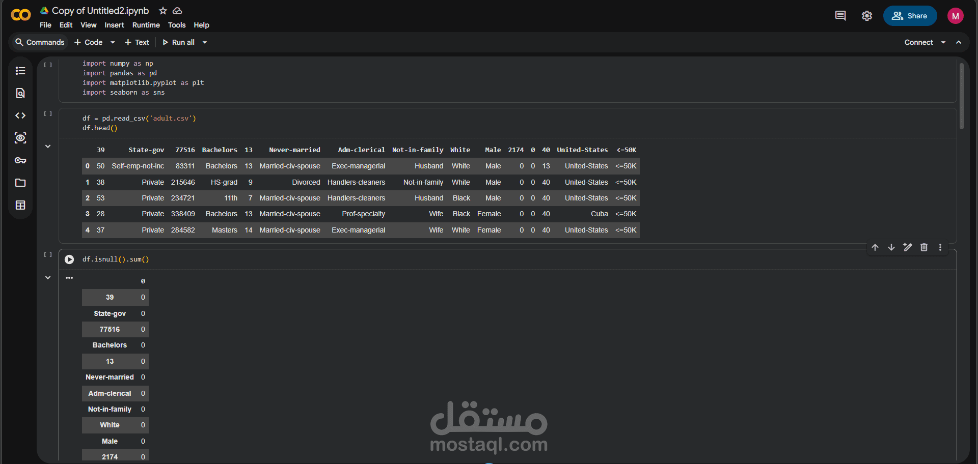 المشروع هدفة التنبؤ بما إذا كان دخل الفرد يتجاوز 50 ألف دولار سنويًا باستخدام تقنيات تعلم الآلة. تم استخدام مجموعة بيانات adult التي تحتوي على معلومات ديموغرافية ووظيفية مثل العمر، المستوى التعليمي، المهنة، الحالة الاجتماعية، وعدد ساعات العمل.