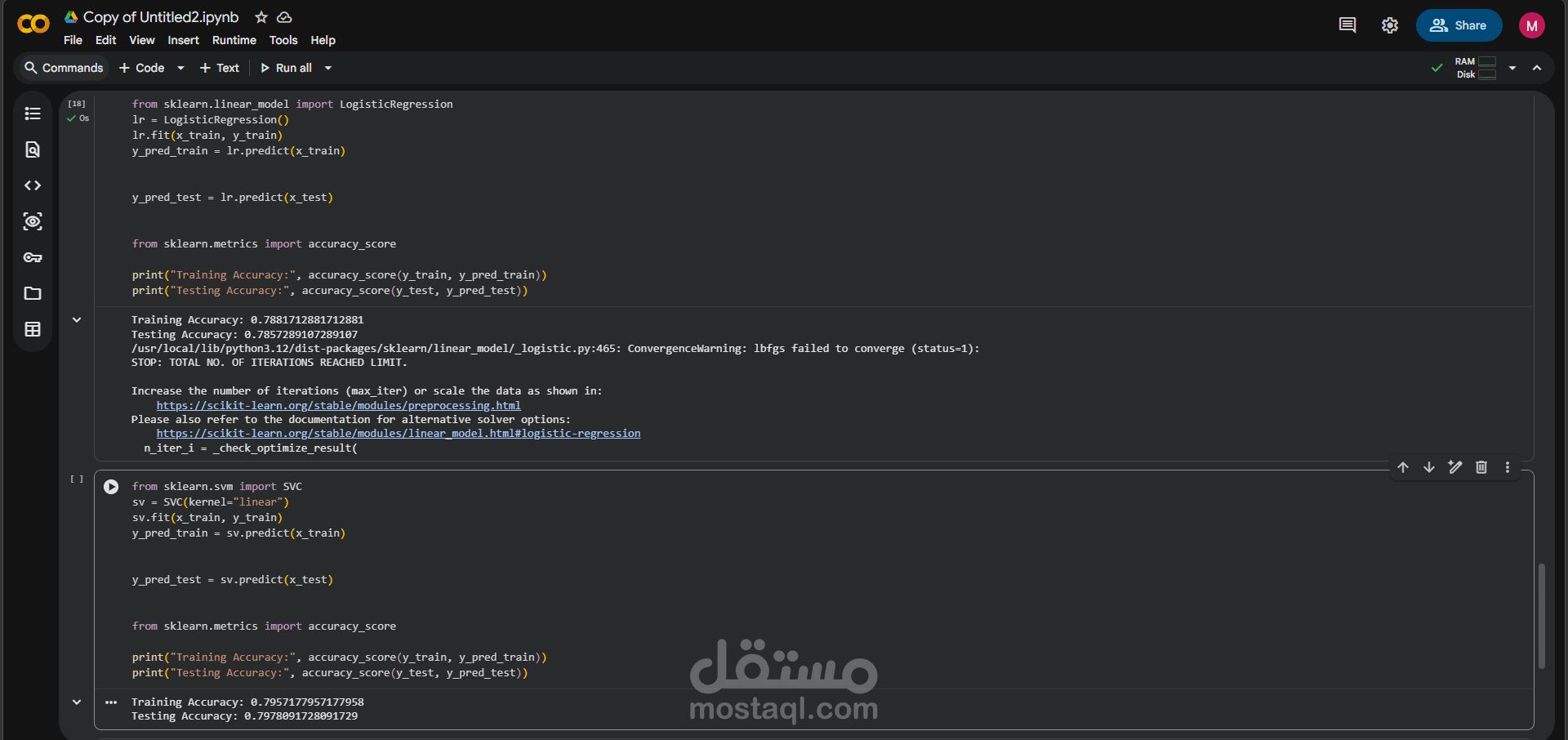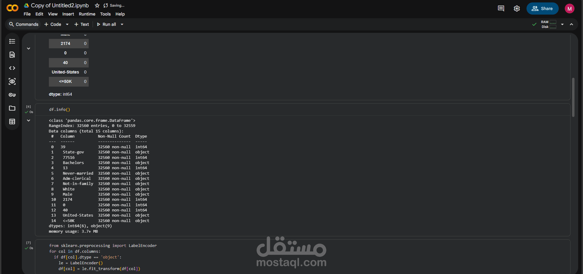 في البداية تم تنفيذ مرحلة معالجة البيانات (Data Preprocessing) والتي شملت تنظيف البيانات، معالجة القيم المفقودة، وتحويل المتغيرات النصية إلى متغيرات رقمية لتصبح مناسبة لتدريب نماذج تعلم الآلة.
