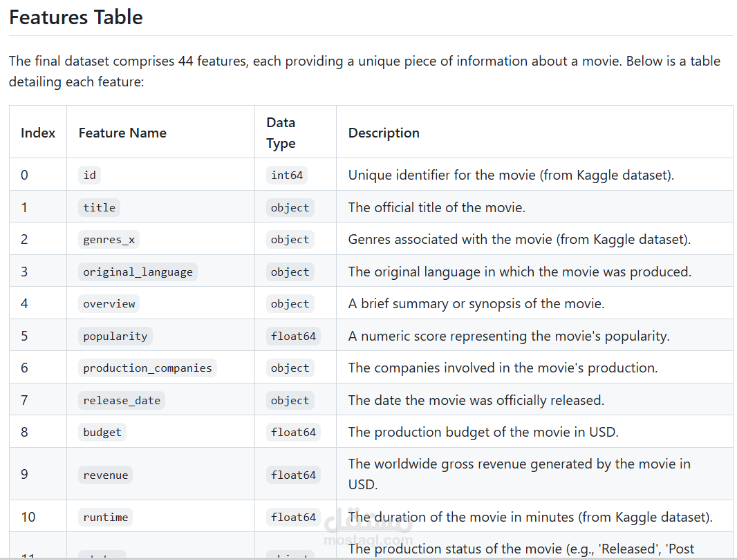 The final dataset comprises 44 features, each providing a unique piece of information about a movie. Below is a table detailing each feature:
