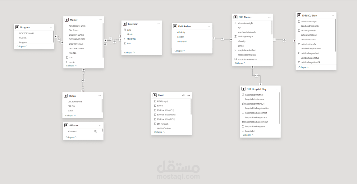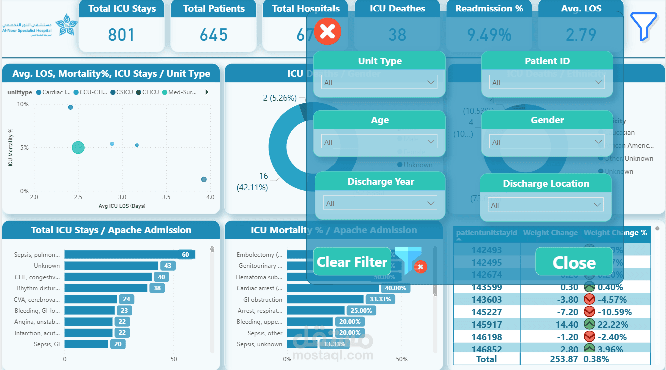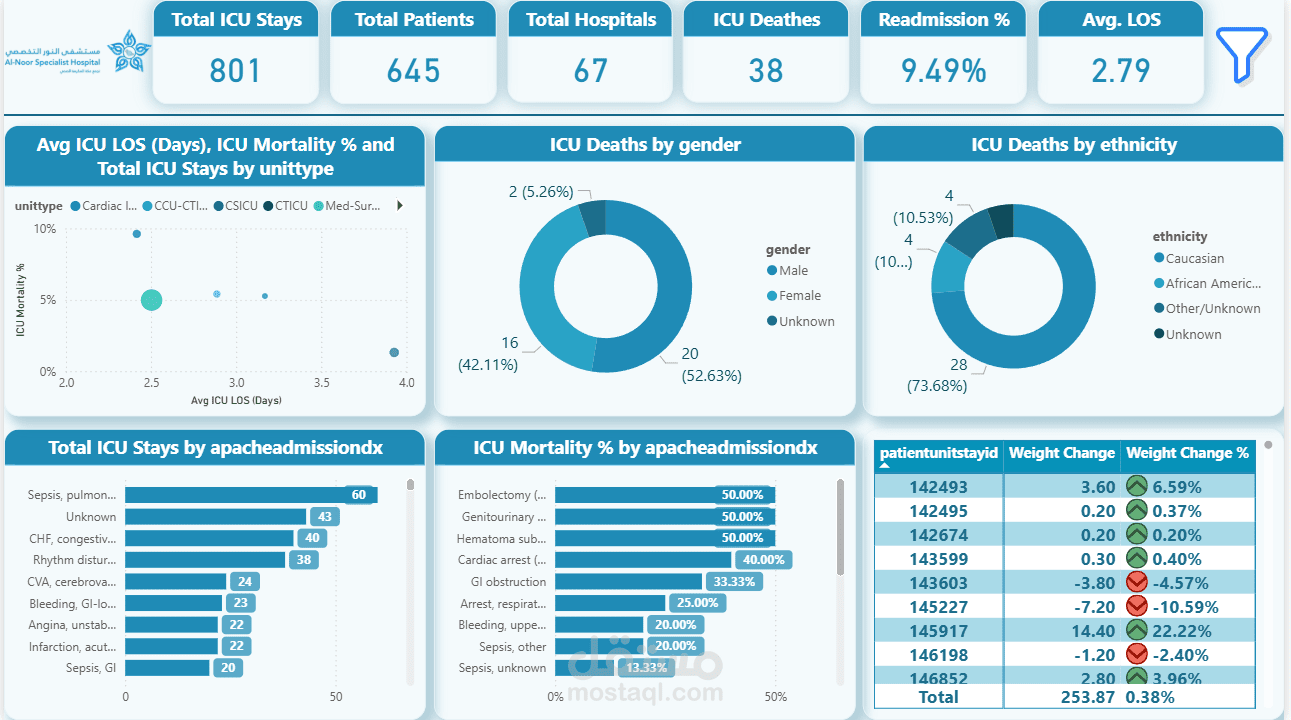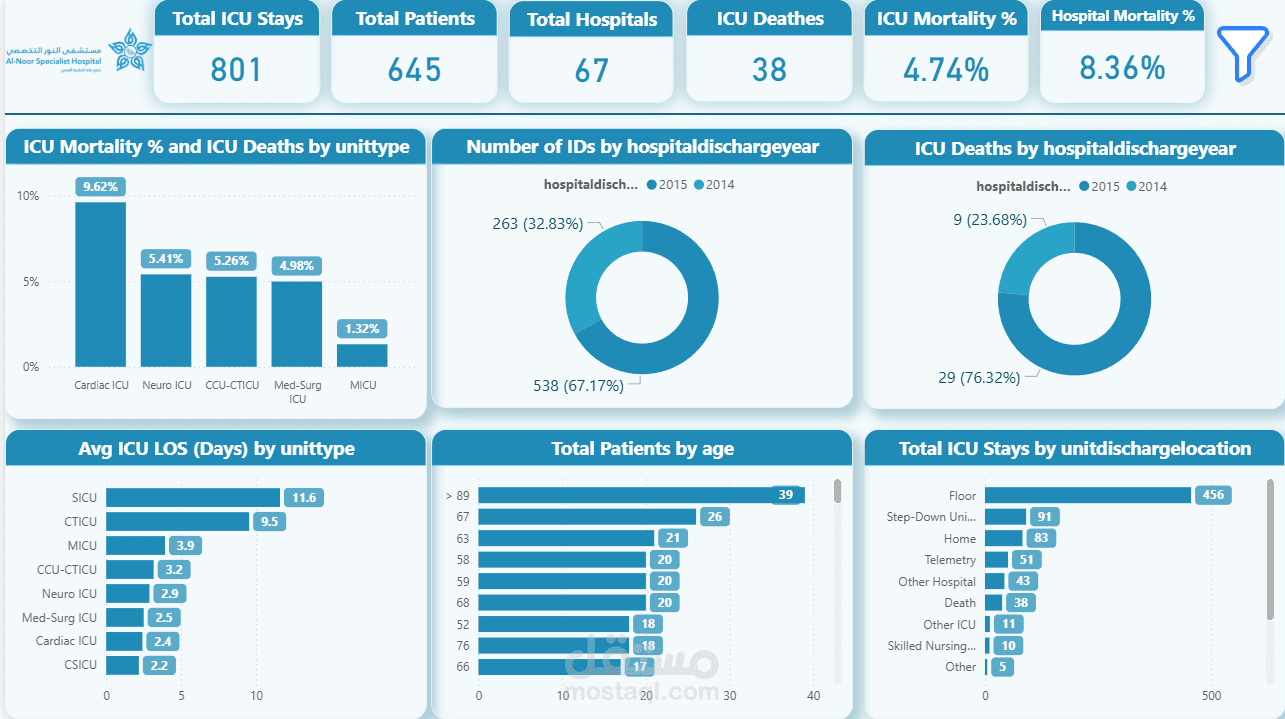 النظرة العامة (الخلاصة): المستشفى استقبلت 801 حالة دخول للعناية المركزة، لـ 645 مريض. نسبة الوفيات جوة العناية (ICU Mortality) حوالي 4.74%، ونسبة رجوع المريض للعناية تاني بعد ما خرج منها (Readmission) حوالي 9.49%. الأرقام دي هي الترمومتر اللي بيقيس كفاءة الدكاترة والرعاية.