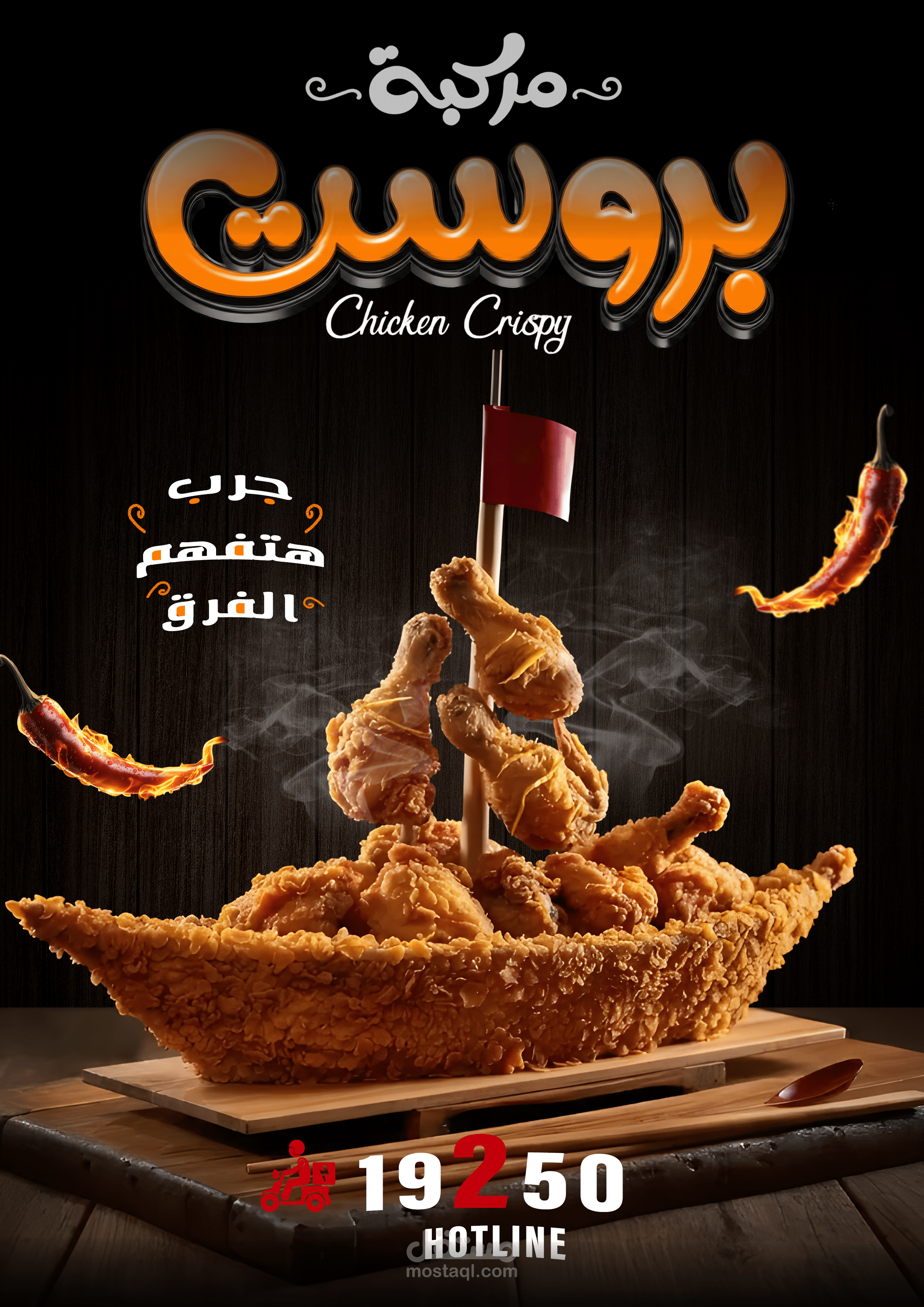 Warm lighting, detailed textures, and a dark background were used to enhance contrast and highlight the crispiness and golden color of the food. The typography complements the visual by adding a modern and جذاب identity that strengthens the overall branding.