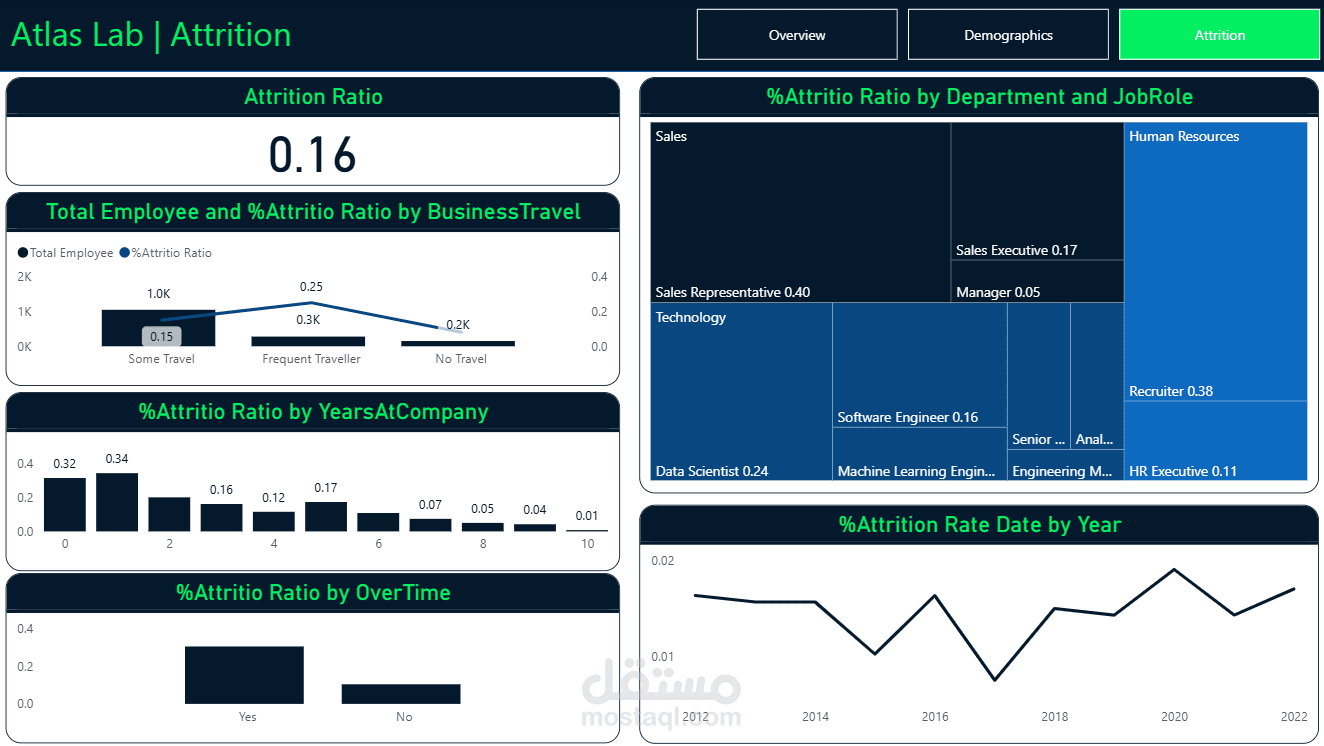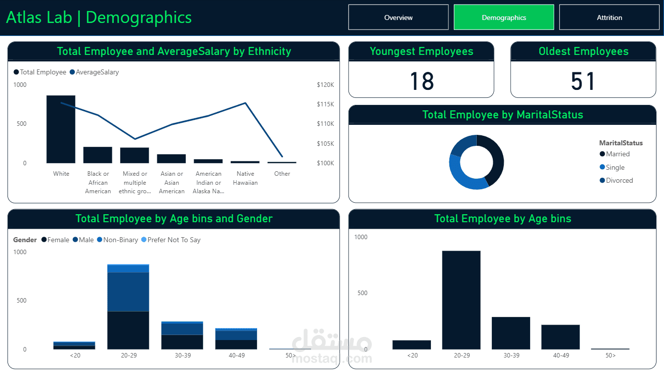 قمت بتصميم Dashboard احترافي لتحليل بيانات الموارد البشرية باستخدام Power BI، يساعد الشركات على اتخاذ قرارات مبنية على البيانات.