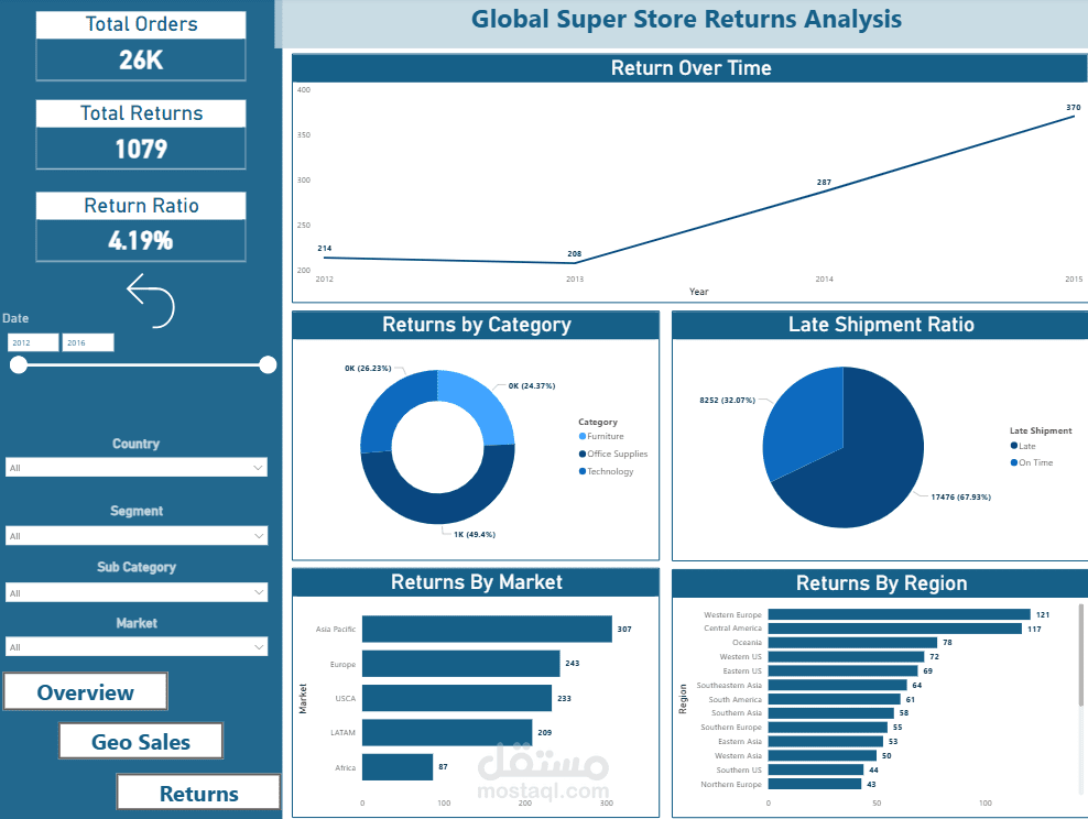 قمت بتصميم Dashboard تفاعلي لتحليل بيانات متجر عالمي (Global Store) باستخدام Power BI، بهدف تتبع الأداء العام وتحليل المبيعات جغرافيًا ومعدلات المرتجعات.