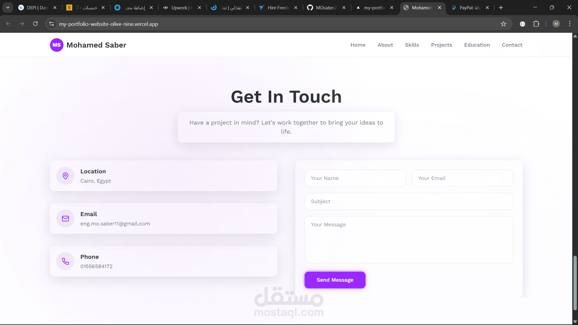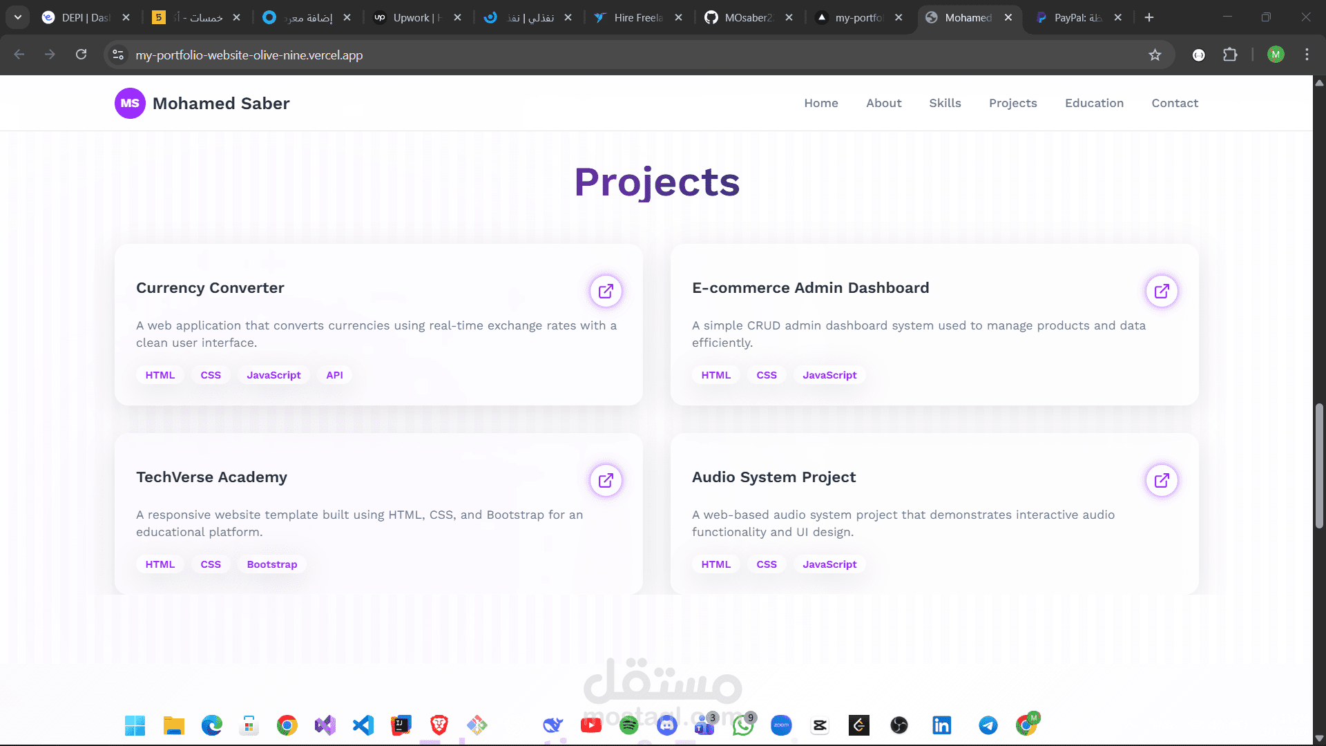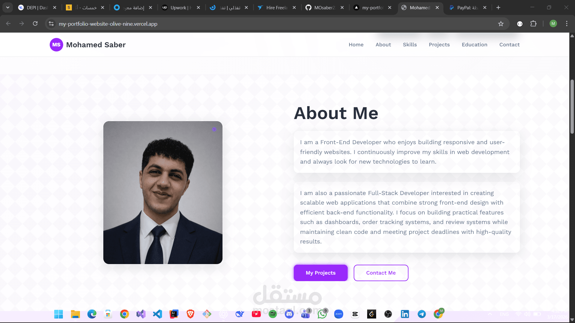 هذا مشروع موقع بورتفوليو شخصي تم تصميمه وتطويره لعرض مهاراتي ومشاريعي وخبراتي كمطور واجهات أمامية (Front-end Developer).