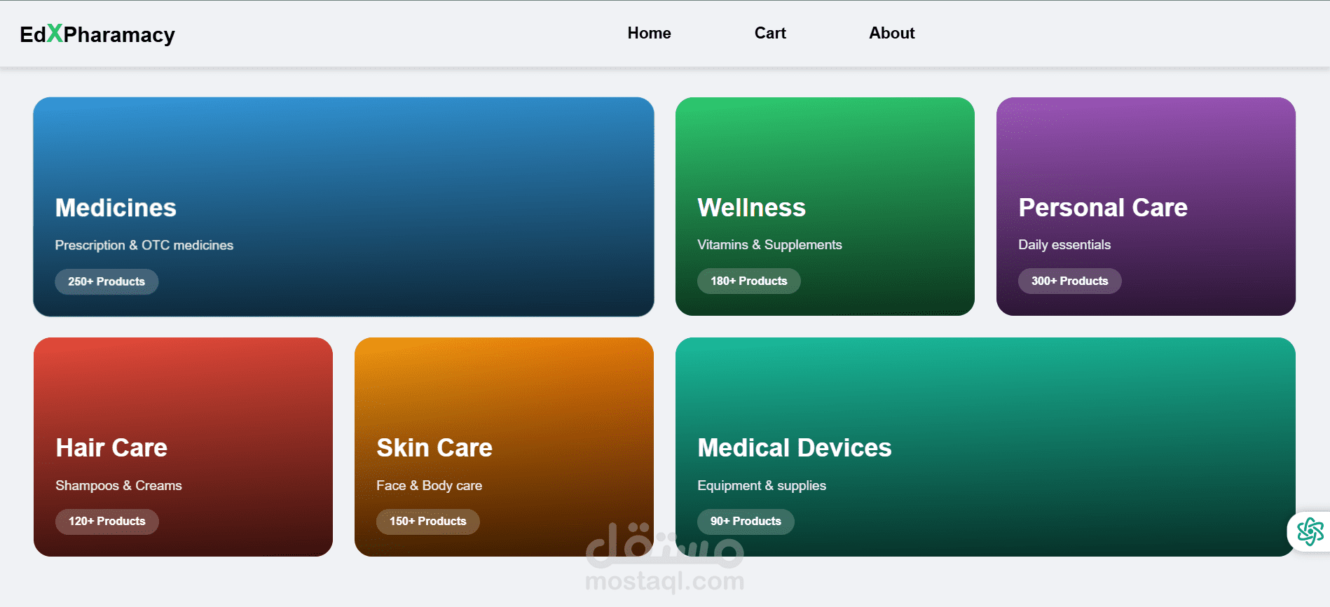 يشمل المشروع صفحات أساسية مثل الصفحة الرئيسية (Home)، وسلة المشتريات (Cart)، وصفحة من نحن (About)، مع تنظيم المنتجات وعرضها بطريقة جذابة تساعد المستخدم في اتخاذ قرار الشراء بسهولة.