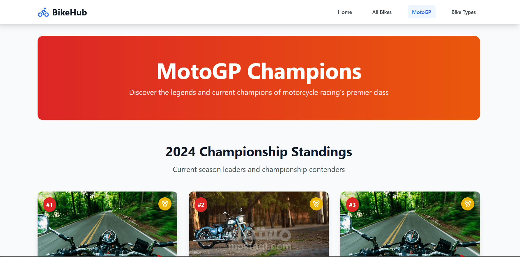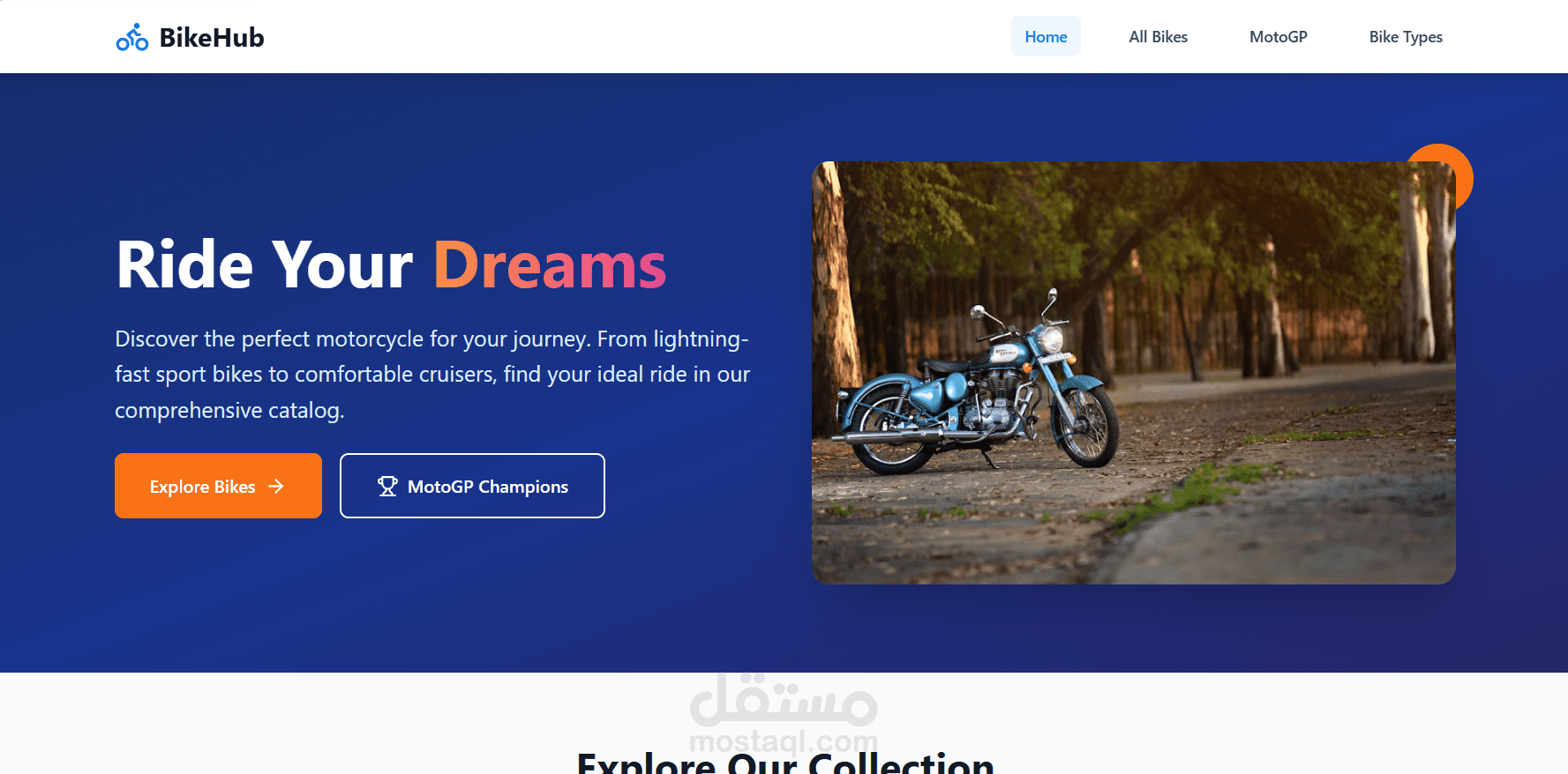 الصفحة الرئيسية (Homepage): تحتوي على (Hero Section) يعرض دراجة نارية بخلفية شفافة وعنوان جذاب لمحبي الدراجات، مع بطاقات انتقال سريع إلى الأقسام المختلفة: دراجات MotoGP، أنواع الدراجات، الأعلى تقييماً، وجميع الدراجات.