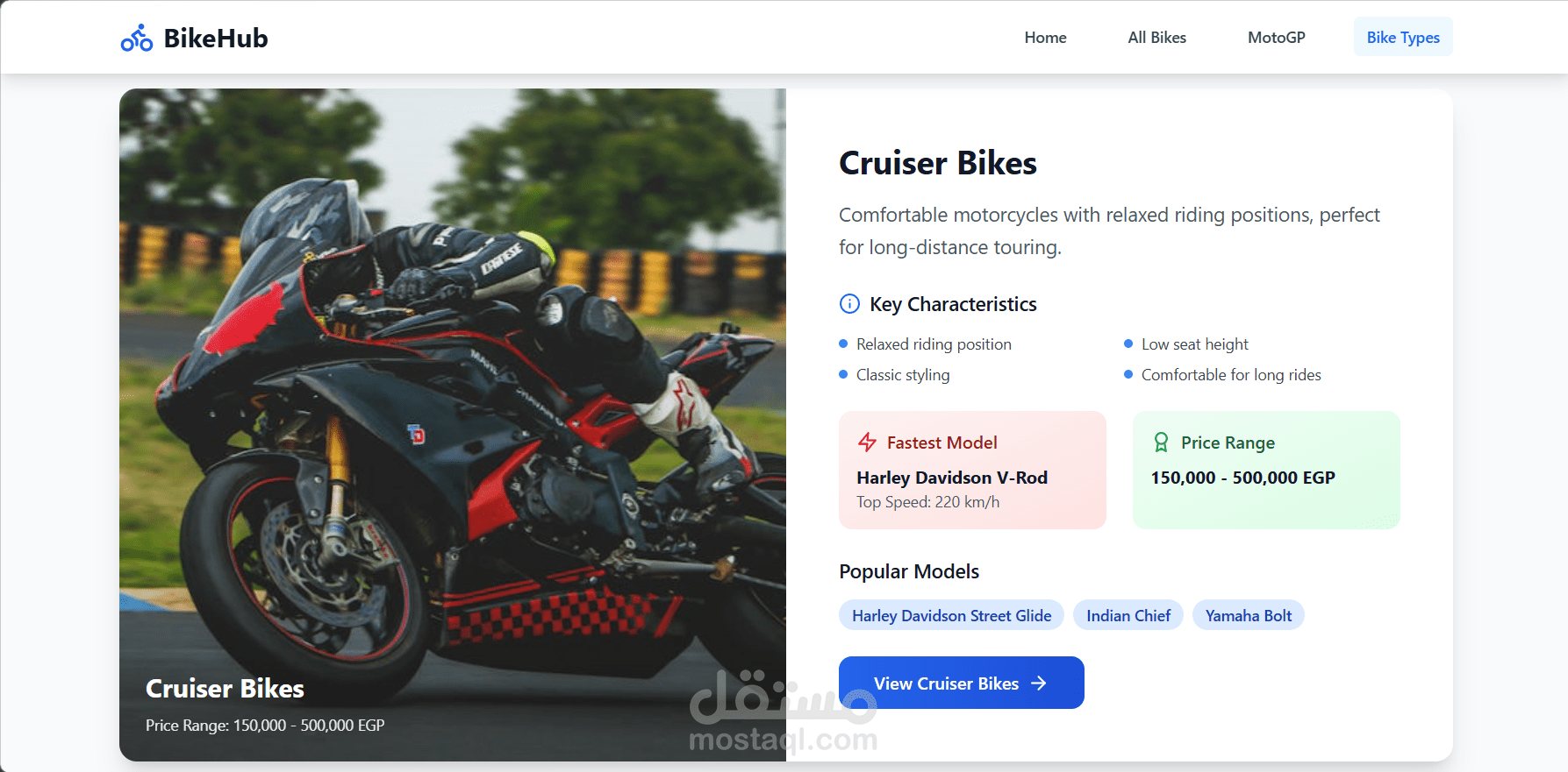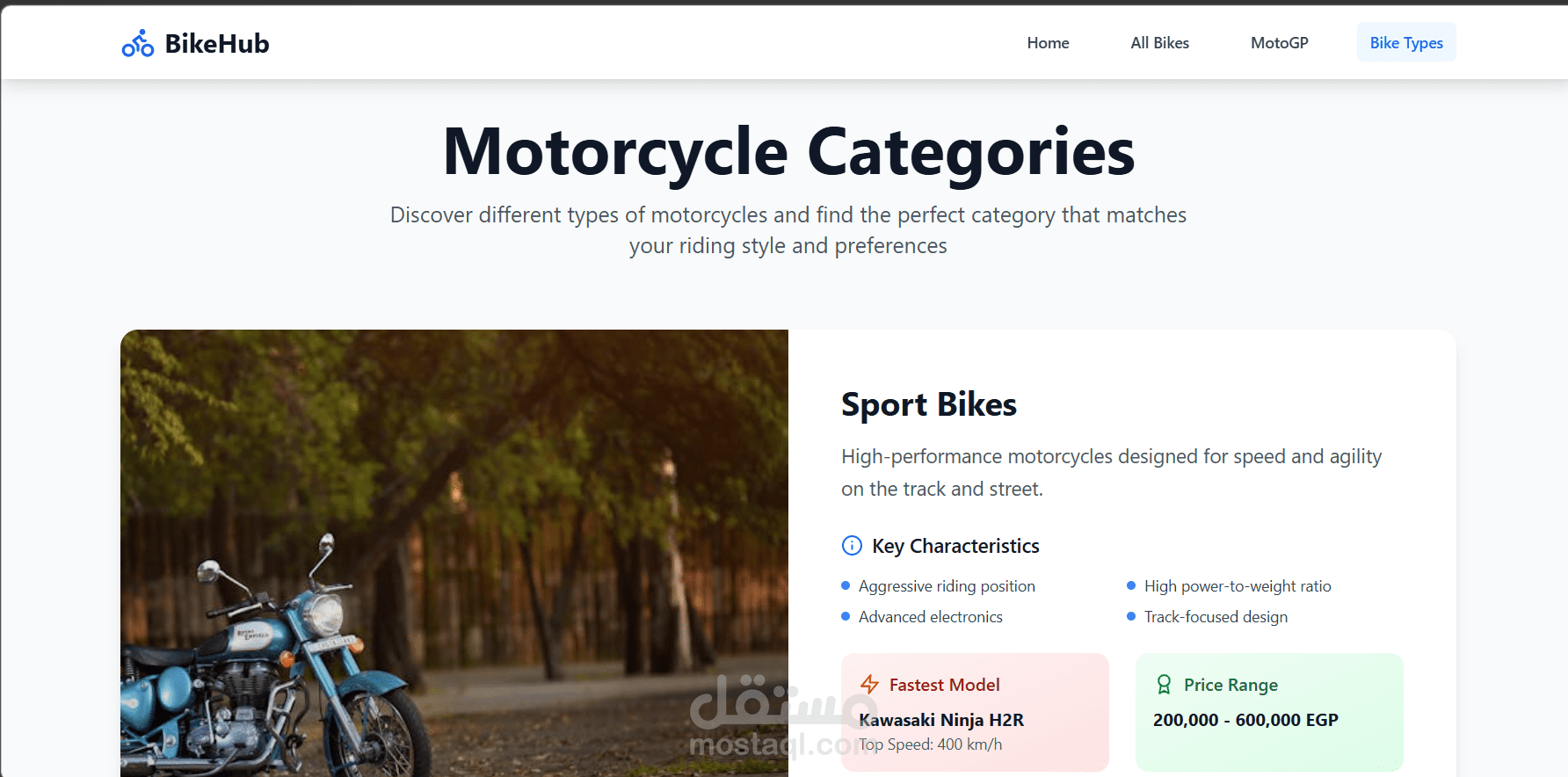 صفحة أنواع الدراجات (Bike Types): تستعرض فئات مختلفة من الدراجات مع أمثلة لكل نوع، وتفاصيل دقيقة عن أسرع دراجة في كل فئة.