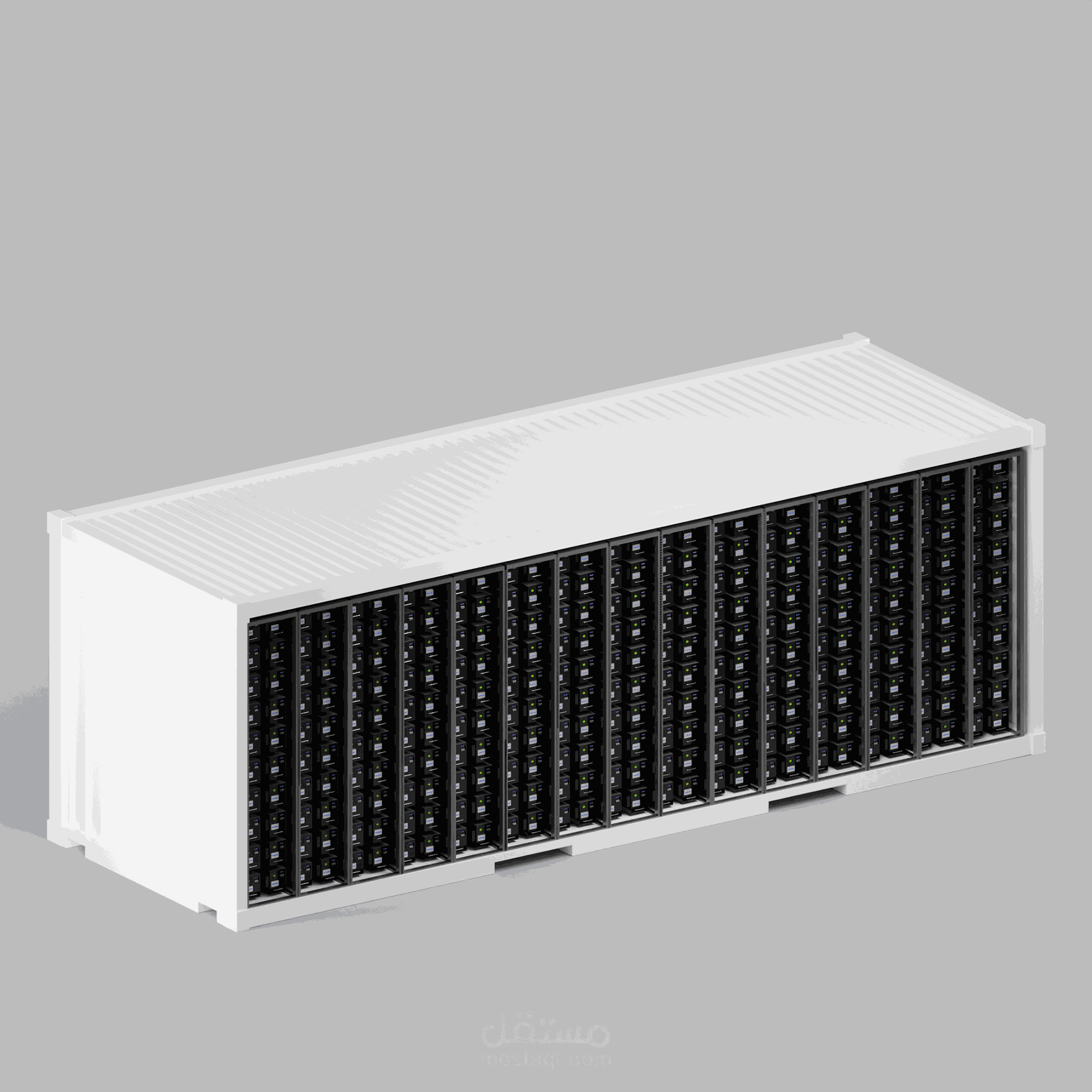 تصميم ثلاثي الأبعاد لنظام تخزين طاقة متكامل يعتمد على توربينات الرياح مع وحدات بطاريات عالية السعة.