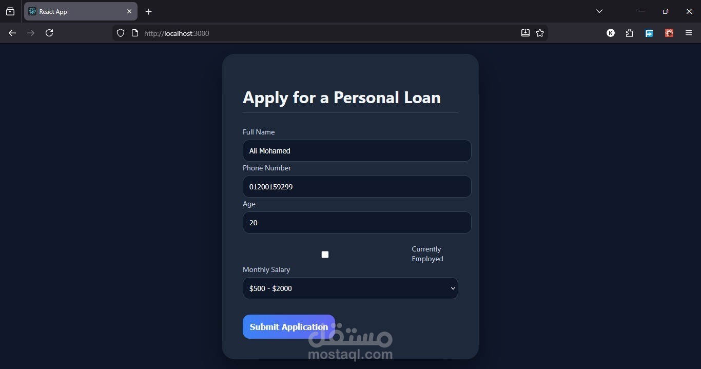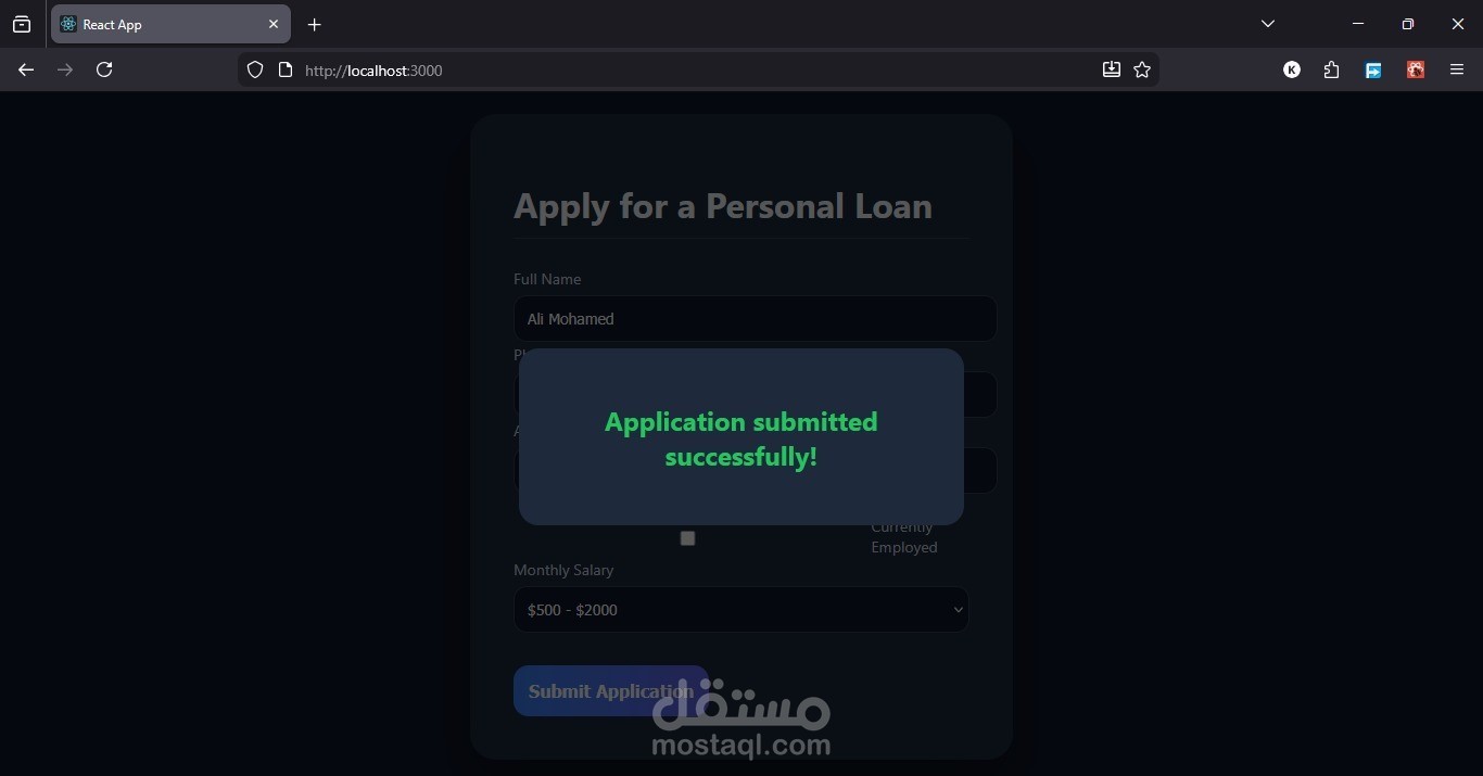 قمت بتصميم وتطوير واجهة طلب قرض (Loan Application) باستخدام React، مع التركيز على تقديم تجربة مستخدم حديثة وسلسة.