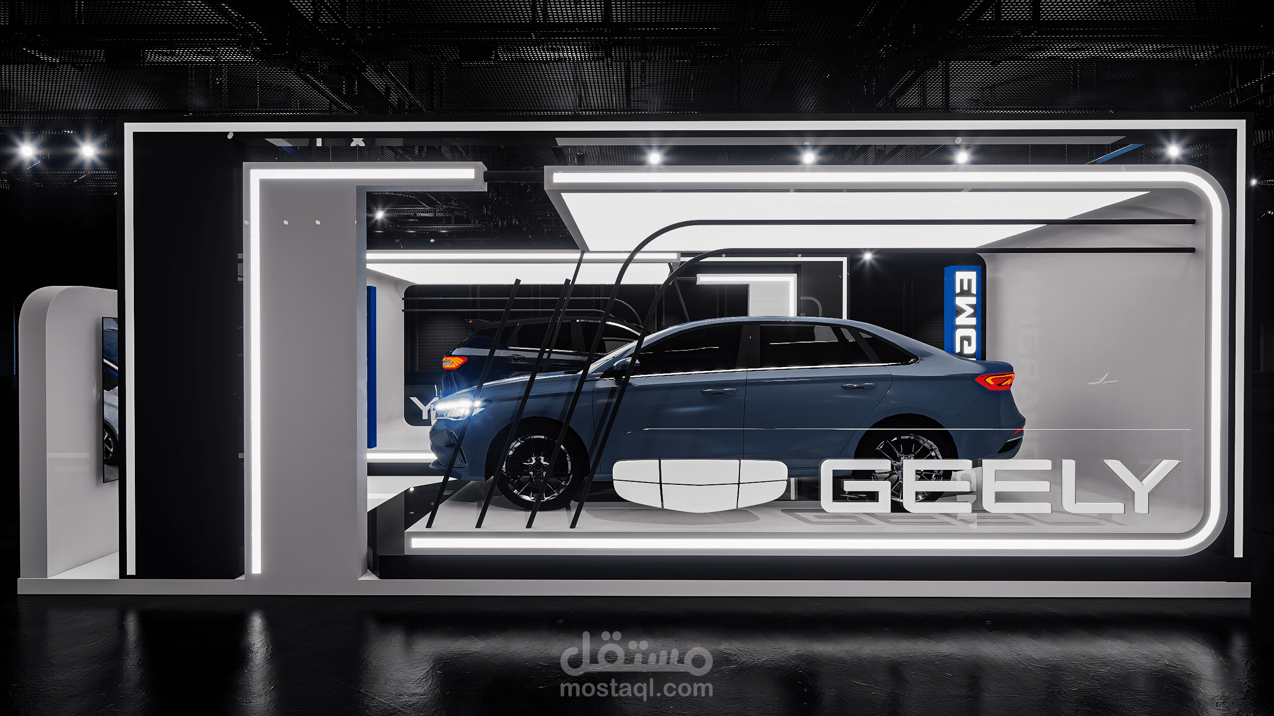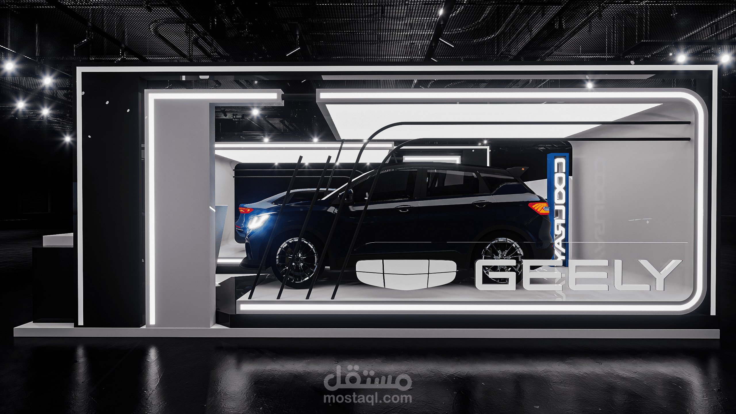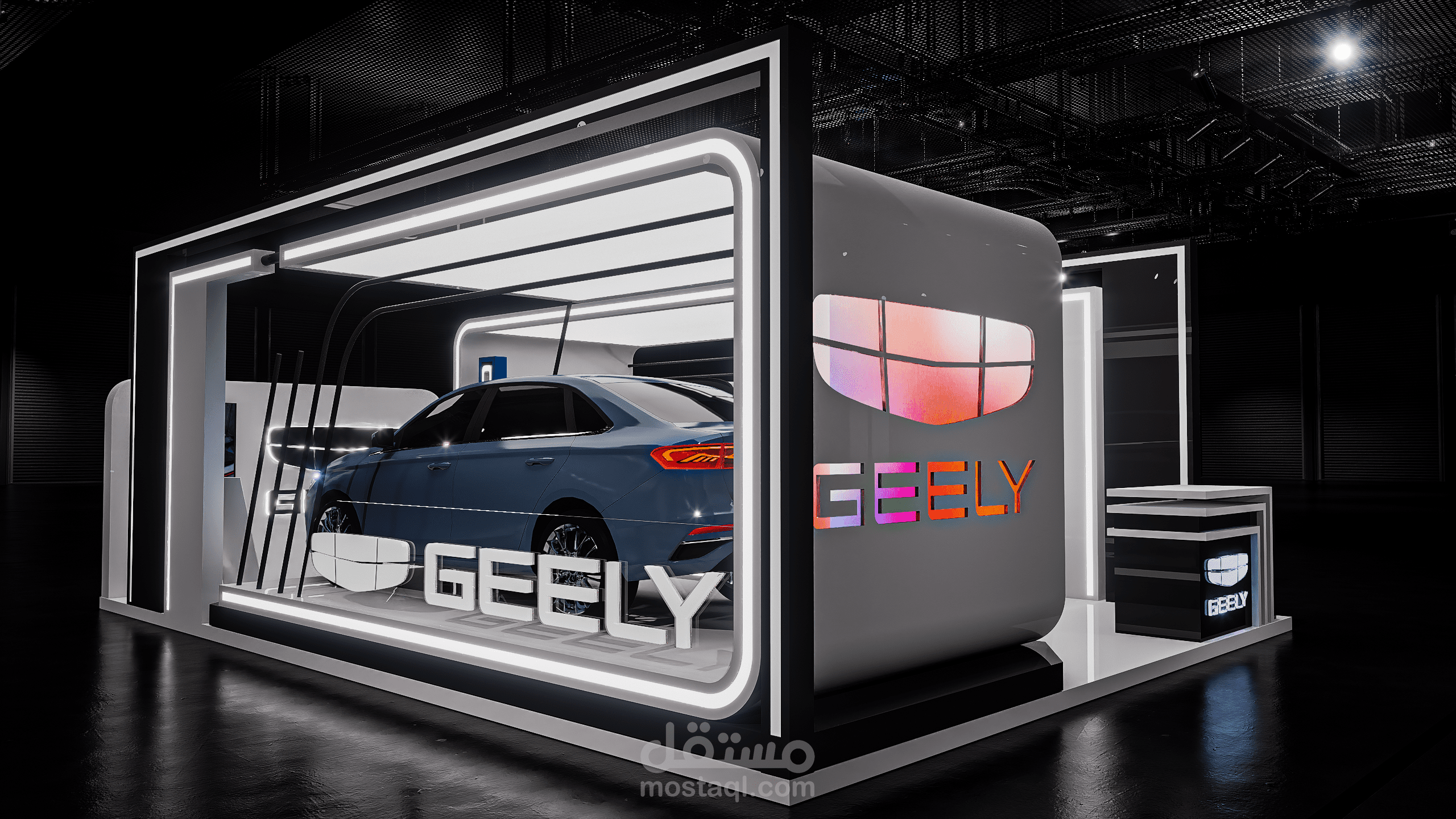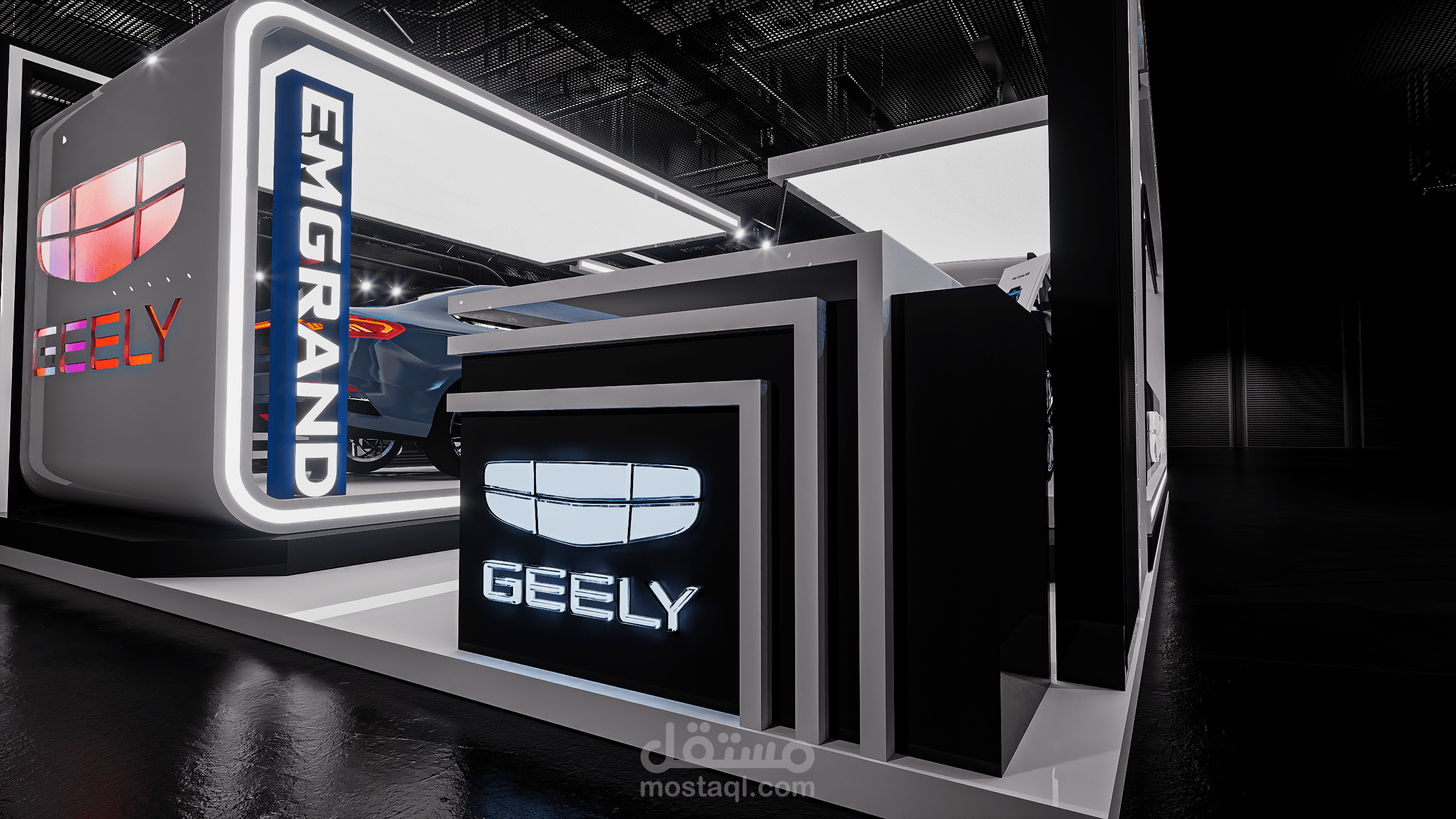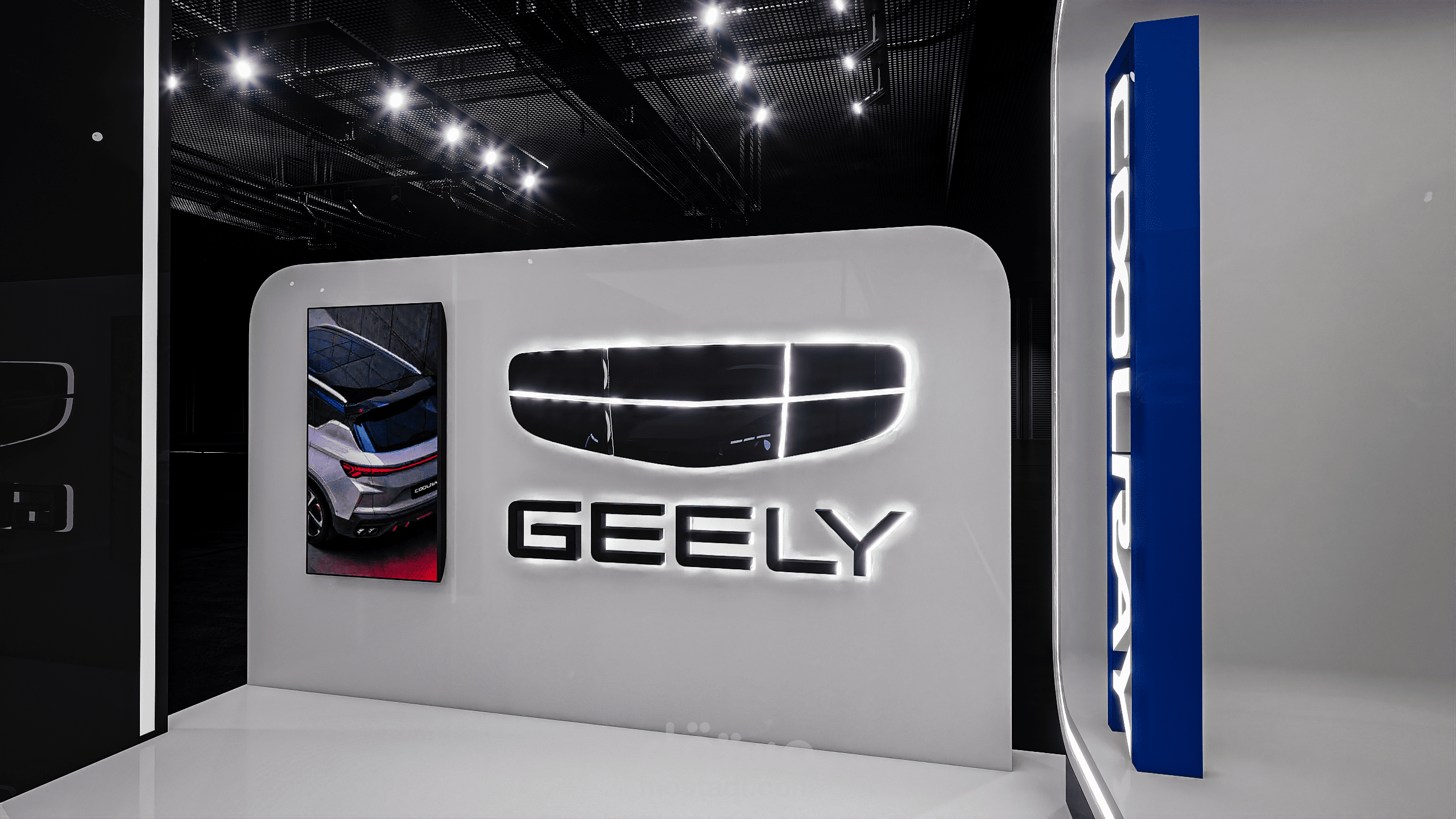 A modern exhibition booth designed for Geely, featuring clean geometric forms, illuminated frames, and a futuristic atmosphere to highlight the vehicle and enhance the brand presence.