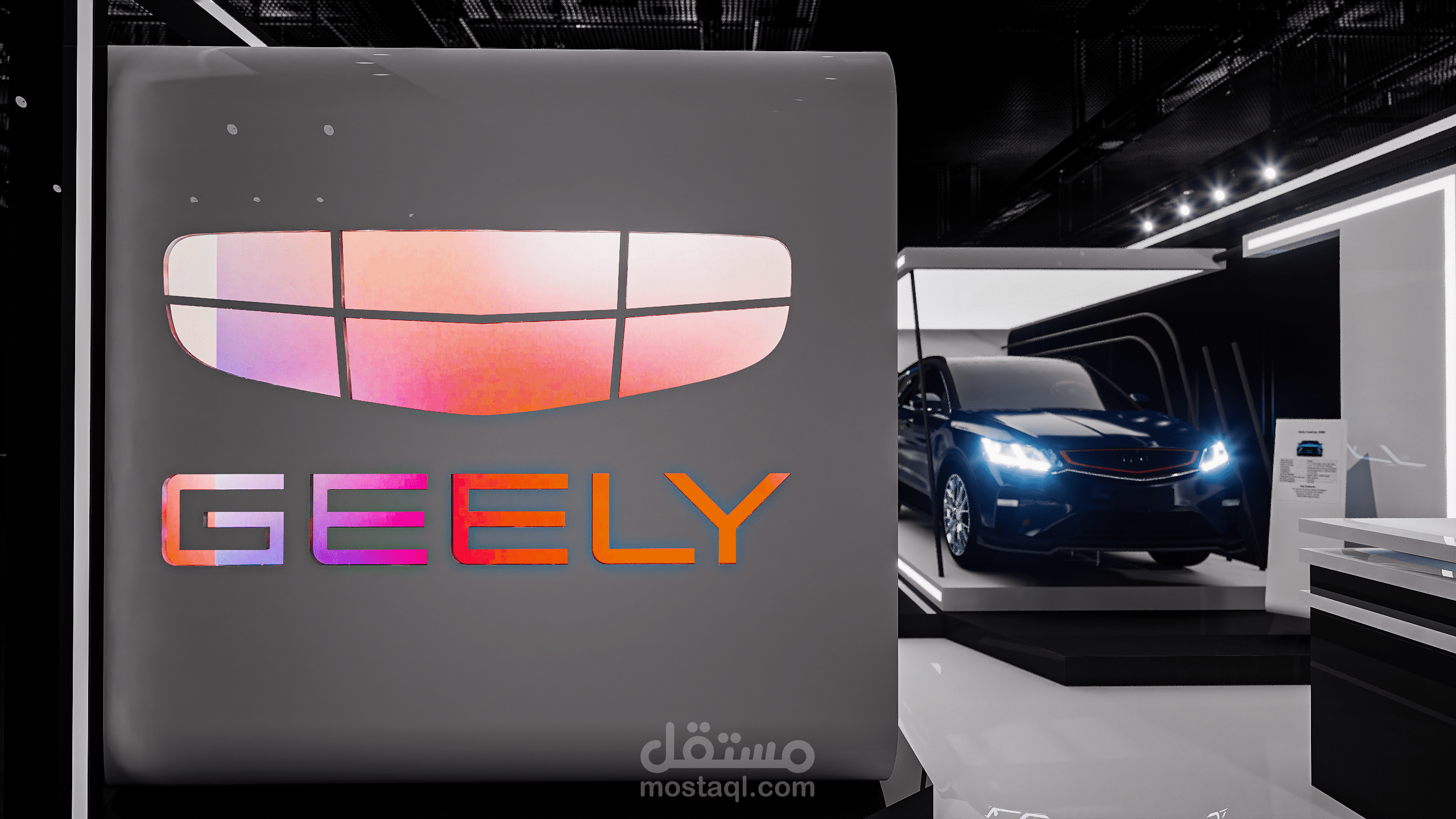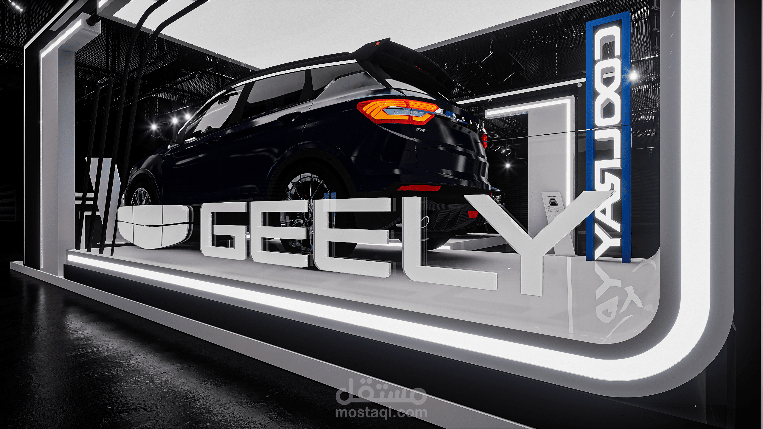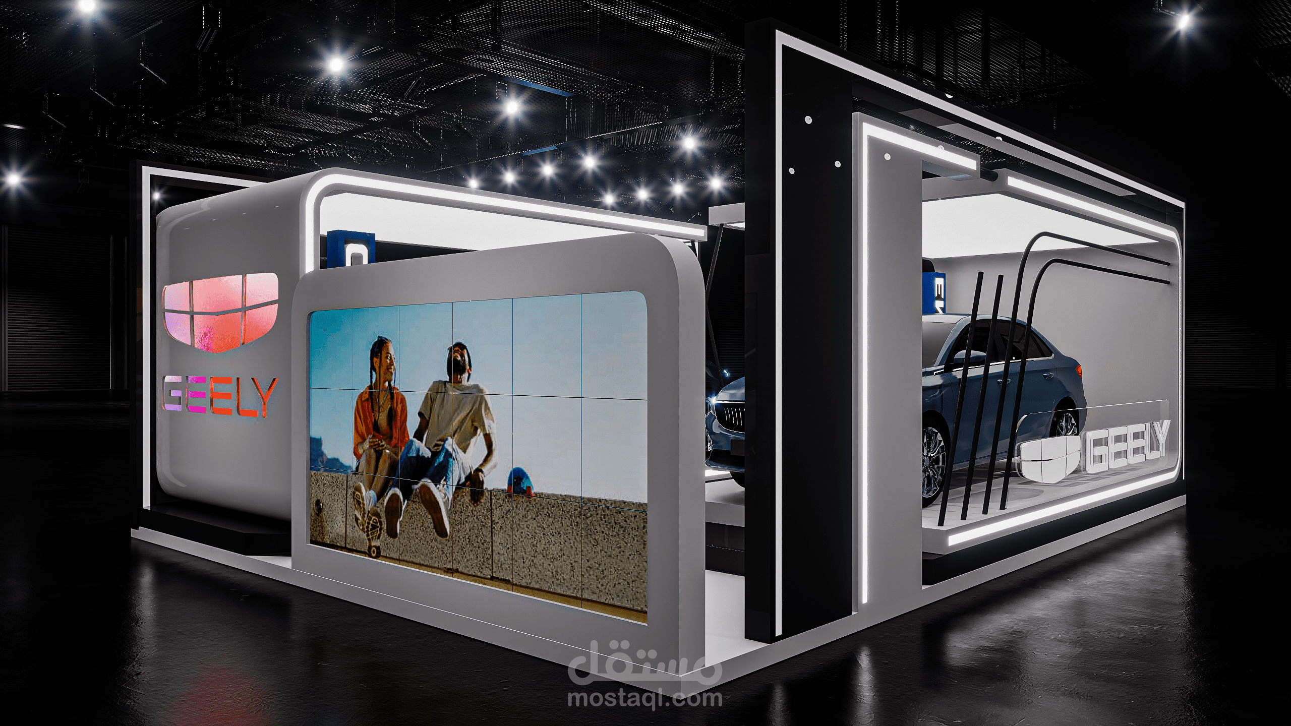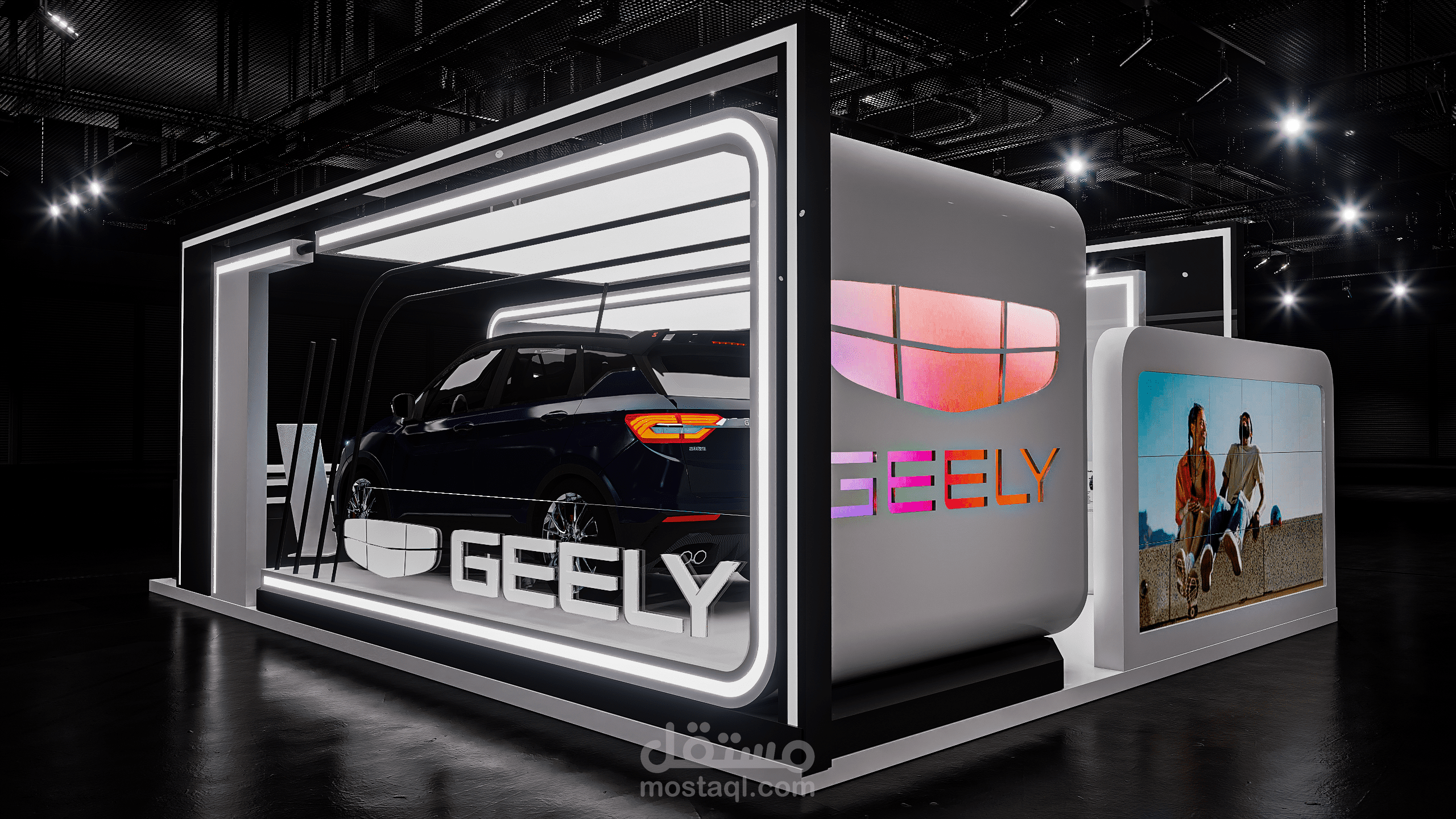 A modern exhibition booth designed for Geely, featuring clean geometric forms, illuminated frames, and a futuristic atmosphere to highlight the vehicle and enhance the brand presence.