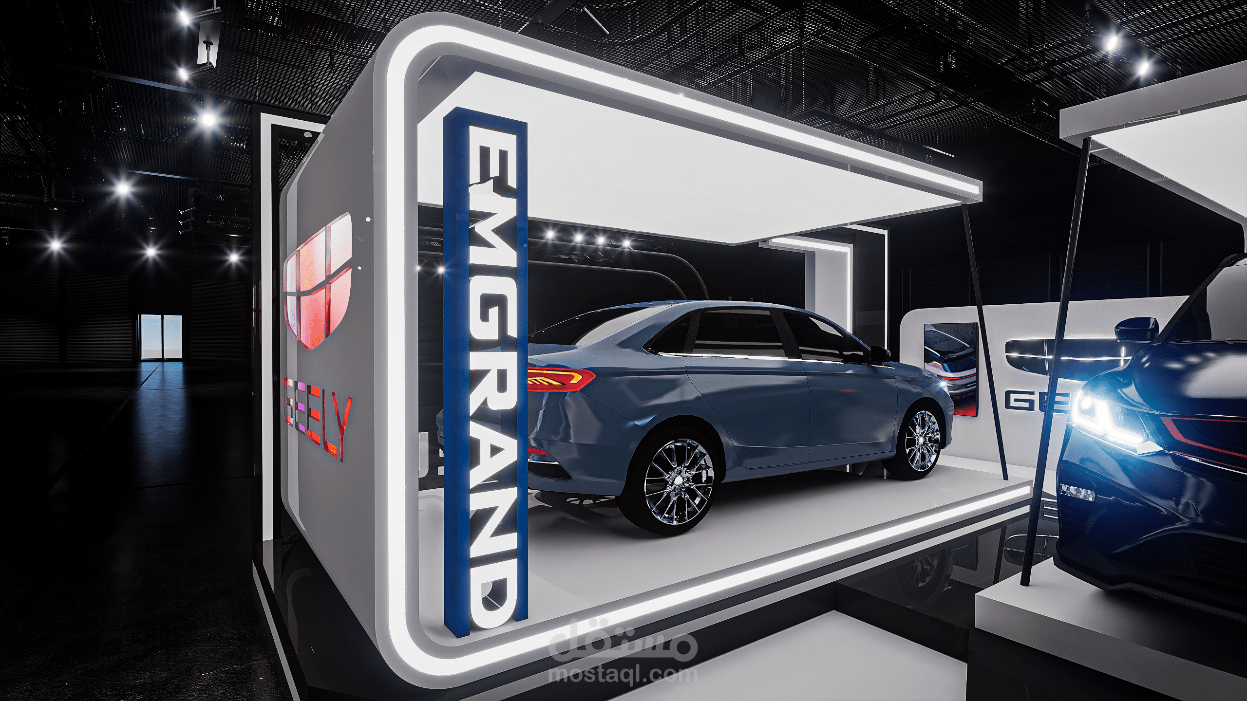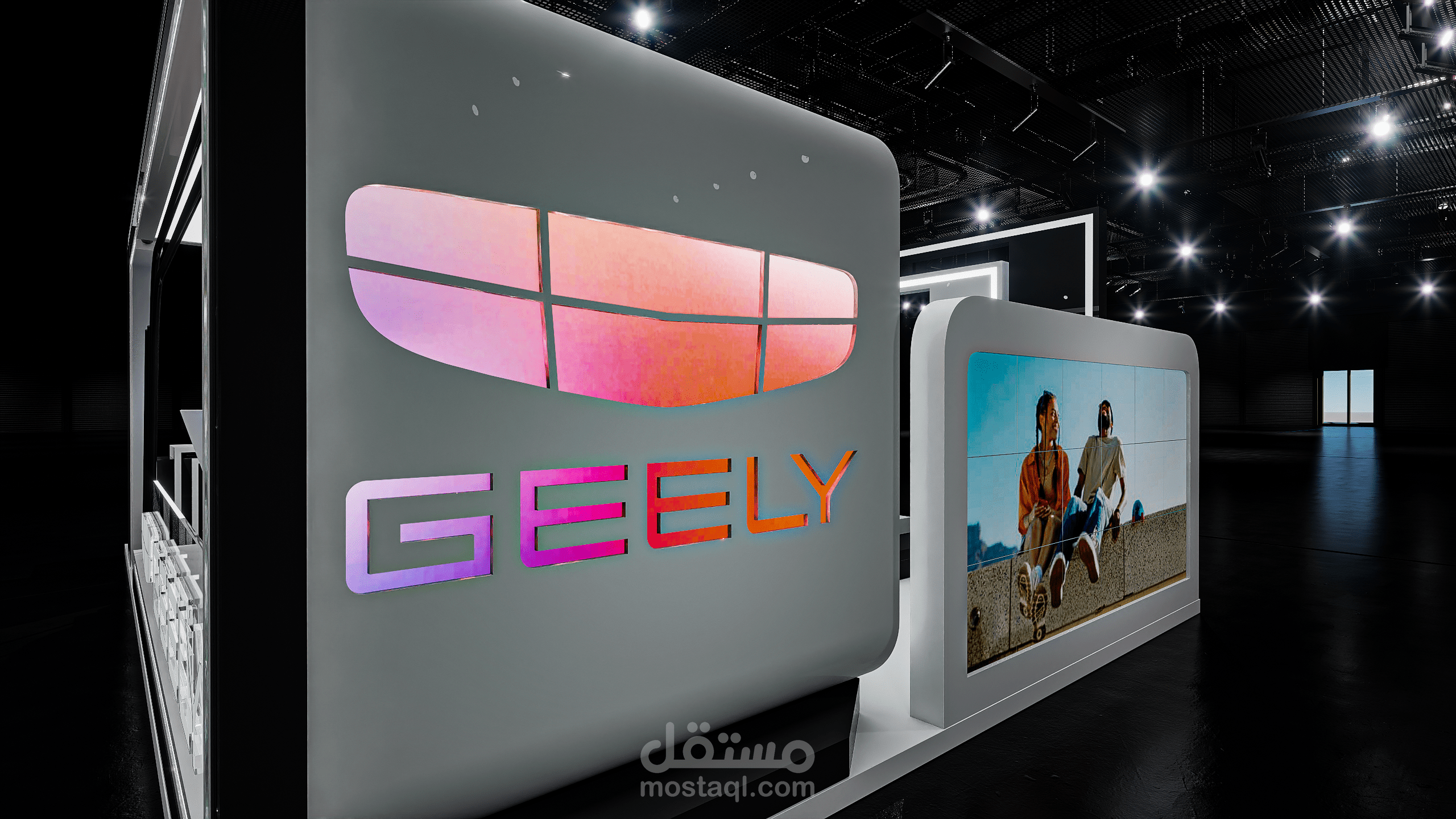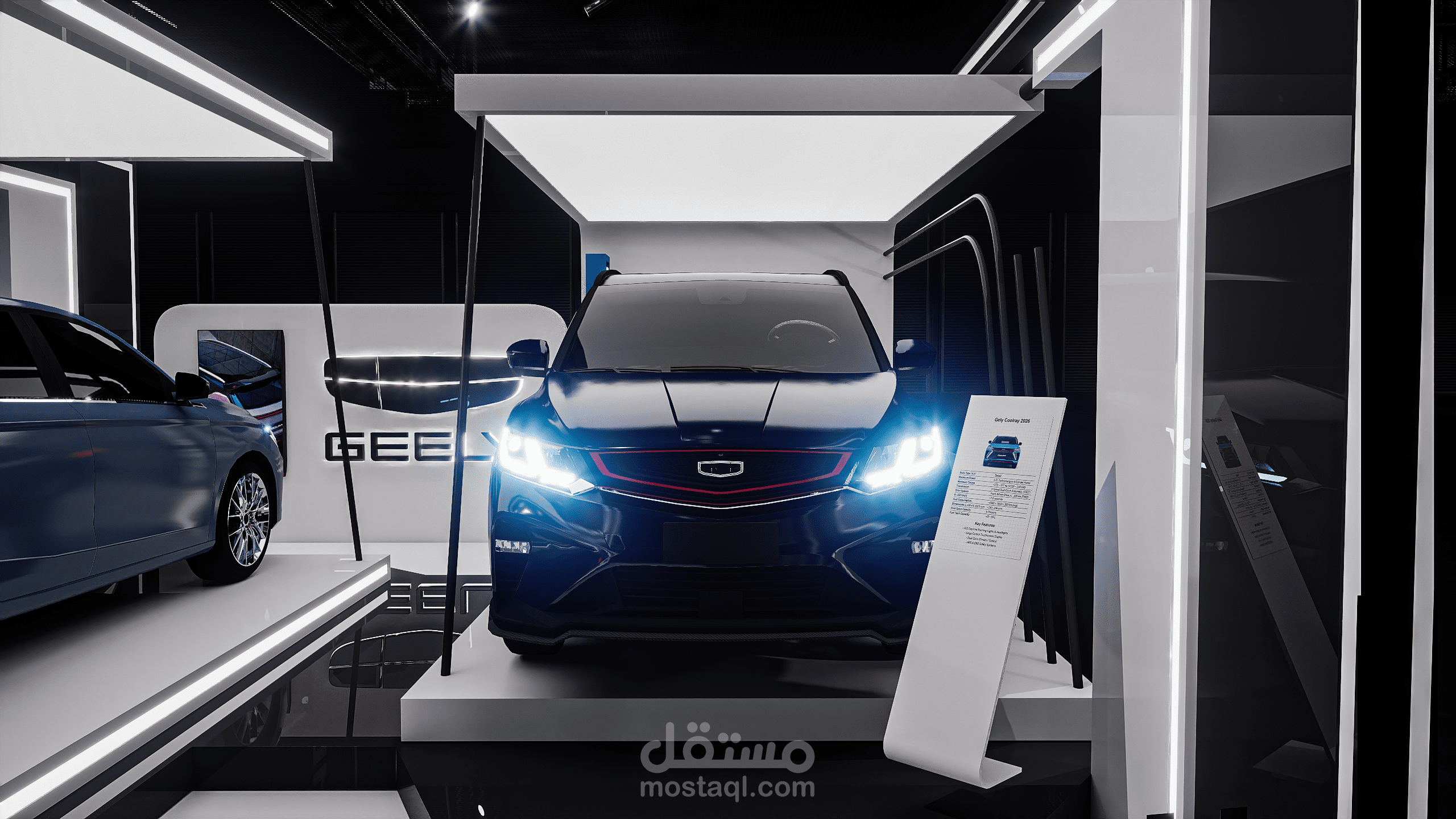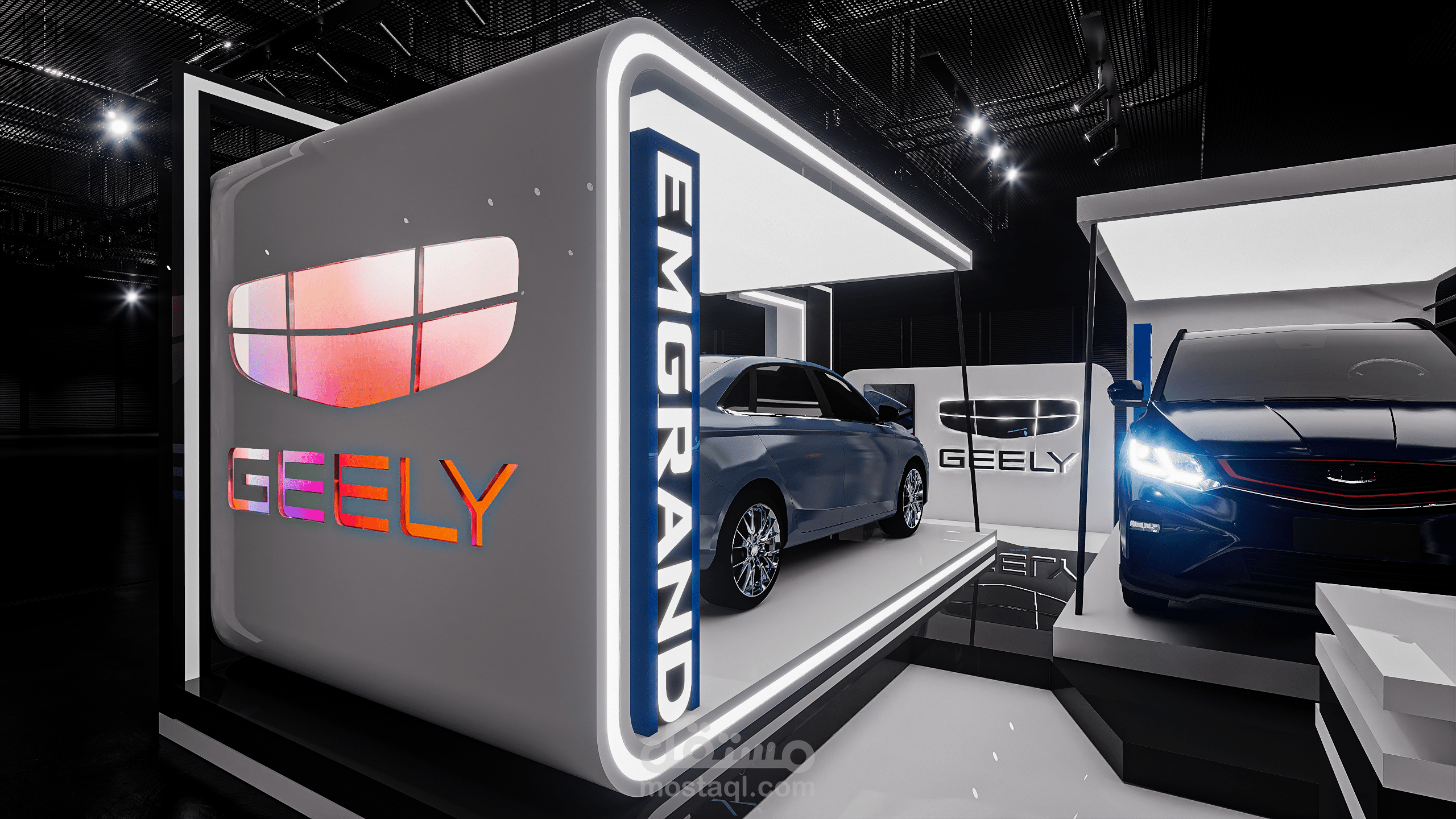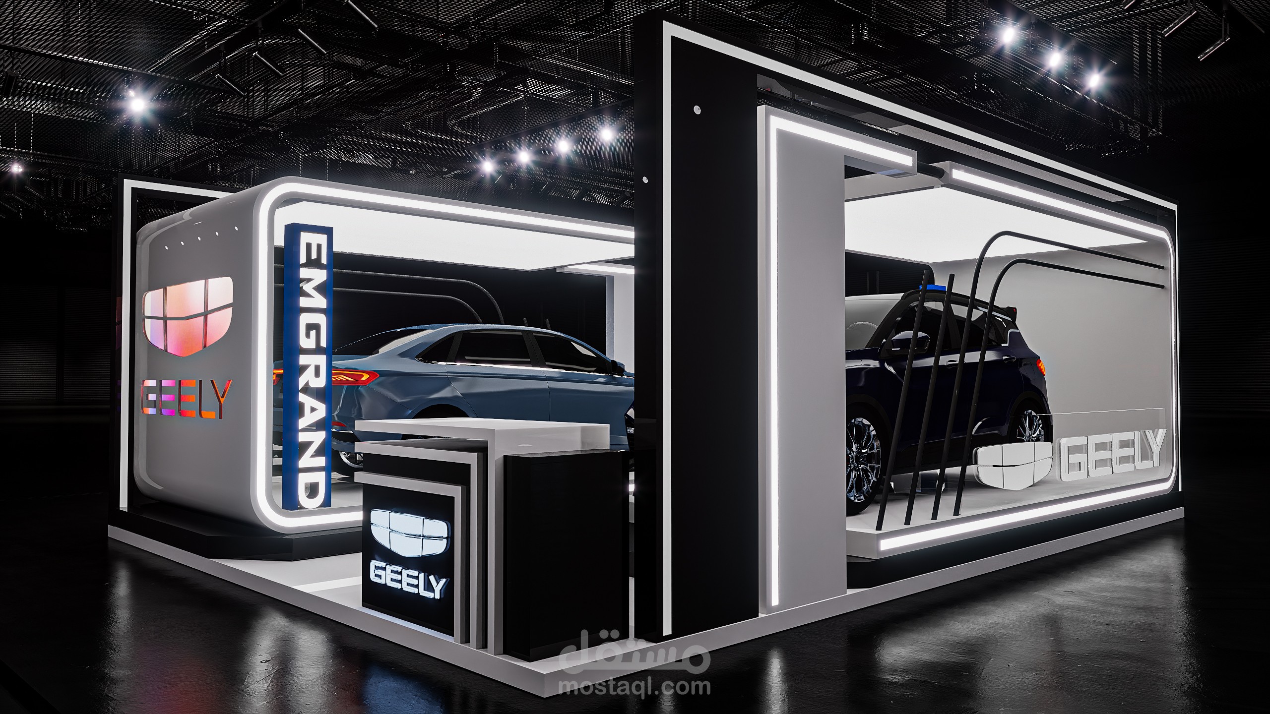 A modern exhibition booth designed for Geely, featuring clean geometric forms, illuminated frames, and a futuristic atmosphere to highlight the vehicle and enhance the brand presence.