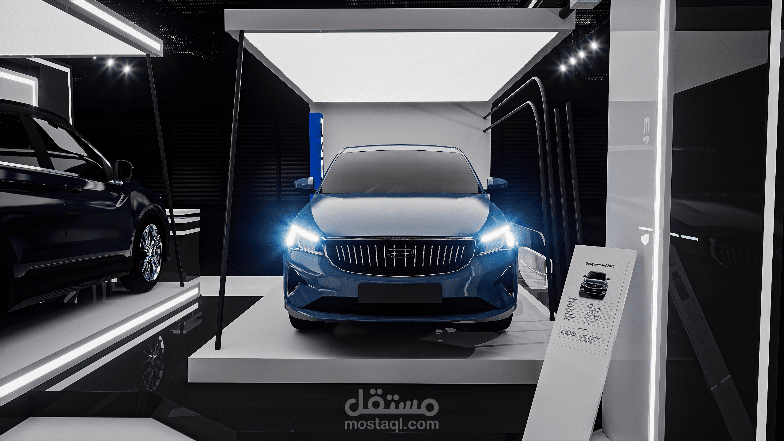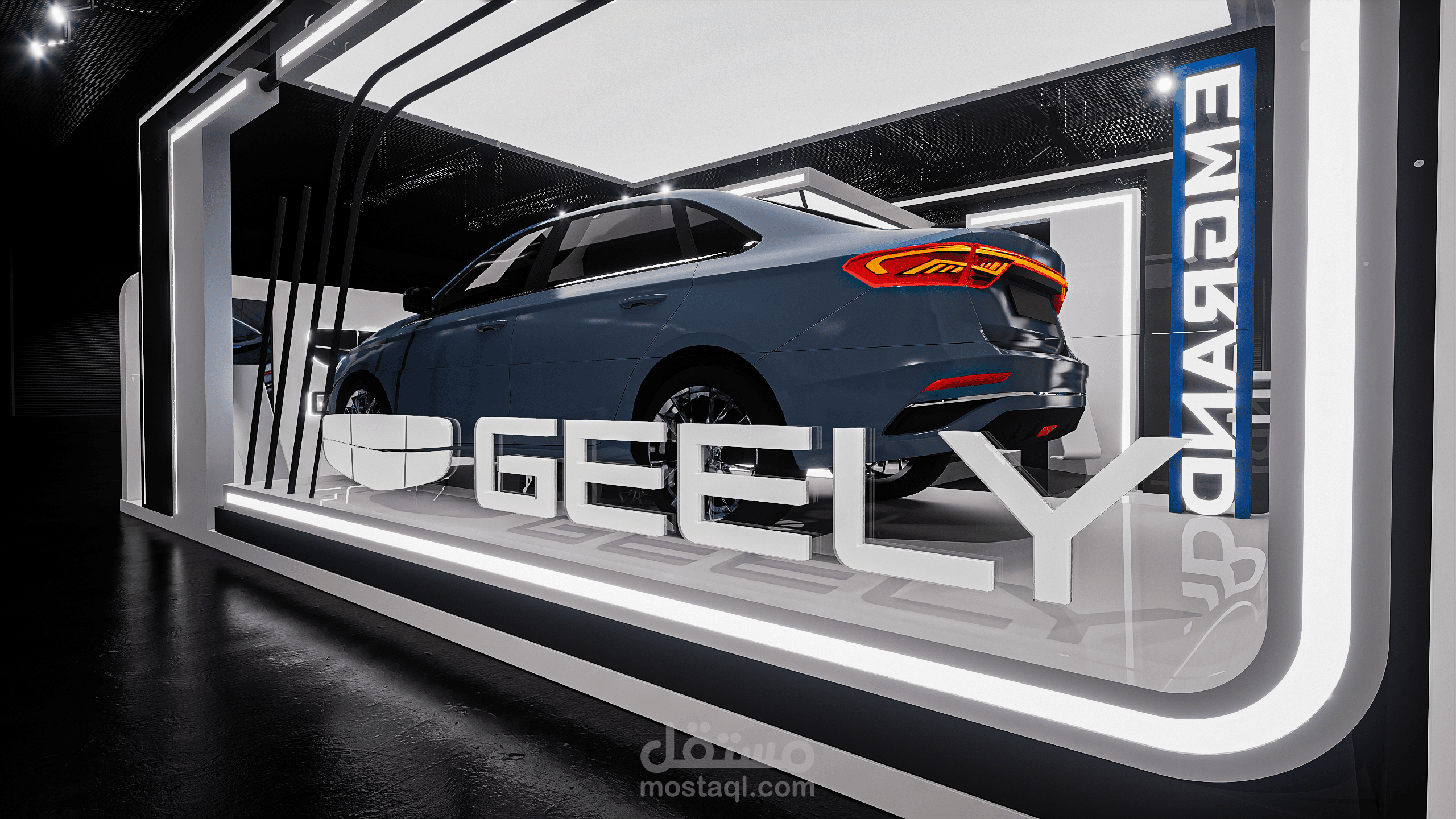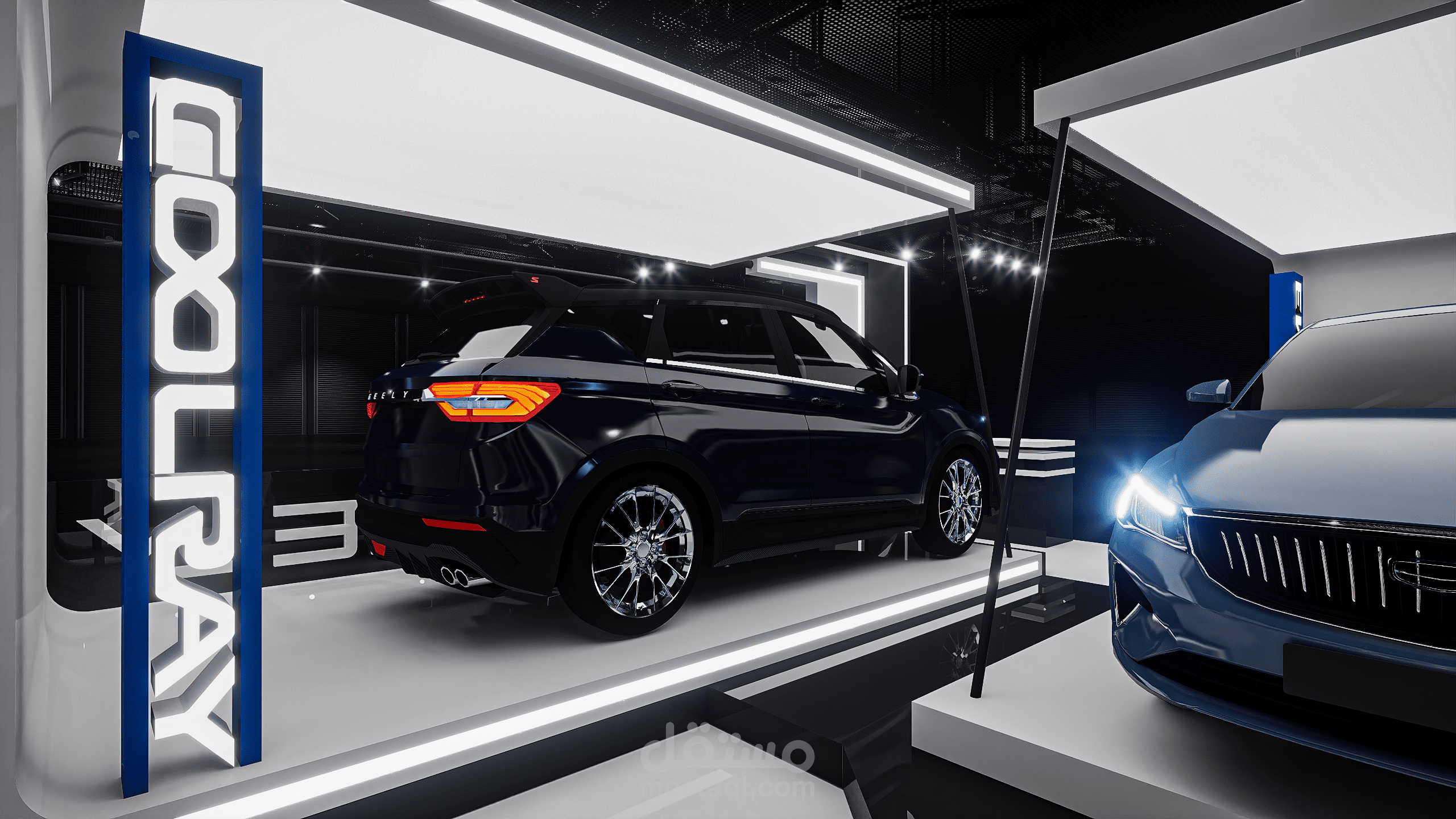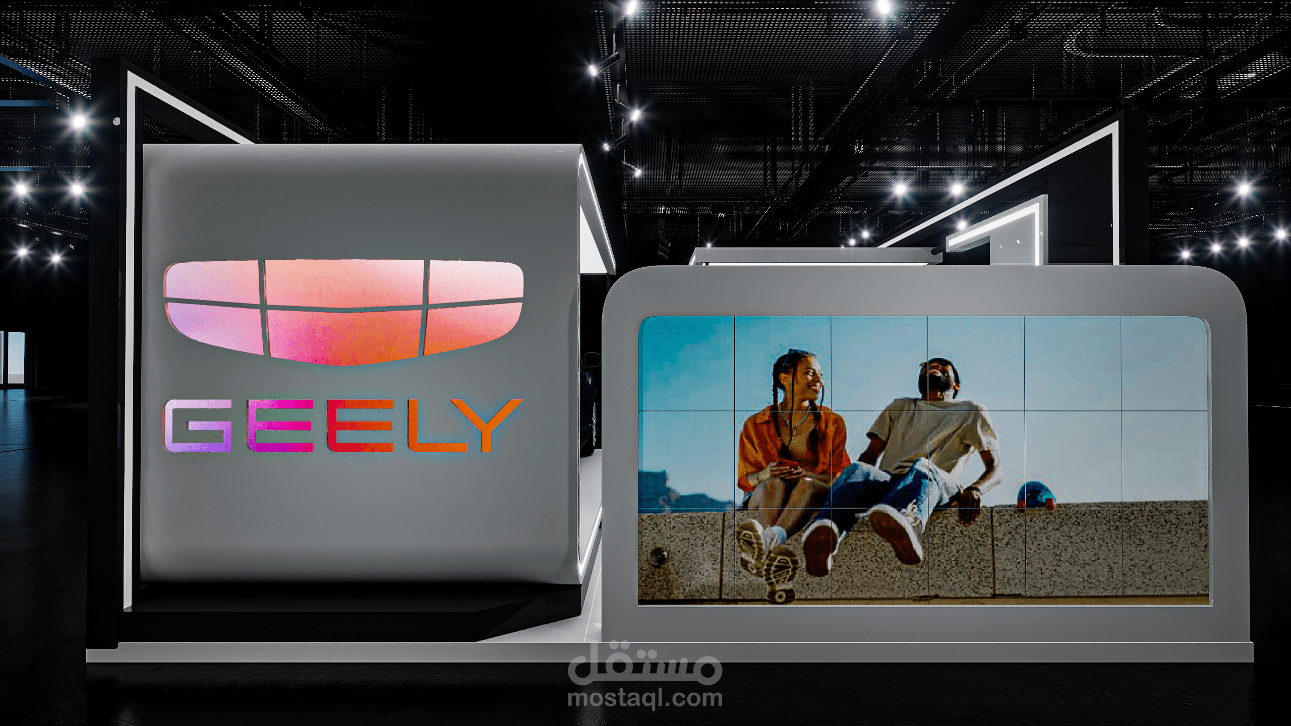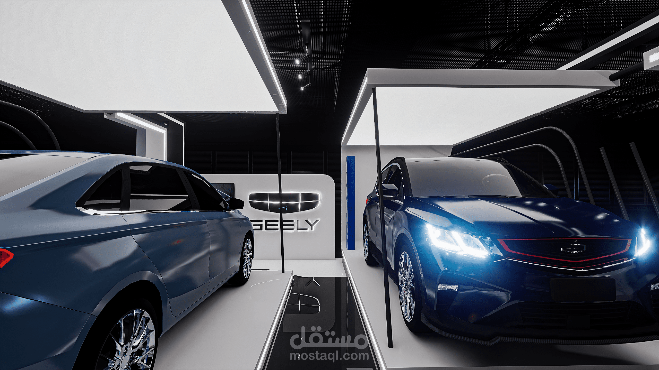 A modern exhibition booth designed for Geely, featuring clean geometric forms, illuminated frames, and a futuristic atmosphere to highlight the vehicle and enhance the brand presence.