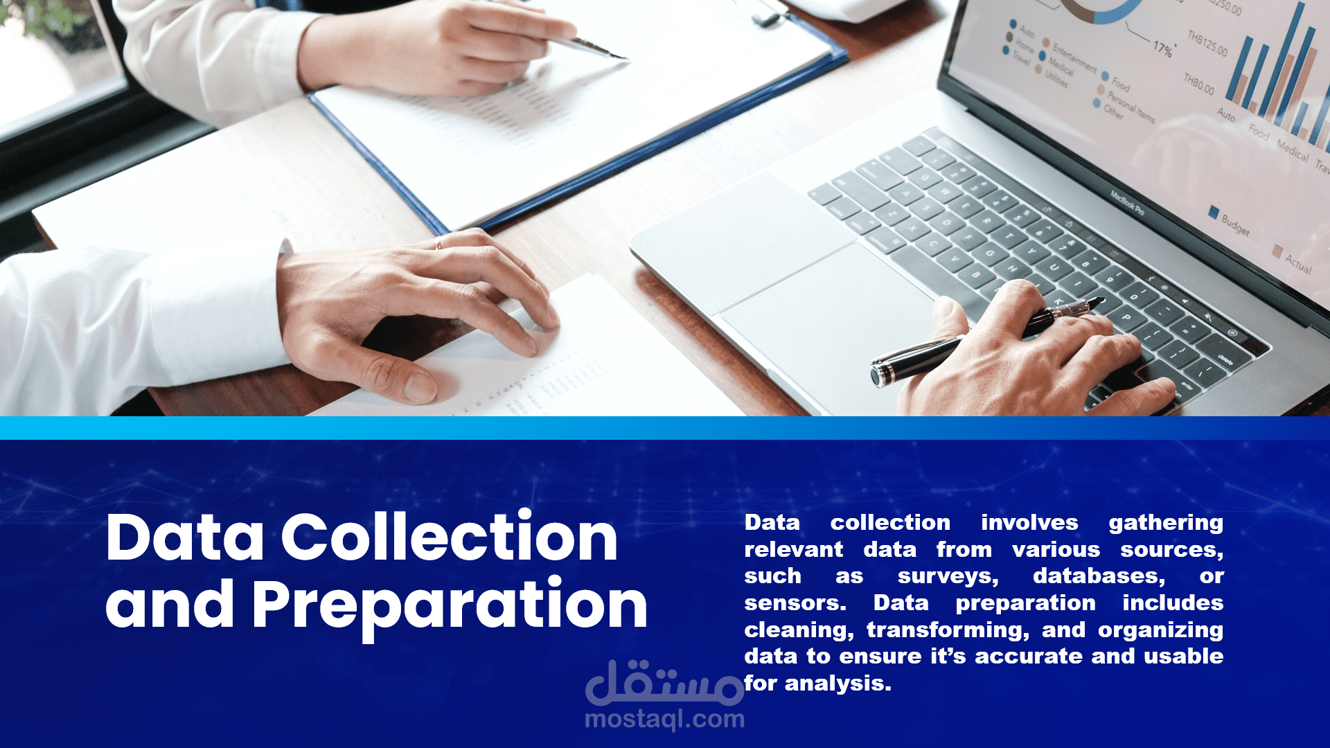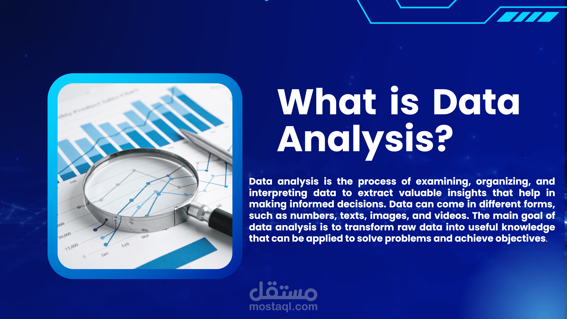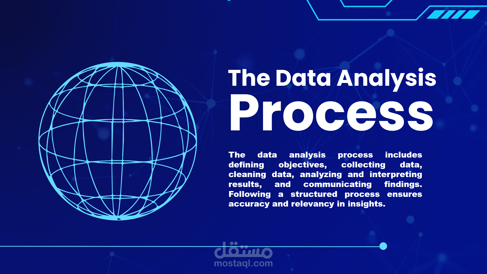 العرض يركز على تحويل البيانات الخام إلى رؤى واضحة وقابلة للتنفيذ، مع التركيز على أفضل الممارسات في جمع البيانات، تنظيفها، تحليلها، ورواية القصة البيانية (Data Storytelling).