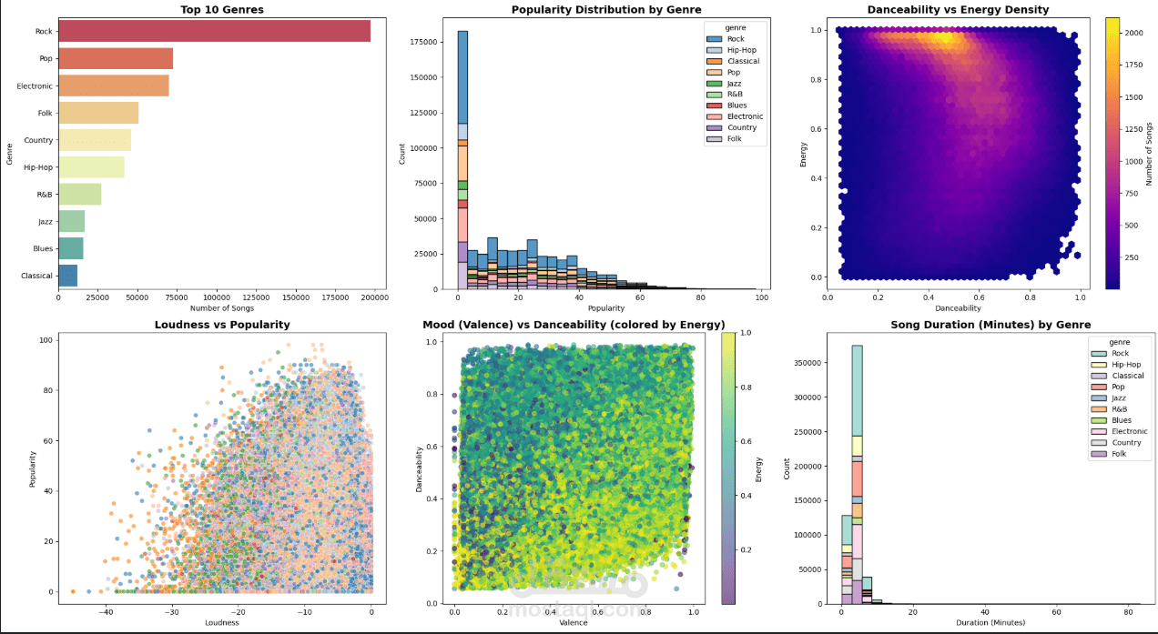 قمت بالعمل على تحليل مجموعة بيانات ضخمة تضم أكثر من 550 ألف أغنية من Spotify، تحتوي على خصائص صوتية (Audio Features)، كلمات الأغاني (Lyrics)، والتصنيفات (Genres)، بهدف استخراج رؤى قيمة وفهم أنماط الموسيقى.