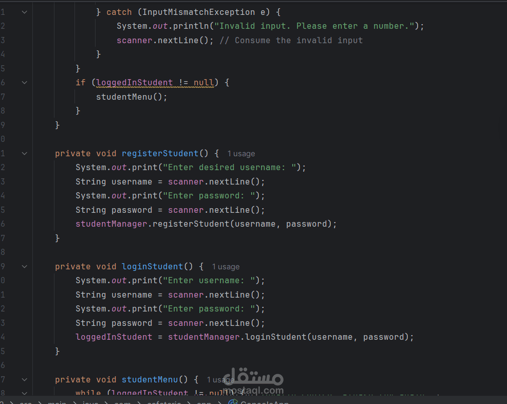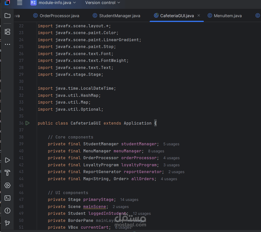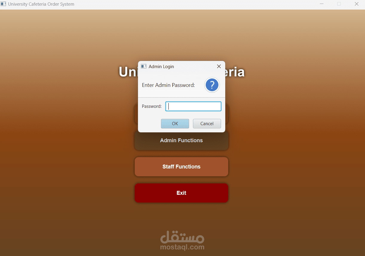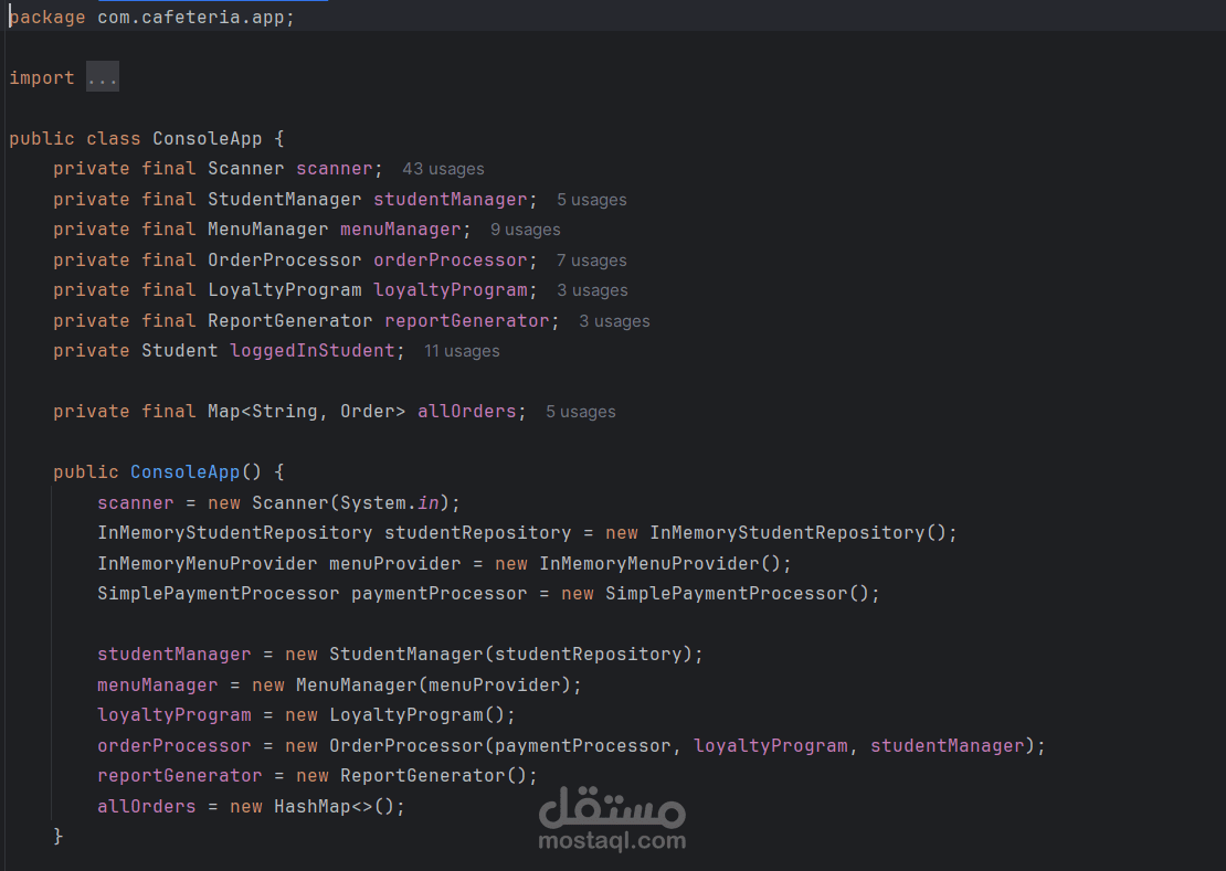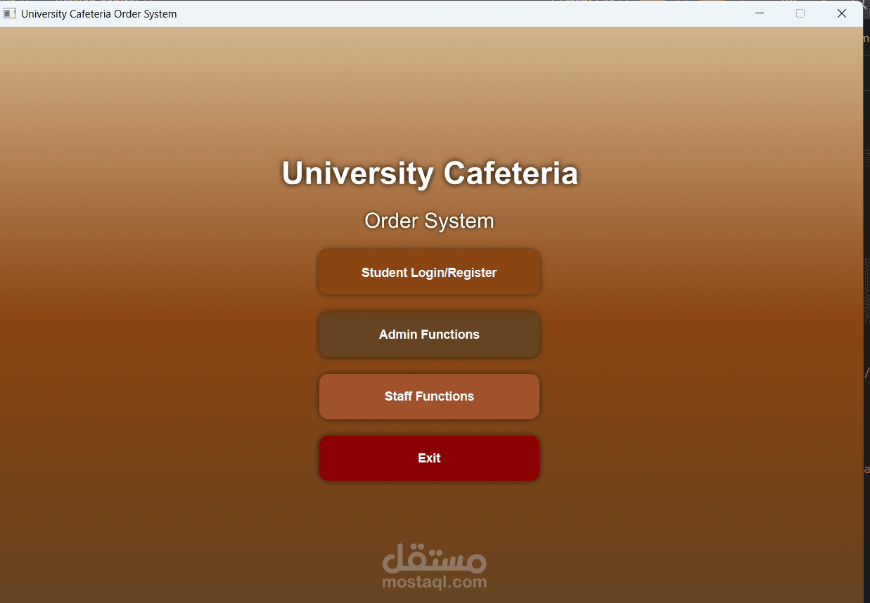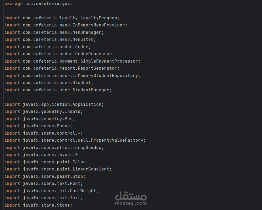 يسعدني عرض هذا المشروع ضمن معرض أعمالي على موقع مستقل، حيث قمت بتطوير نظام إدارة كافيتريا للجامعة باستخدام لغة Java وتطبيق مبادئ البرمجة كائنية التوجه (OOP).