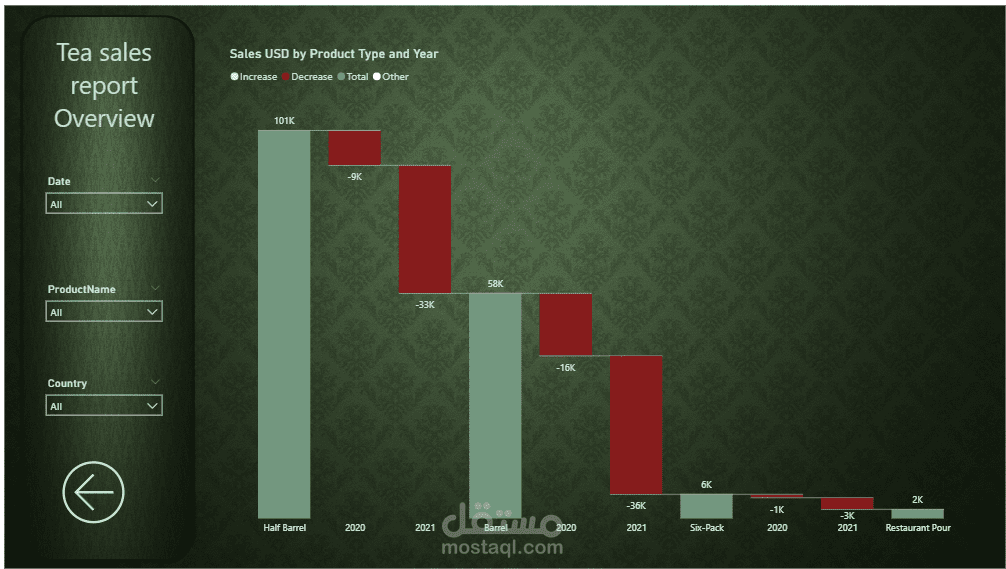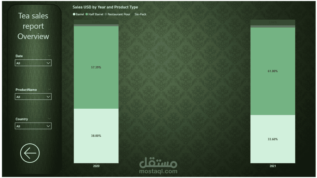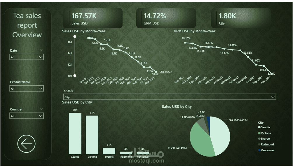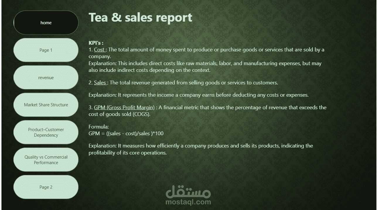 تعرض هذه الصفحة نظرة عامة شاملة على أداء مبيعات الشاي من خلال مجموعة من المؤشرات والرسوم البيانية التفاعلية المصممة باستخدام Power BI.