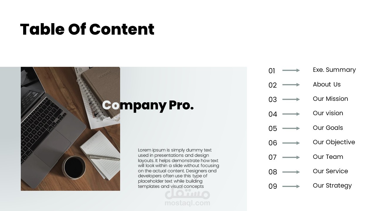 تم تصميم قالب Company Profile ده علشان يساعدك تعرض أفكارك بشكل واضح، منظم، وبـ تأثير بصري قوي يخلي أي حد قدامك يقتنع ويكمل معاك للآخر.