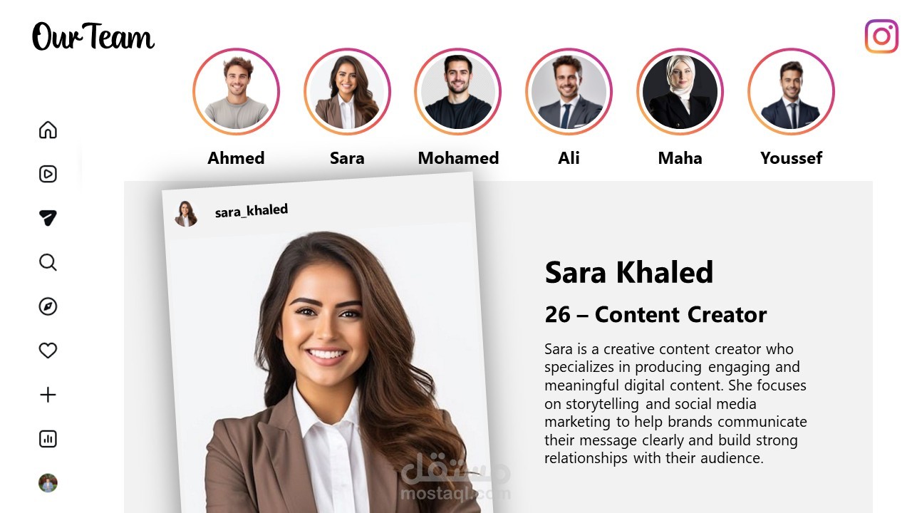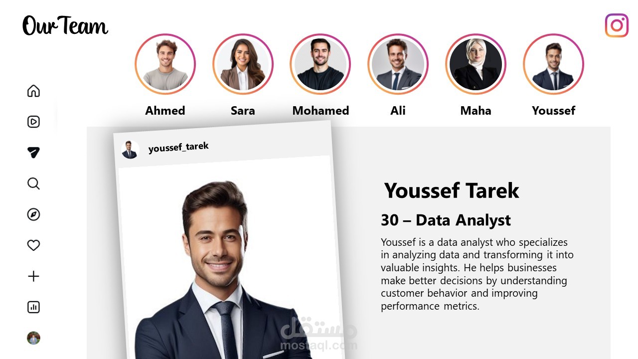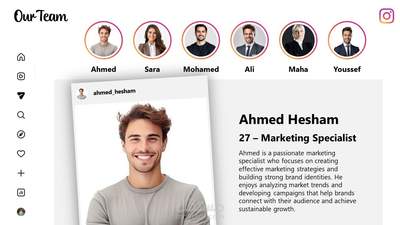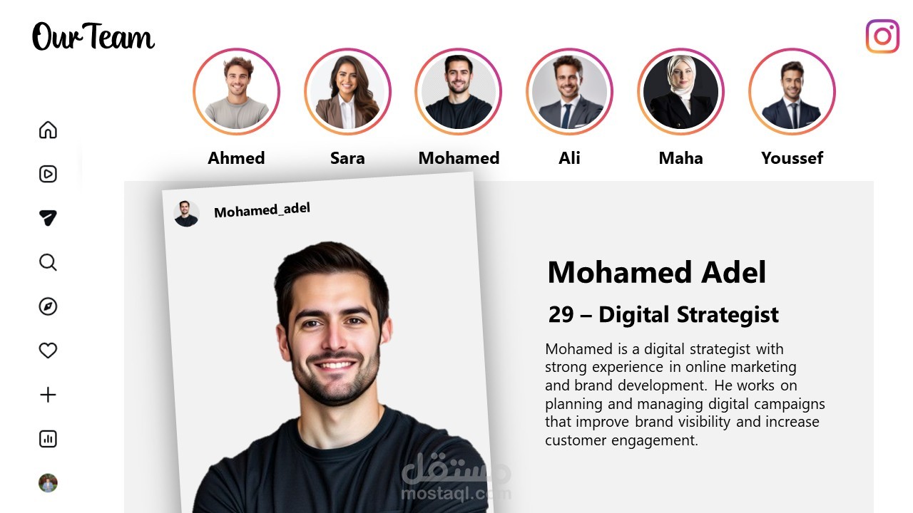 هذا المشروع هو تصميم واجهة مستخدم (UI Design) مستوحى من تطبيق Instagram، تم تنفيذه بأسلوب عصري واحترافي يجمع بين البساطة وسهولة الاستخدام مع لمسة إبداعية واضحة.