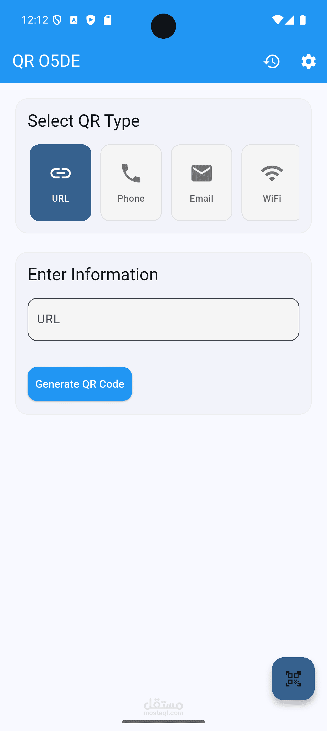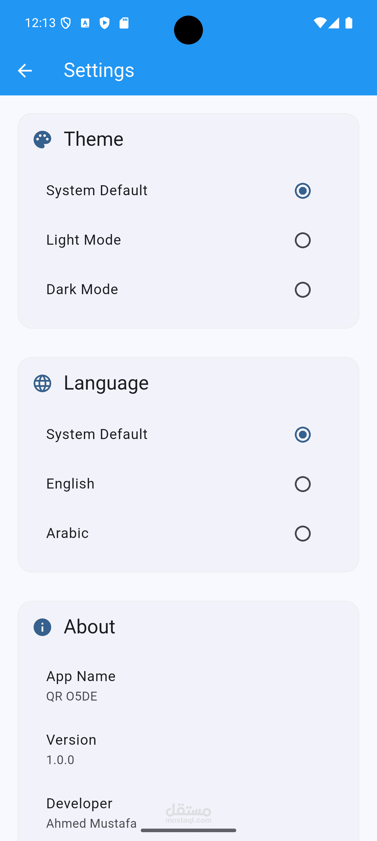 QRo5de is a Flutter-based mobile app that allows users to generate and scan QR codes easily and efficiently. The app features a modern, responsive design, smooth performance, dark/light theme support, and automatic language detection based on the device system.