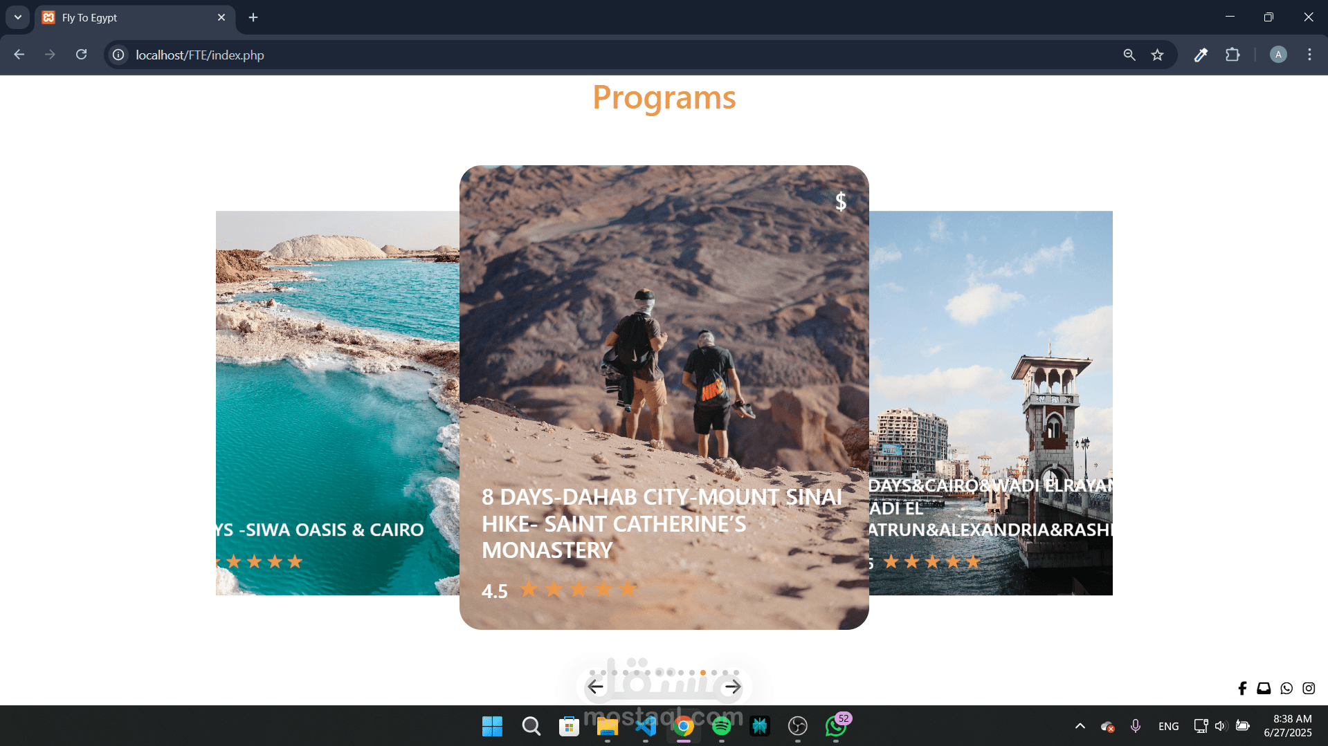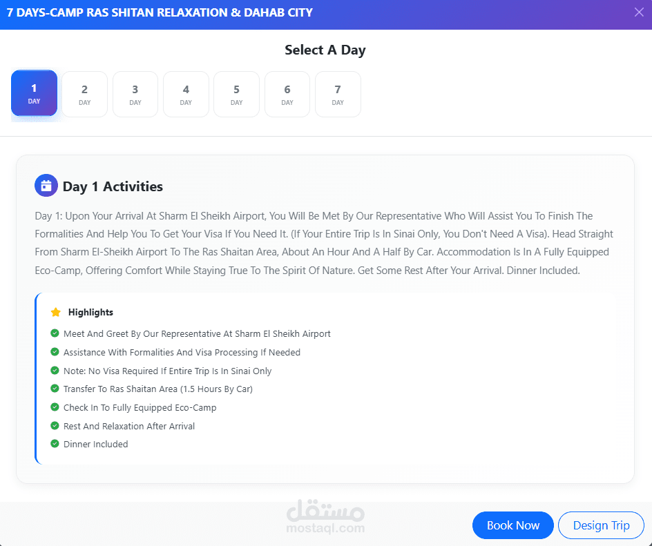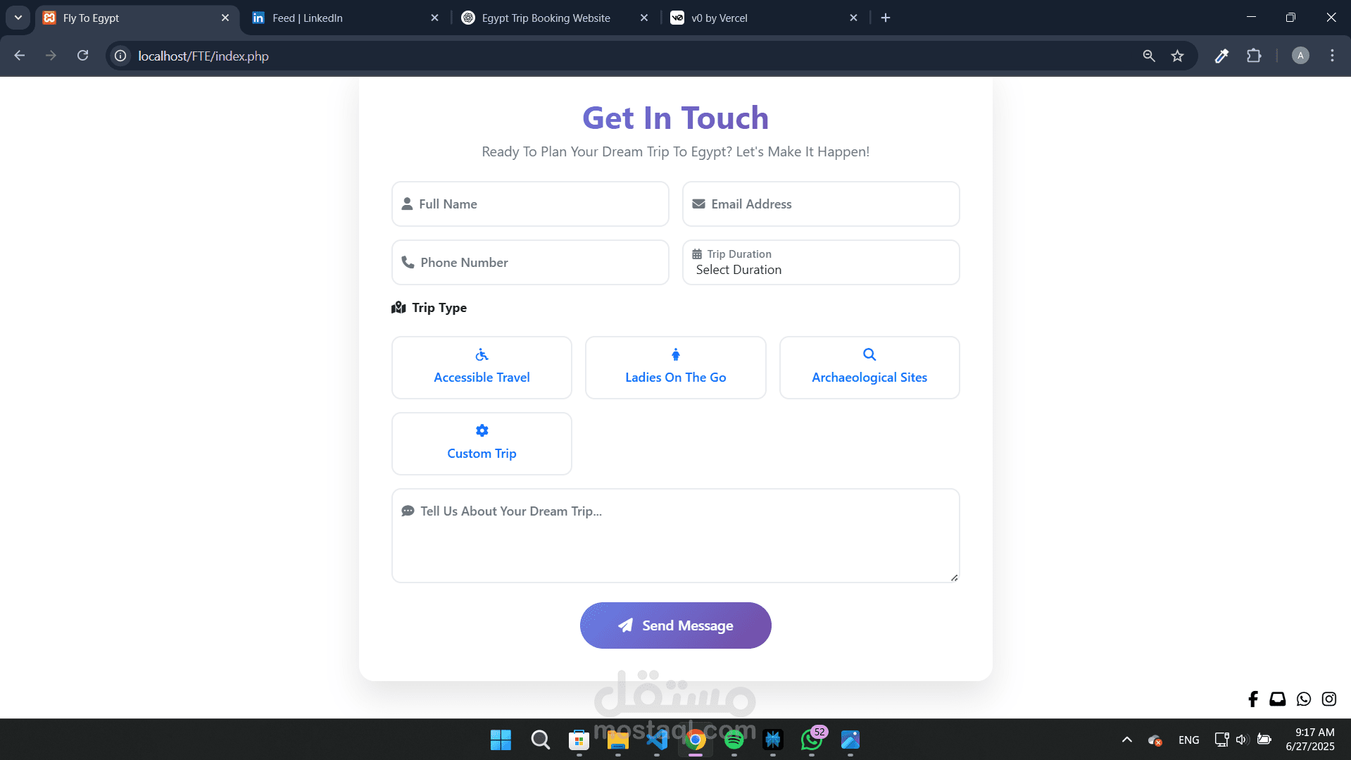 Trip booking website for Egypt that offers both pre-designed travel packages and fully customizable trips based on the user’s preferred duration and interests. Includes specialized features such as women-only trips for safer travel experiences and accessibility-focused options for travelers with disabilities. Built using Laravel (PHP) for backend functionality and Bootstrap for a responsive, user-friendly interface.