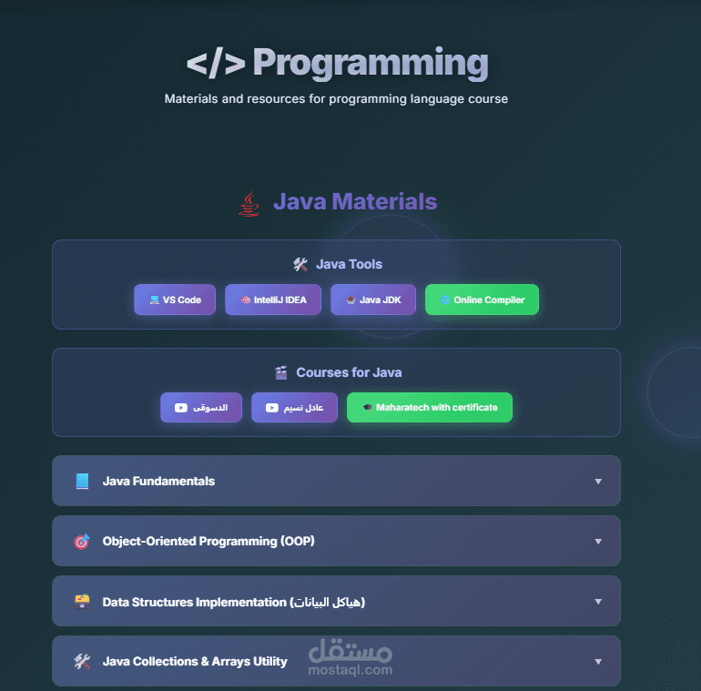 Learning Resources: A dedicated section featuring curated tools and courses for various programming languages.