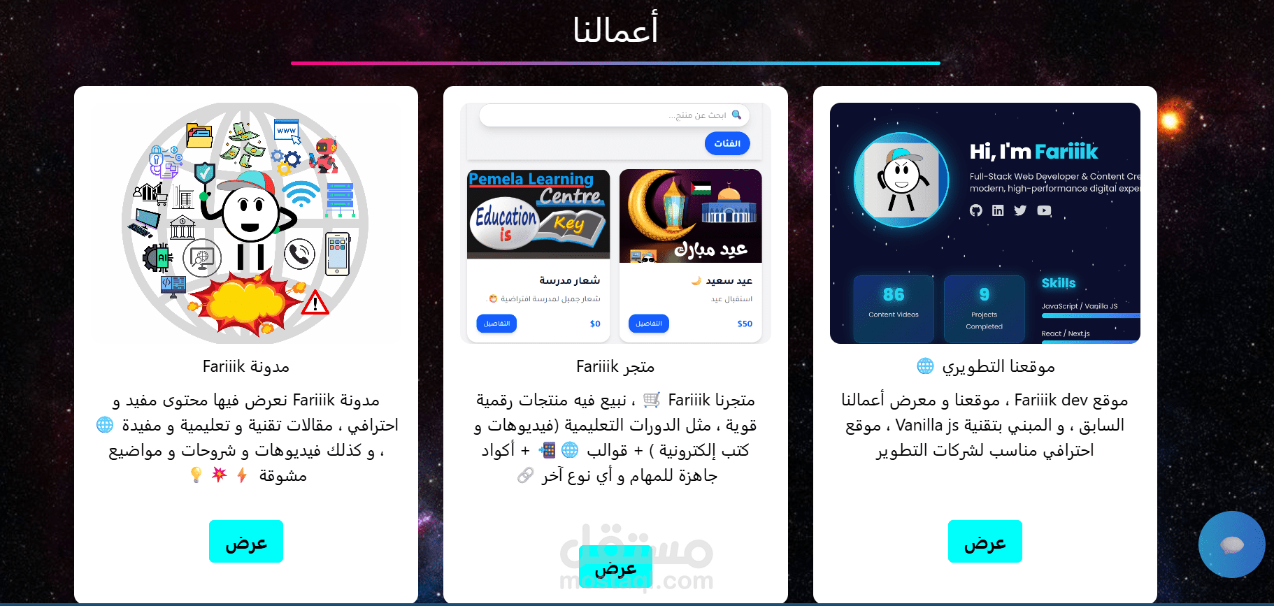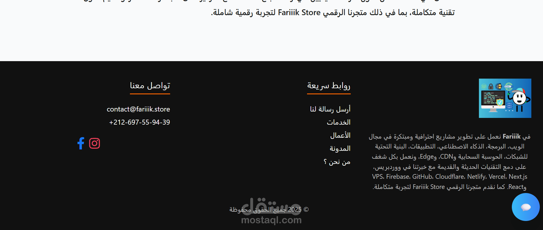 هذا موقع Fariiik company ، يعرض خدمات و أعمال تقدمها شركة Fariiik ، مبني بالكامل على ووردبريس wordpress بطريقة حديثة فيها قالب بطريقة حديثة أقرب ل headless cms ، حيث المشروع تم إنشاء له إضافة مخصصة و قالب مخصص فقط ، + تم استعمال cloudflare caching و zero trust و proxy كطرق لحماية الموقع .