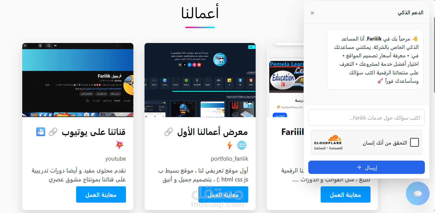 الموقع به صفحات رئيسية و شات مساعد ذكي و cloudflare turnstile مدمج في كل خانات ترسل api للسيرفر ..