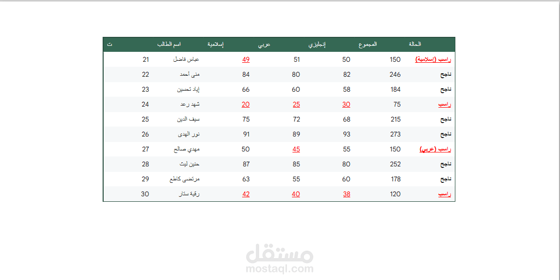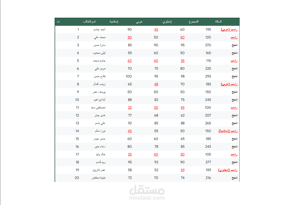 تنسيق شرطي ذكي: برمجة الجدول لتمييز درجات الرسوب تلقائياً باللون الأحمر مع إضافة ملاحظة نوع الرسوب (عربي، إسلامية، إلخ) لسهولة حصر الحالات الضعيفة.