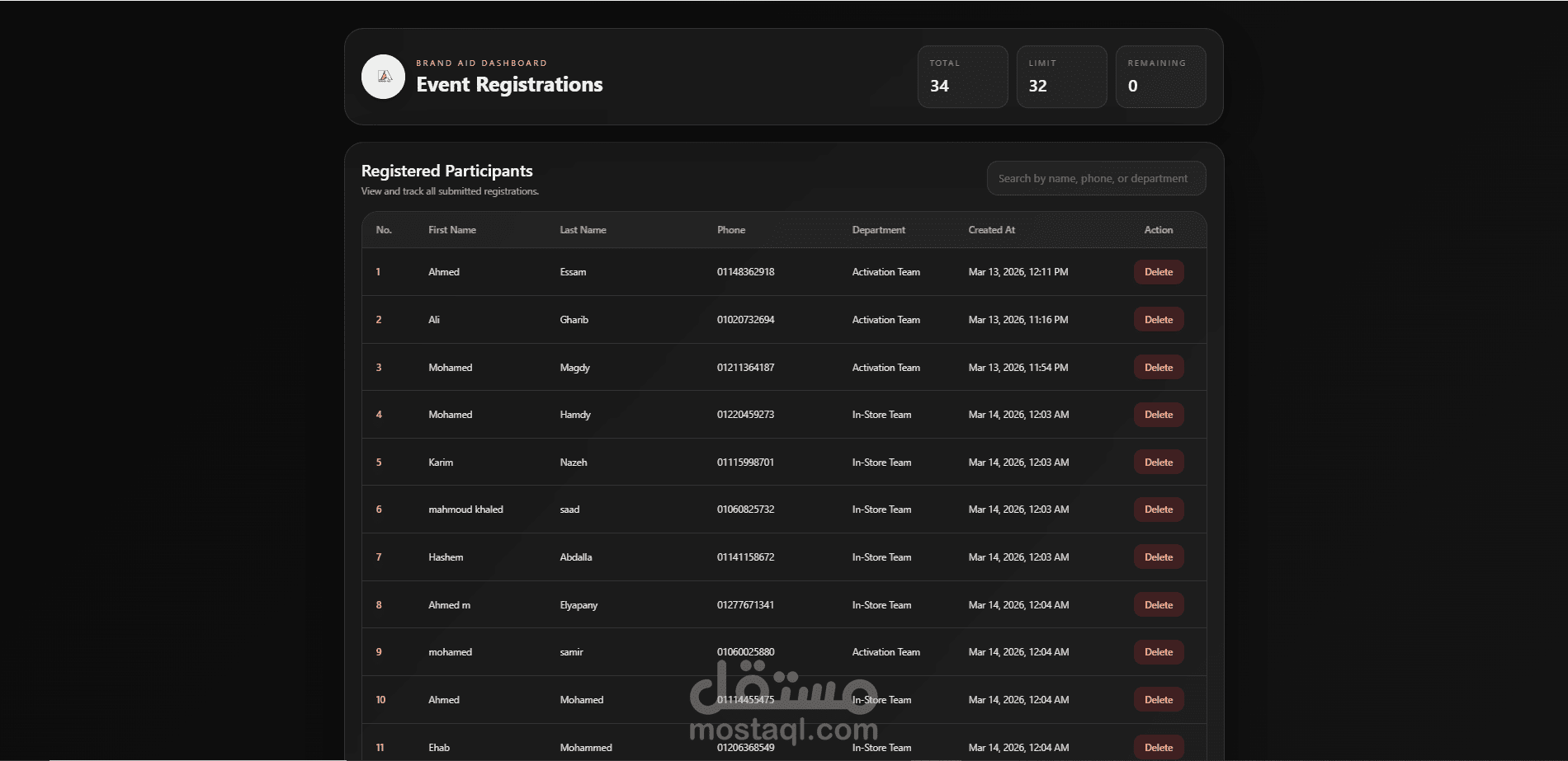 أنشأت لوحة تحكم للمسؤول لمتابعة عدد المقاعد المتاحة، وإدارة طلبات التسجيل، وحذف السجلات عند الحاجة.