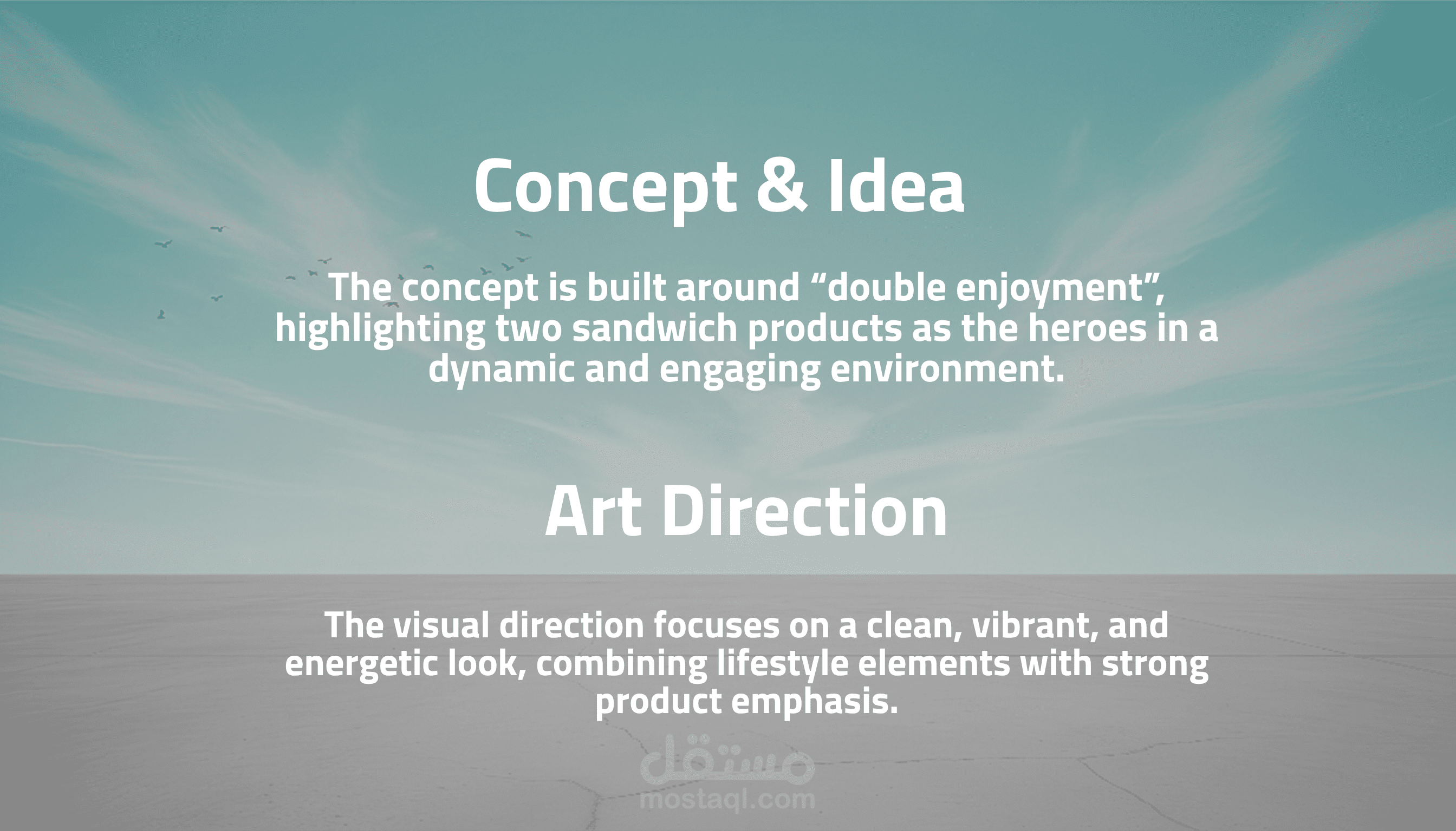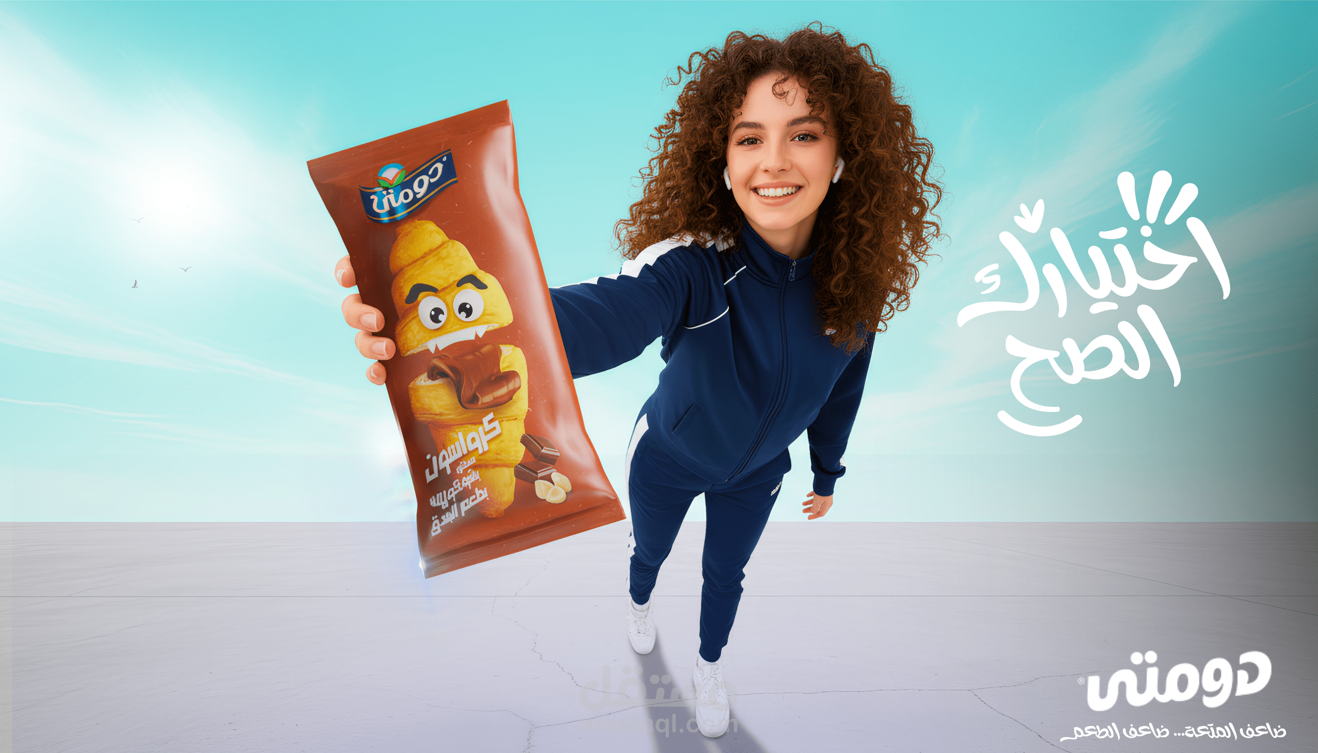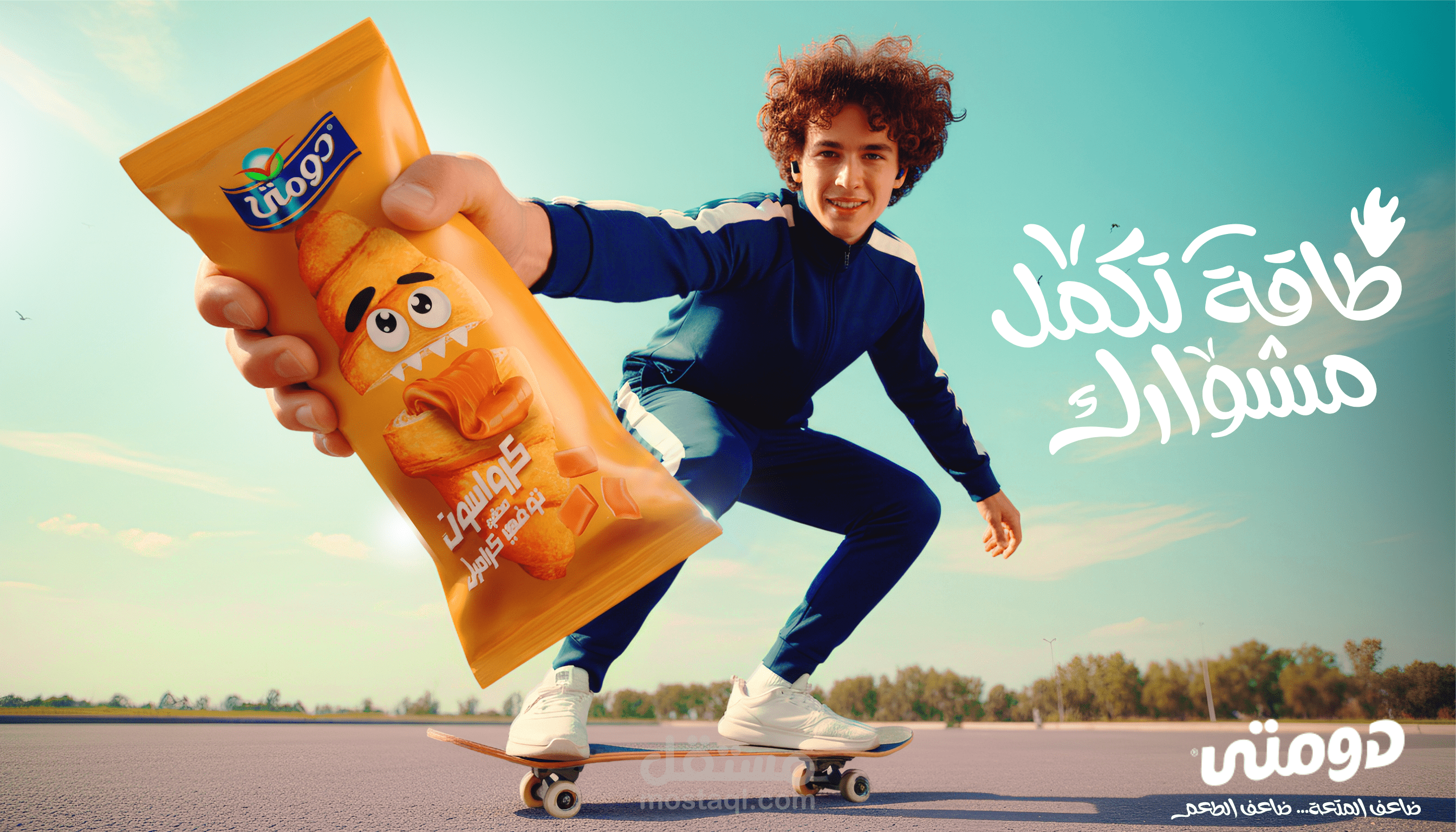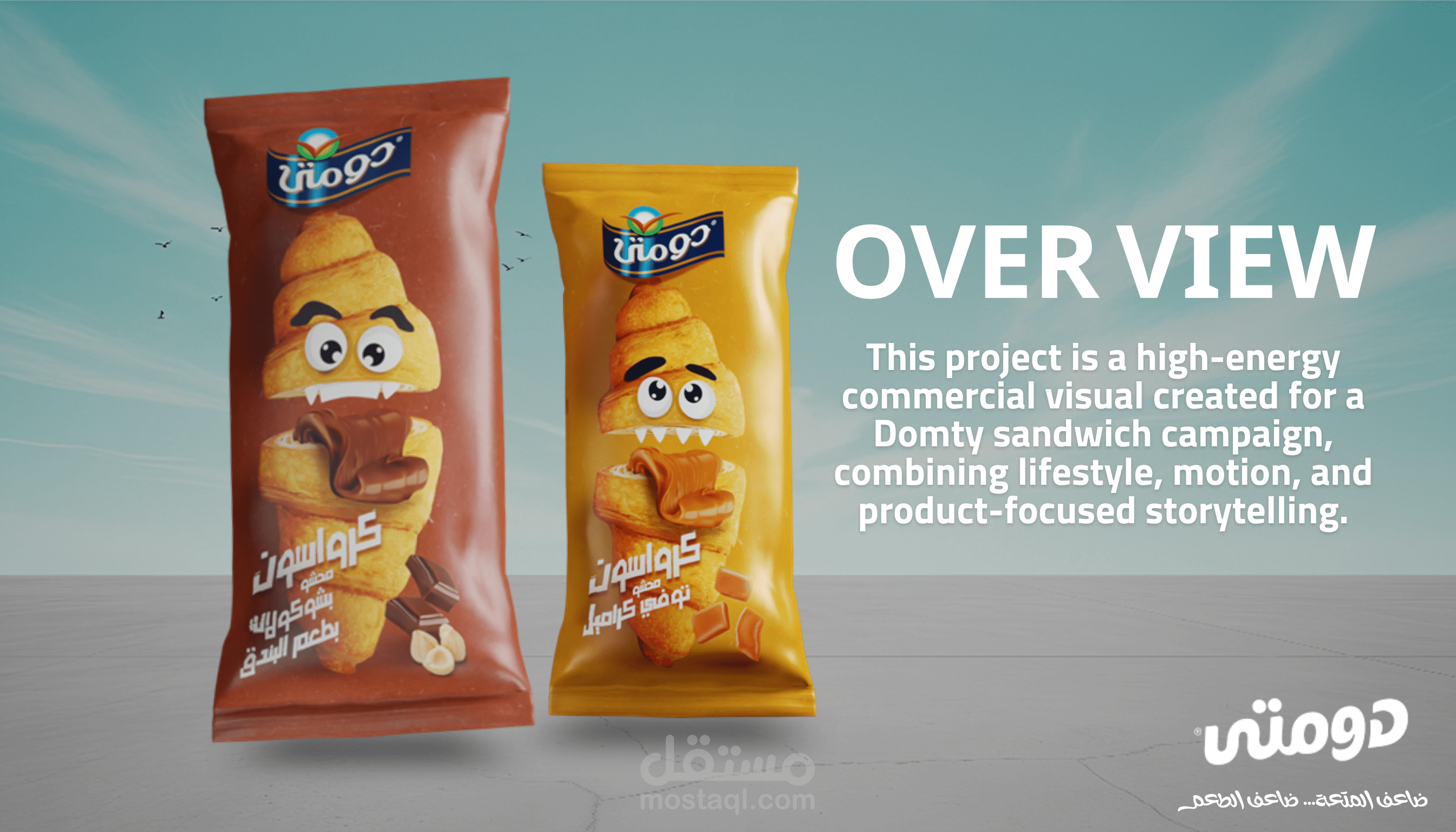 This project is a high-energy commercial visual created for a Domty sandwich campaign, combining lifestyle, motion, and product-focused storytelling. The concept revolves around amplifying the idea of “double enjoyment” by featuring two oversized sandwich products as the hero elements, placed in a dynamic composition with youthful characters. The scene captures a vibrant moment where movement, perspective, and scale work together to highlight the product in an engaging and modern way. A high-angle perspective was used to create depth and a strong three-dimensional feel, while foreshortening enhances the dominance of the product within the frame. The characters add a sense of lifestyle and relatability, reinforcing the brand’s connection to energy, youth, and everyday activity. The visual style is clean and minimal, with a gradient sky background, natural lighting, and subtle environmental elements such as trees and birds to maintain realism while keeping the focus on the product