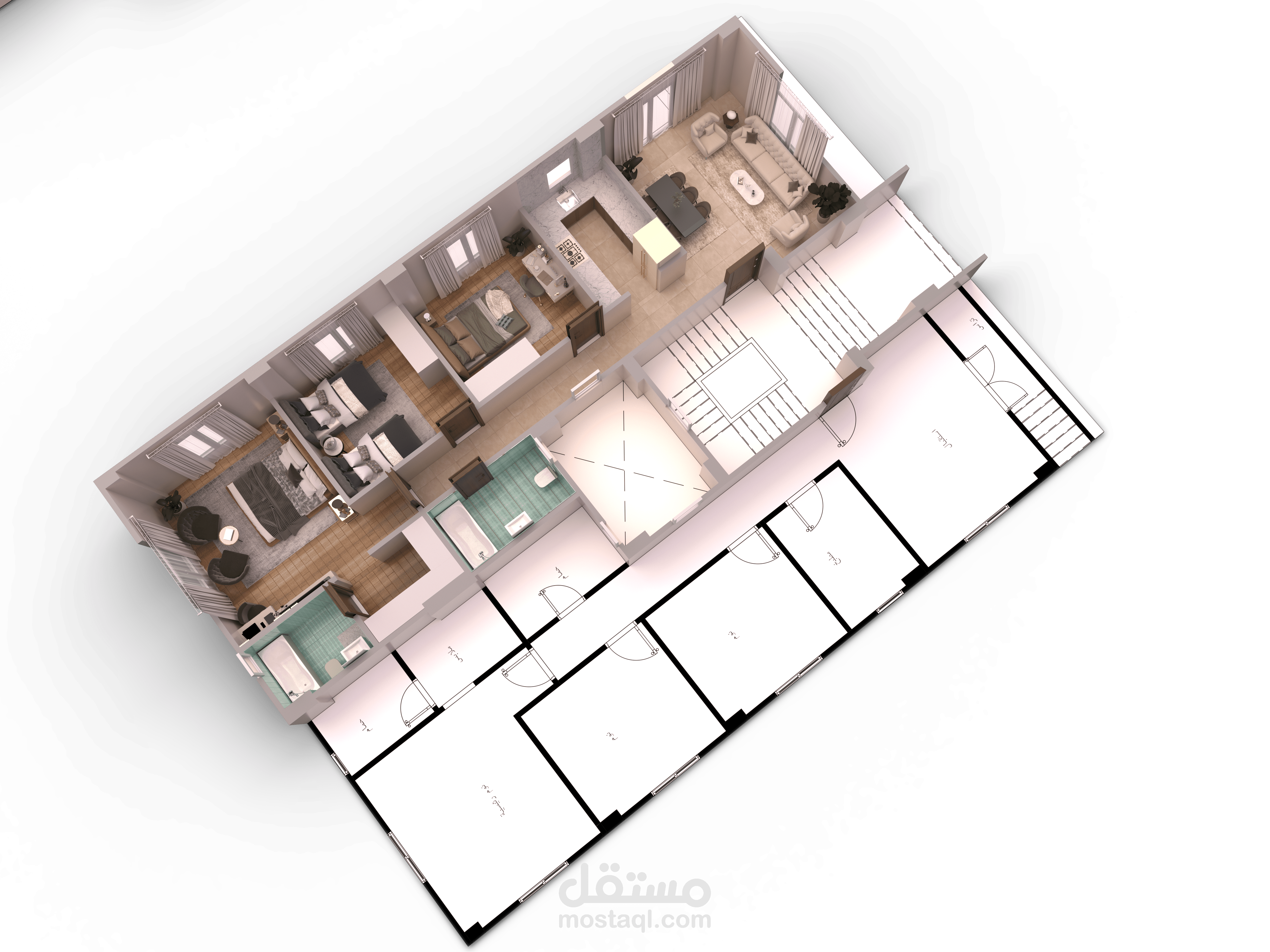 يشمل العمل تصميم داخلي متكامل، نمذجة ثلاثية الأبعاد (3D Modeling)، وإخراج رندر واقعي عالي الجودة يعكس المشروع بشكل احترافي وقابل للتنفيذ.