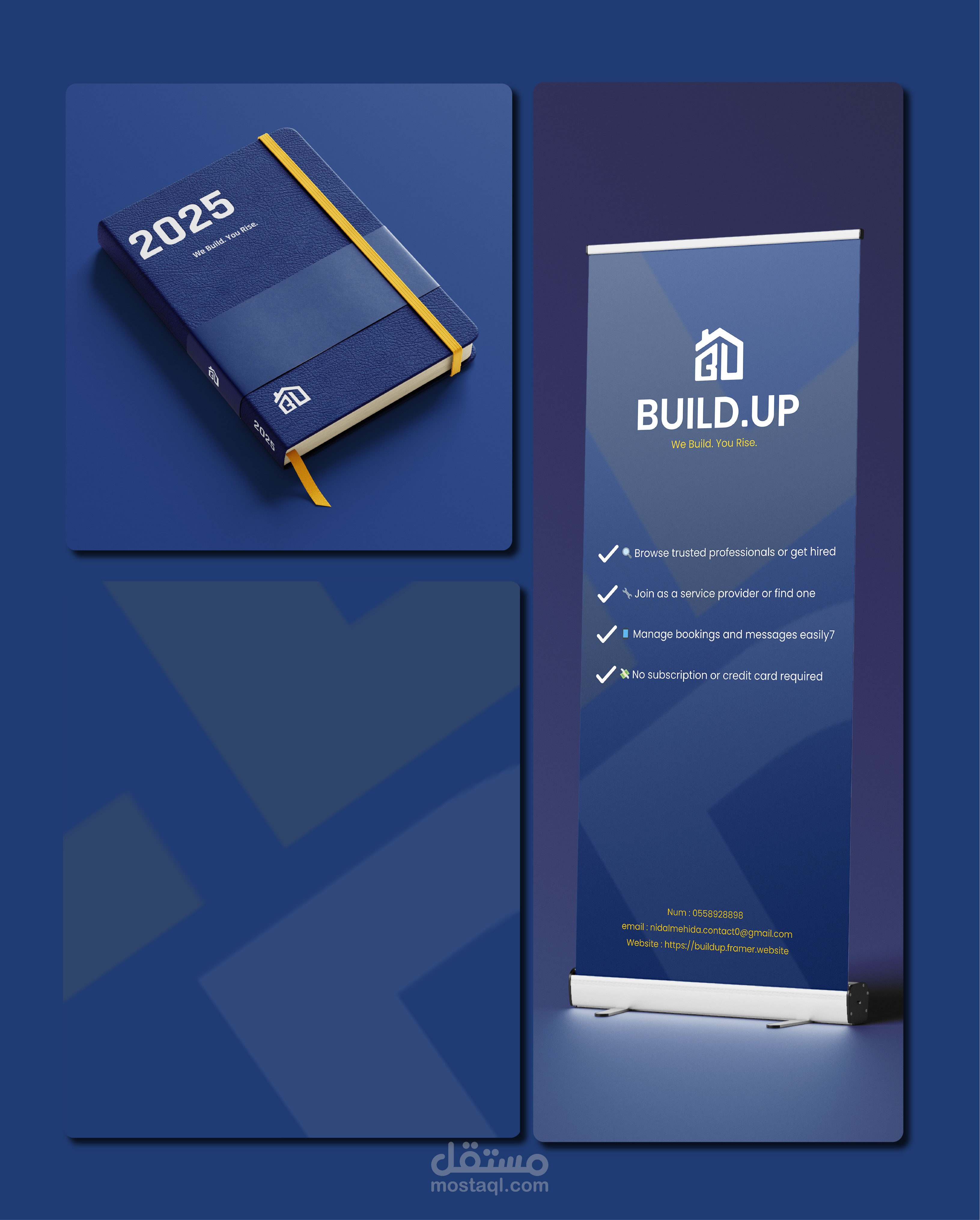 The Build.Up logo blends a modern, minimalist house icon with a bold and structured font to reflect trust, stability, and functionality. The upward arrow subtly integrated within the house symbolizes growth and support — a nod to both building physical spaces and empowering users through reliable services. The use of deep blue conveys professionalism and security, while the vibrant yellow adds a sense of energy, optimism, and approachability. Together, these elements position Build.Up as a smart, user-first platform for finding dependable home service professionals.