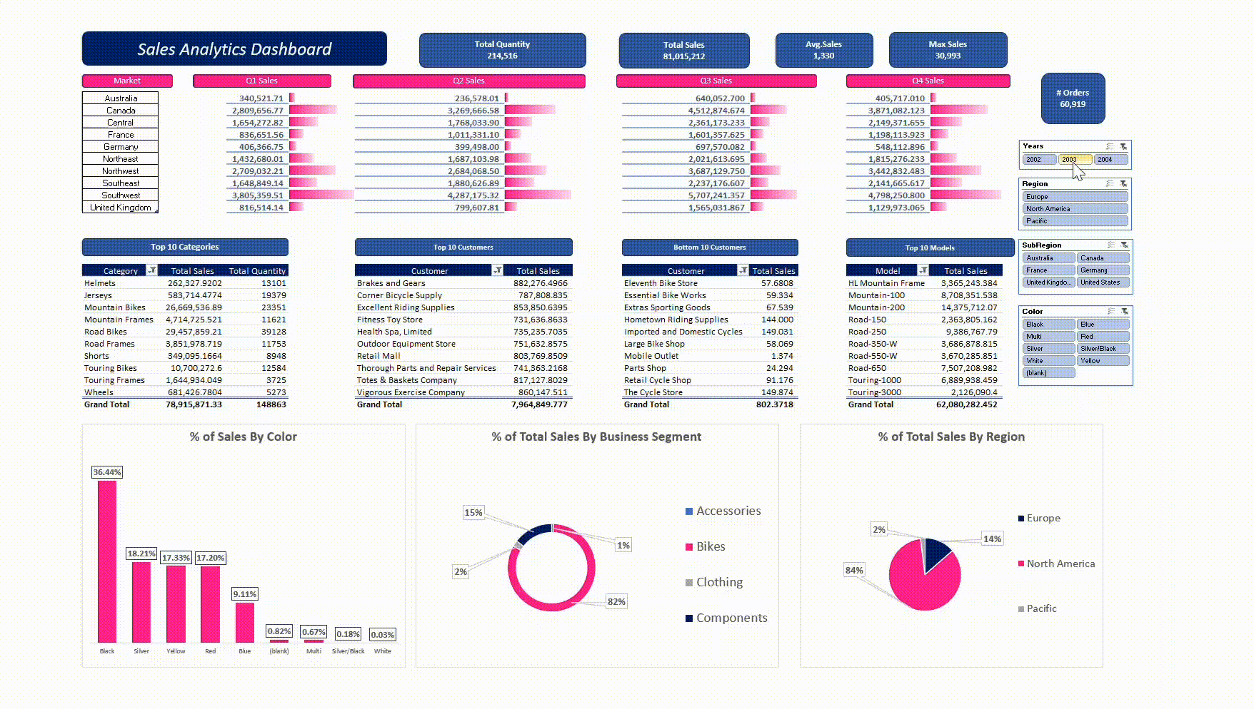 A client needed a comprehensive Excel dashboard to track sales performance across multiple regions, product categories, and time periods. I designed an interactive dashboard using pivot tables, slicers, and advanced charting to provide a clear overview of business performance. The dashboard highlights: