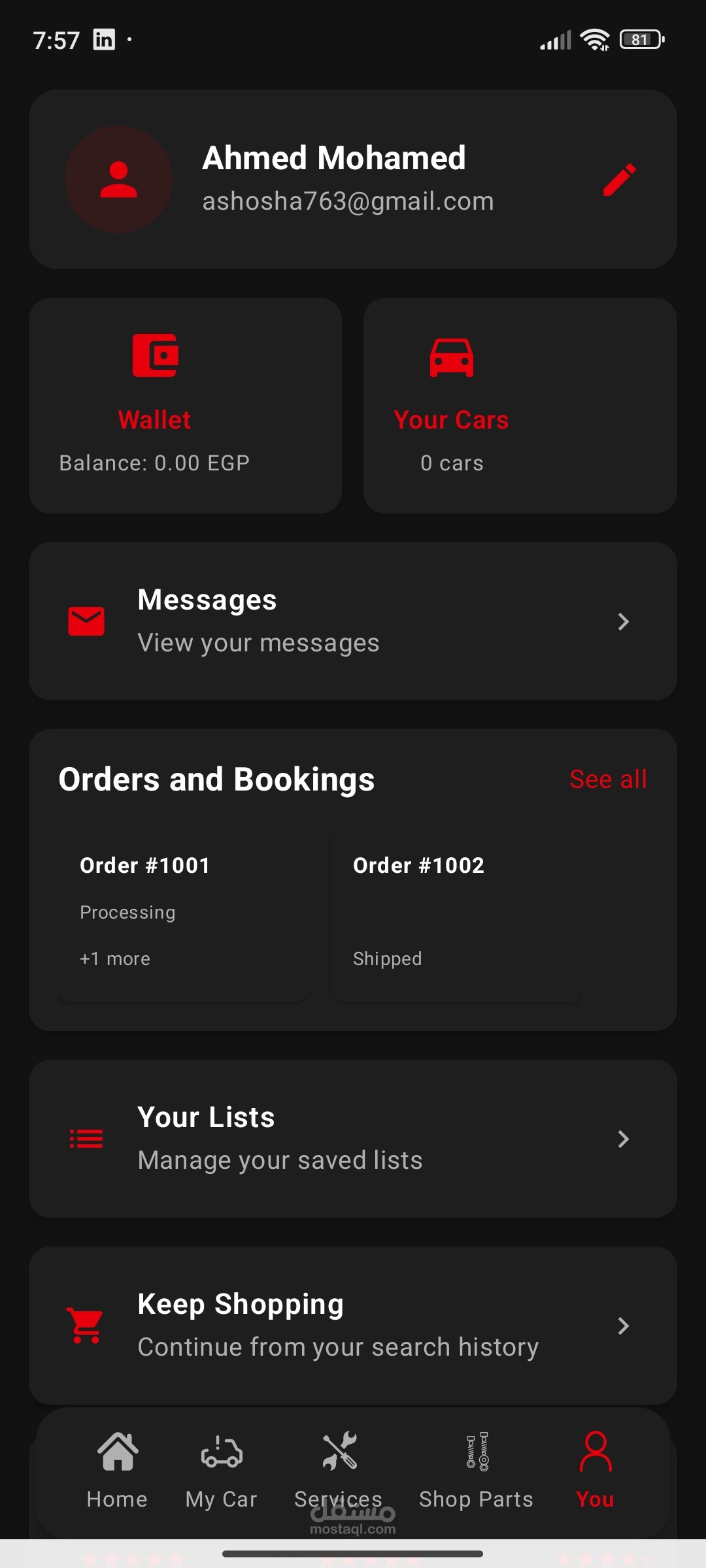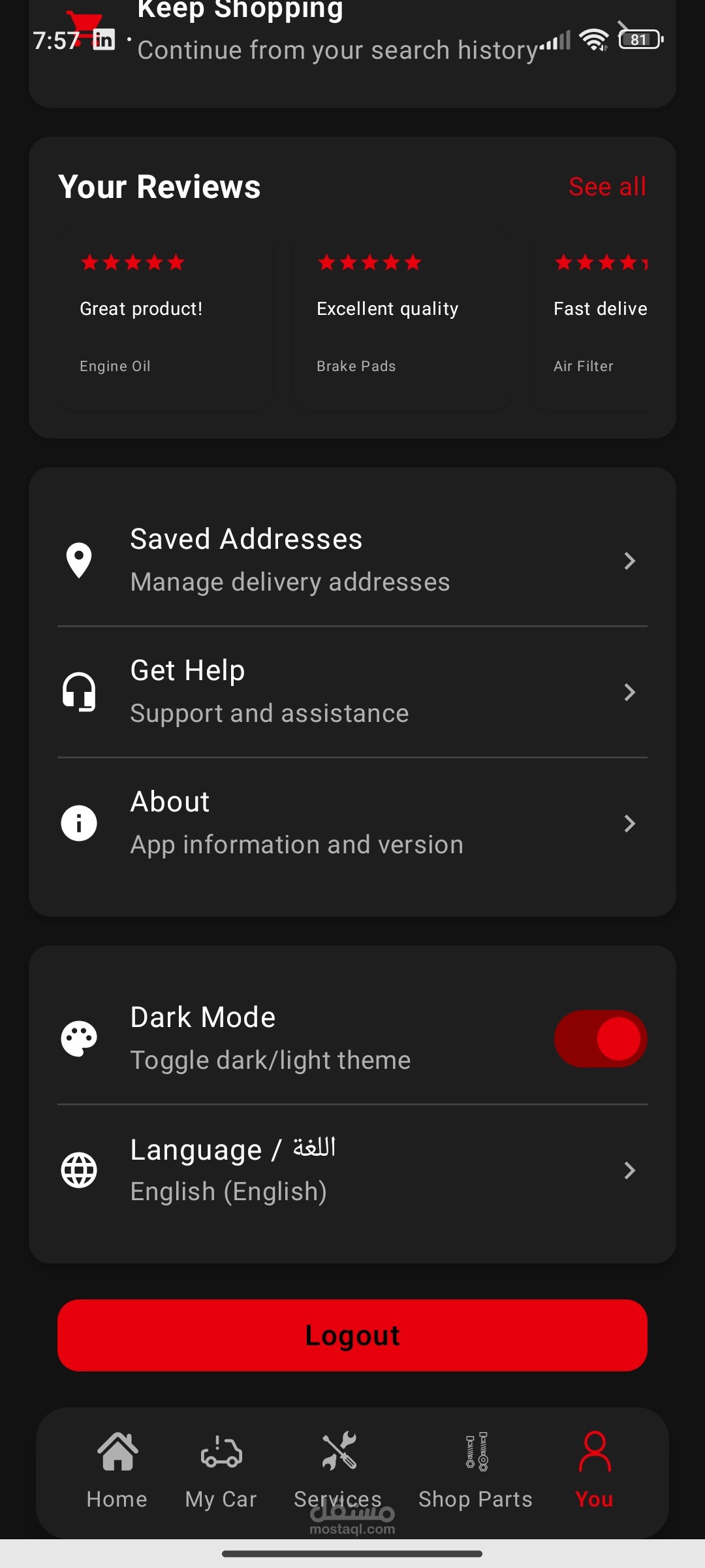تطبيق متكامل لبيع قطع غيار السيارات مبني على منصة Android الأصلية، يربط بين العملاء ومراكز الصيانة وموردي قطع الغيار في منصة واحدة سهلة الاستخدام.