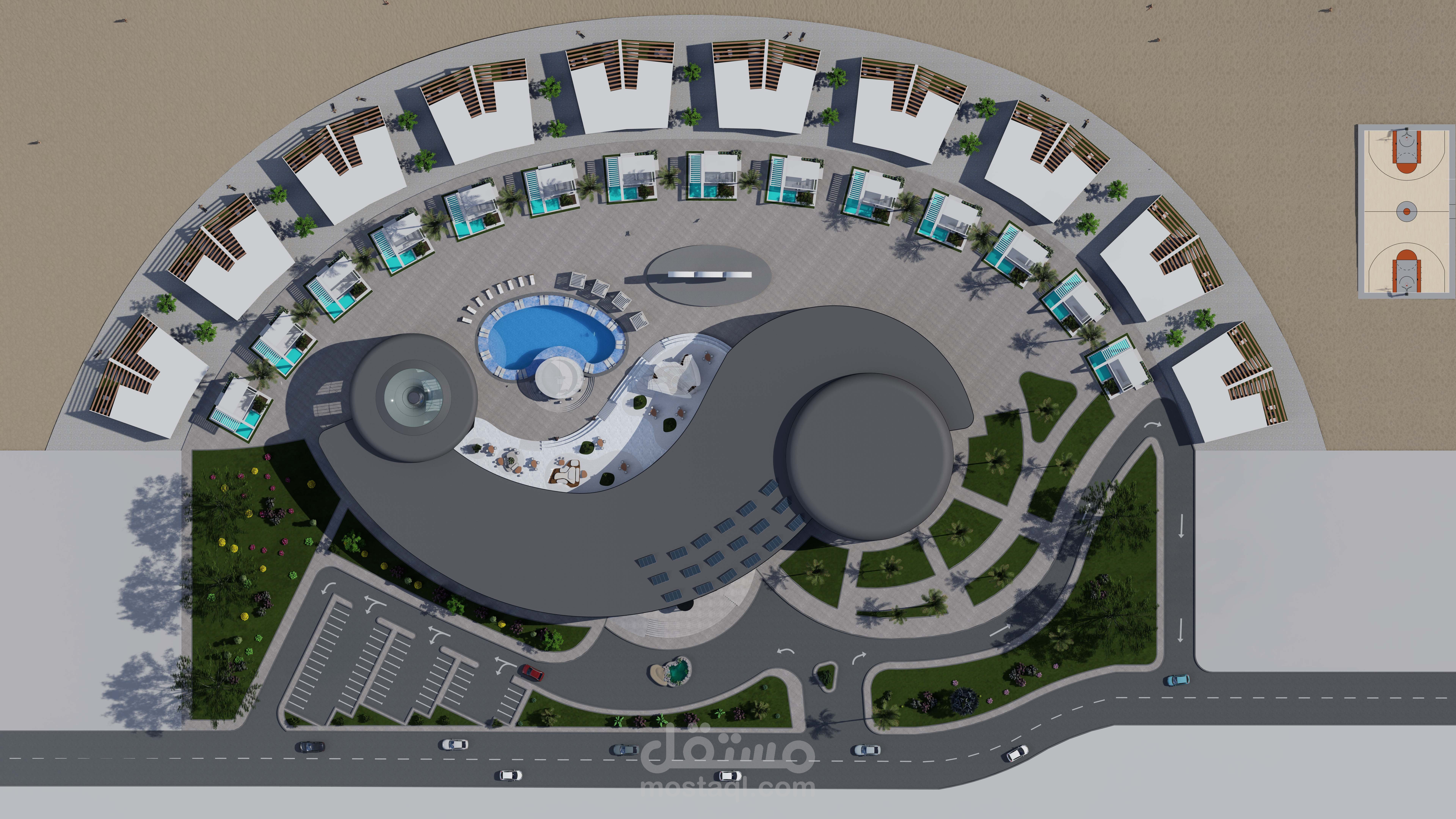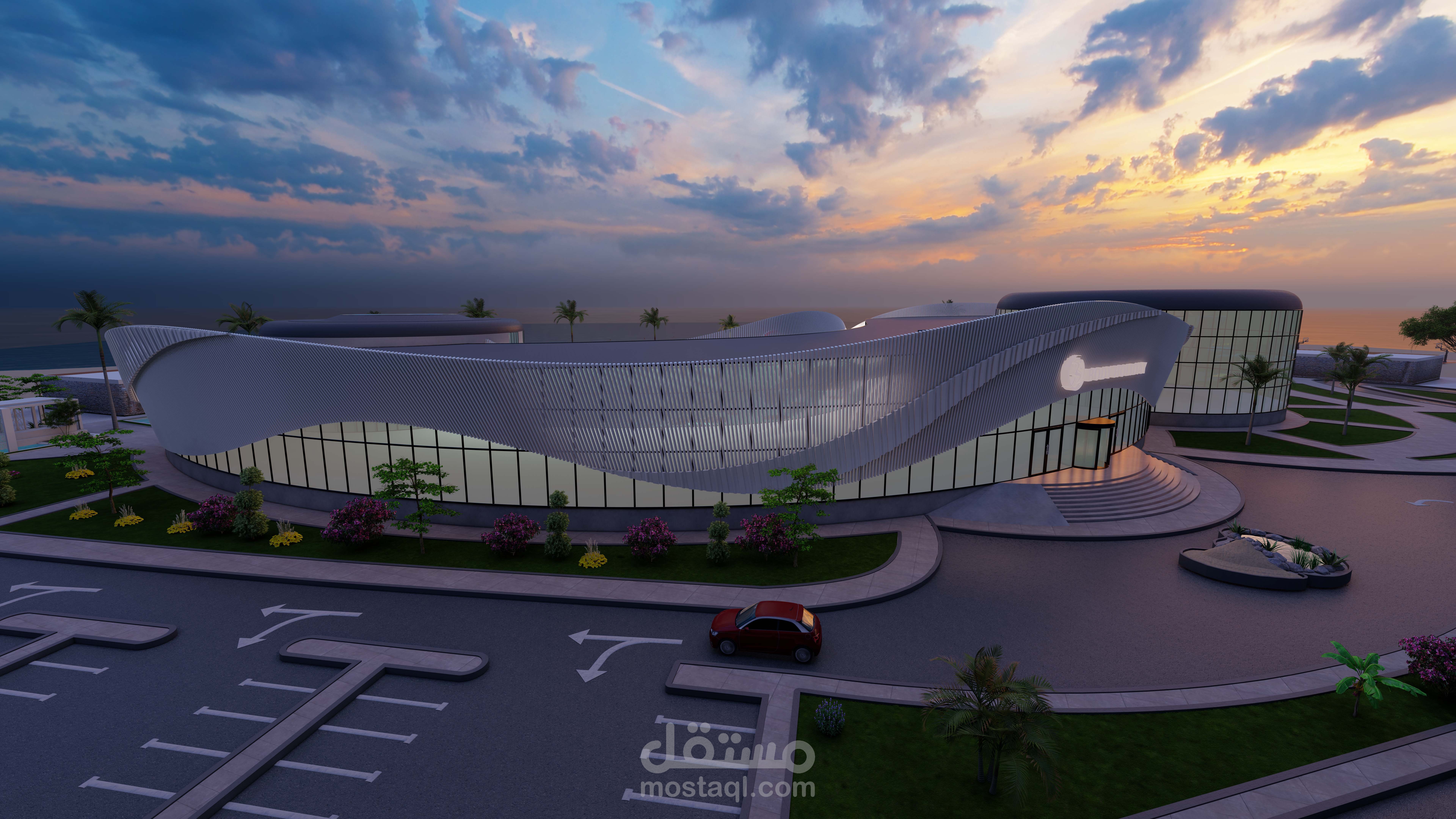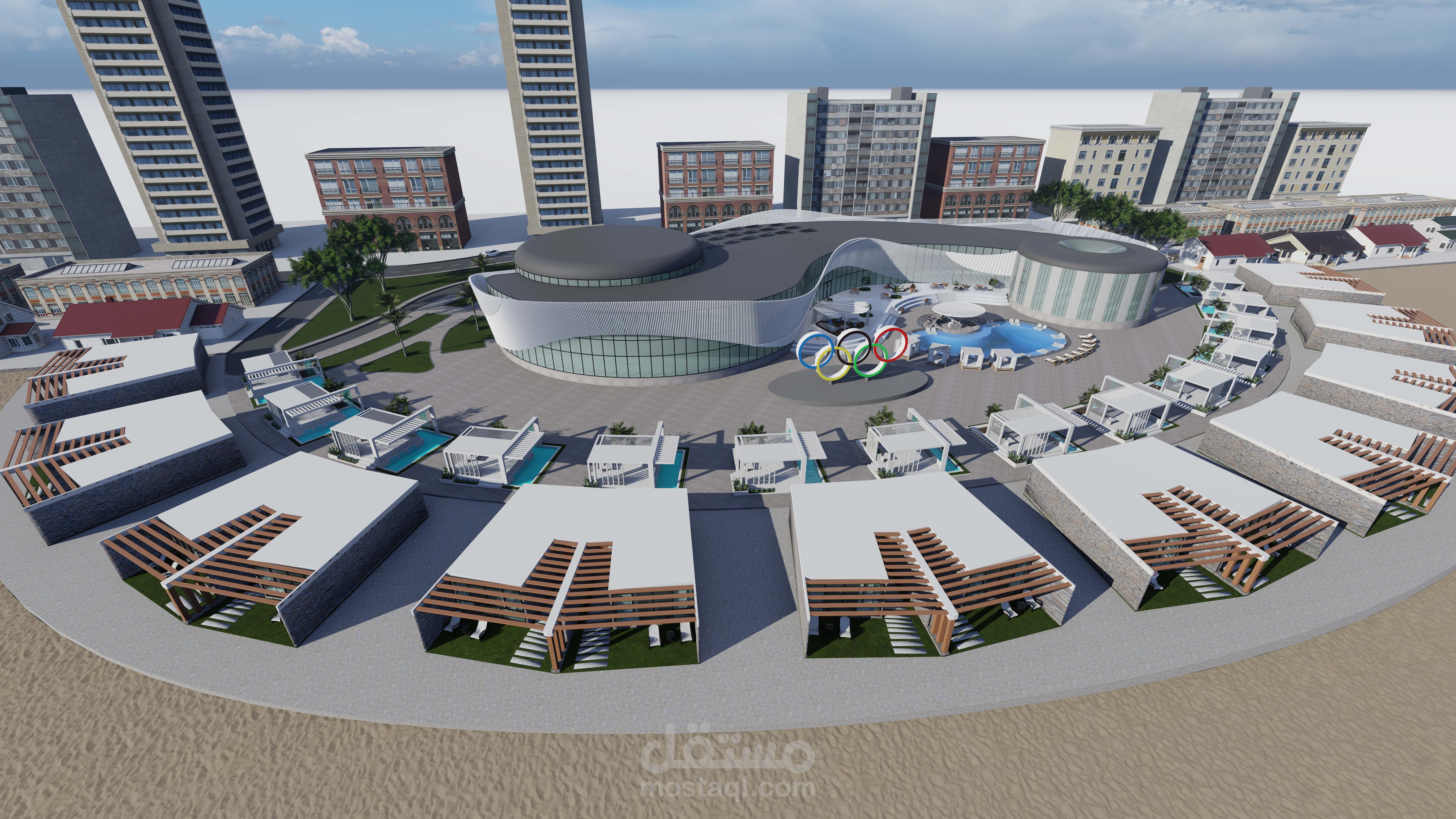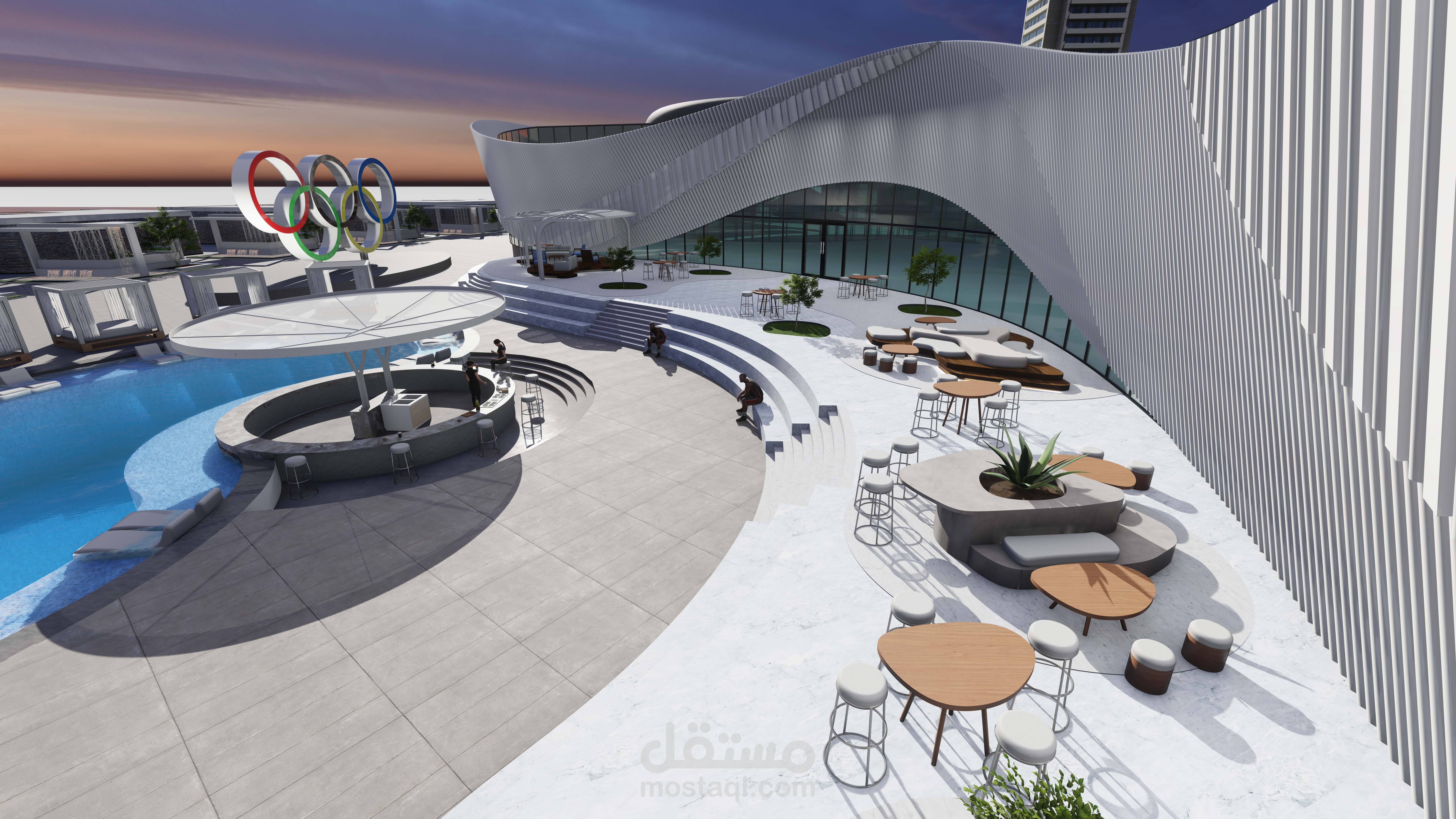 The concept is inspired by the Olympic logo, which symbolizes continuous motion and energy. This inspiration guided the use of fluid lines and dynamic curves to create an architectural form that embodies movement and vitality.