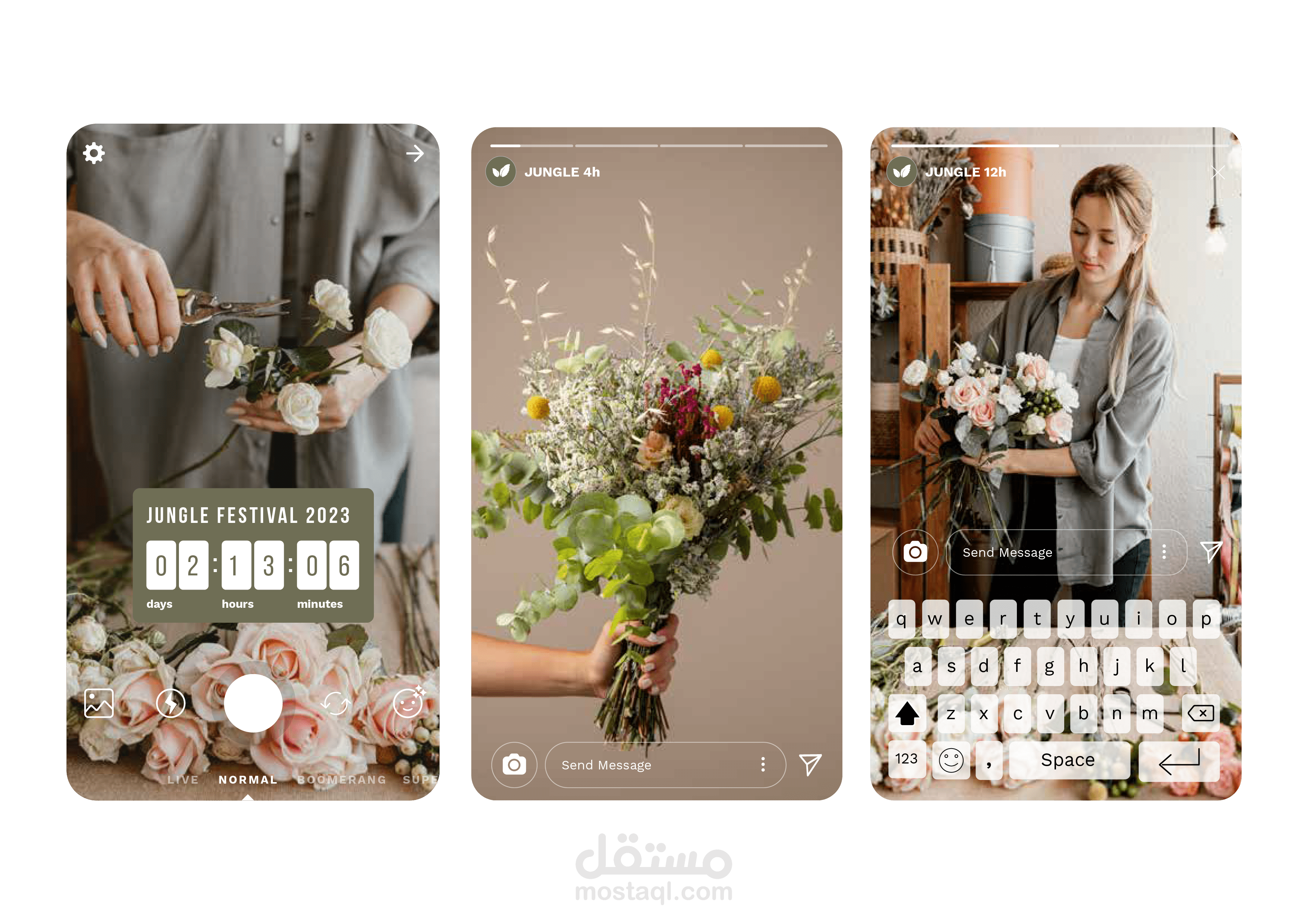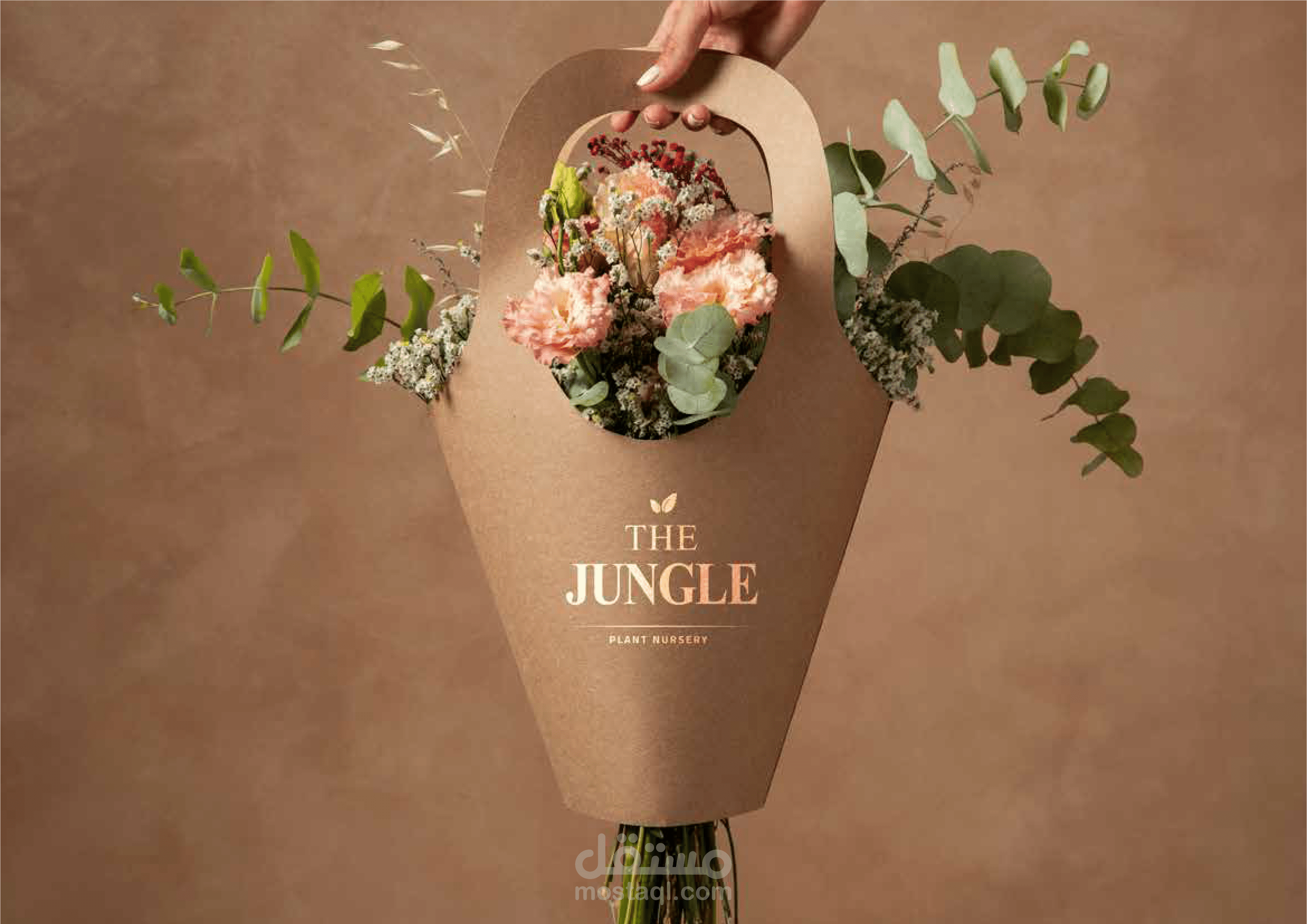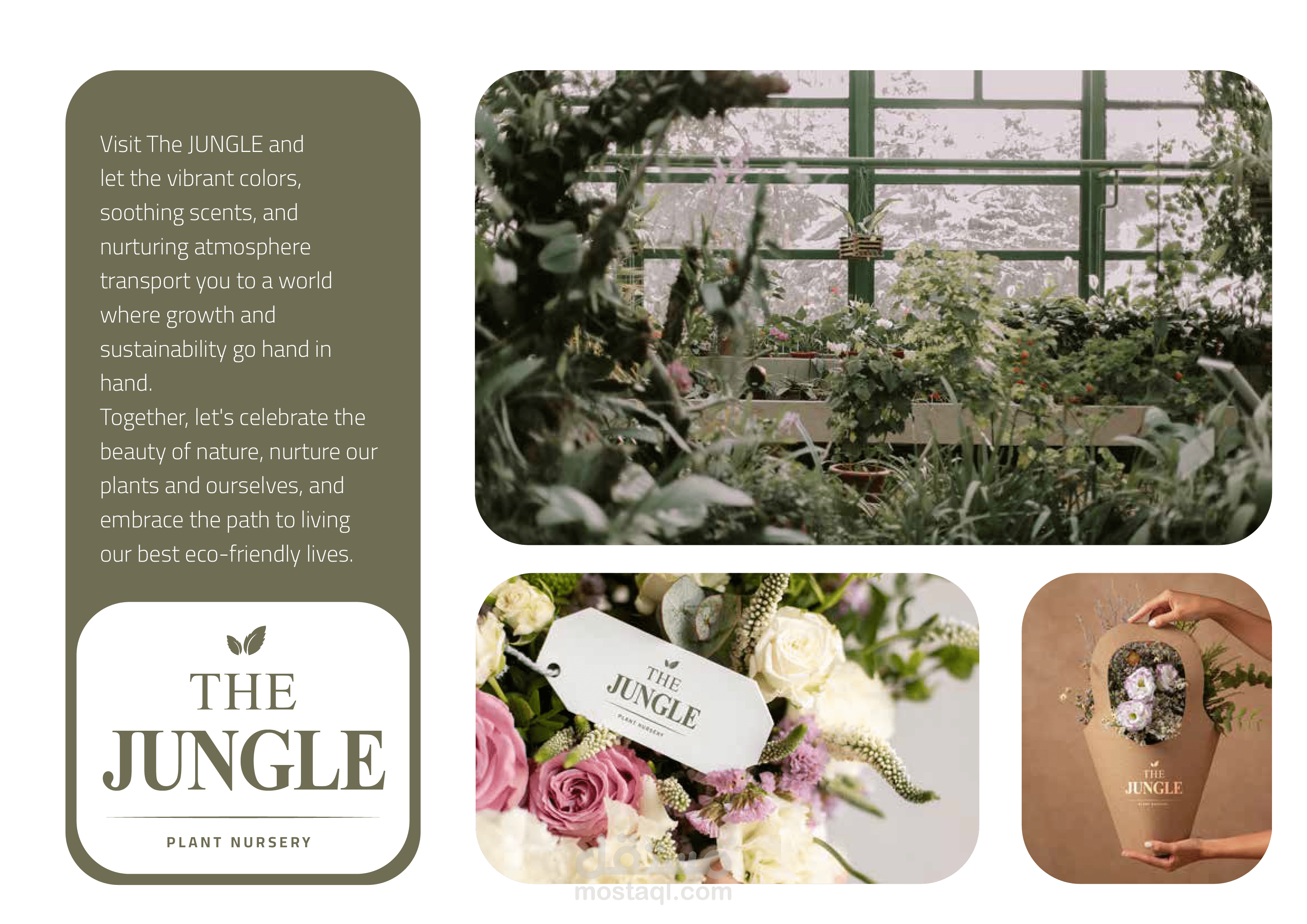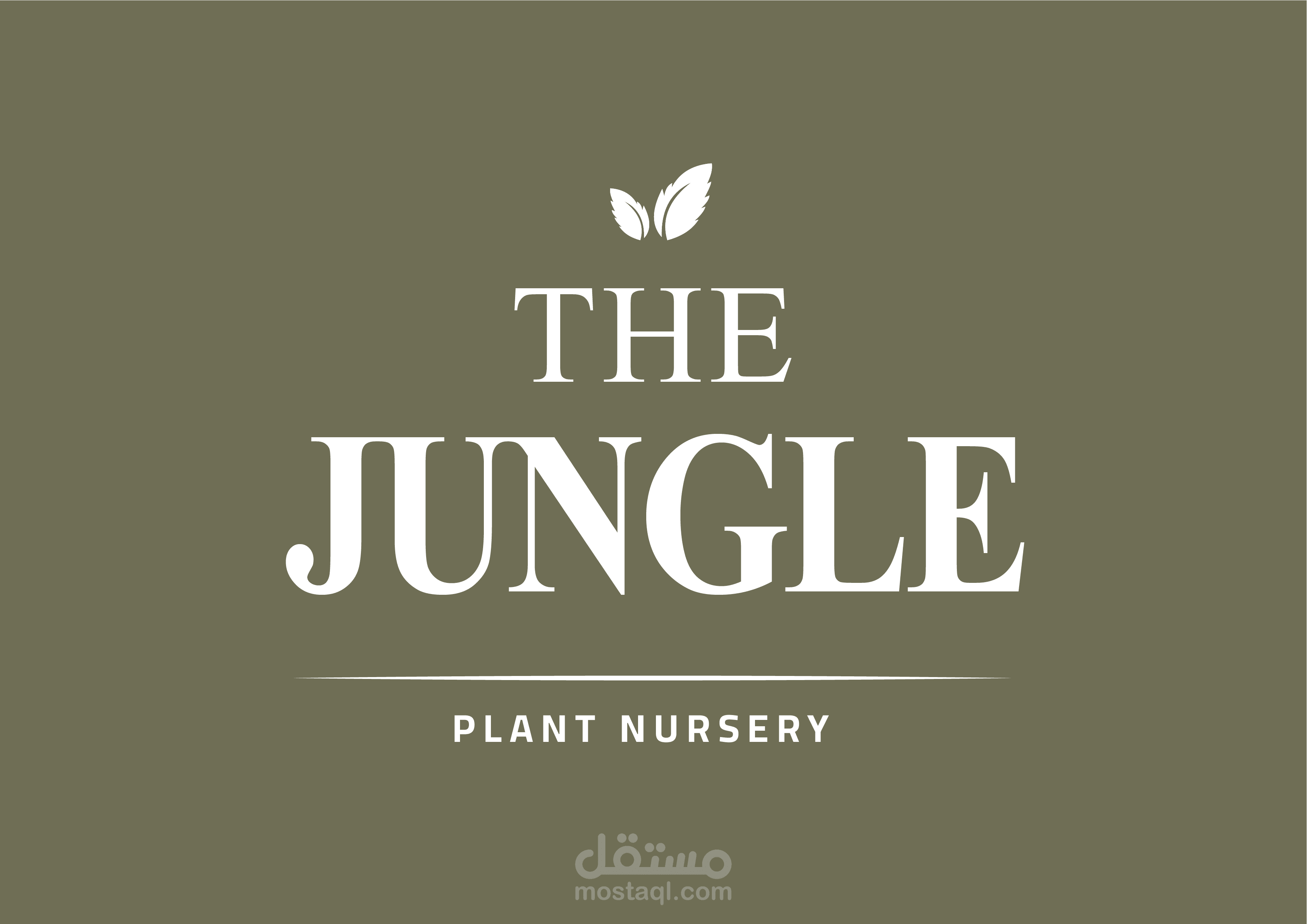 صورة فوتوغرافية جذابة تعرض شعار مشتل "The Jungle" على خلفية داخلية لمشتل نباتي مليء بالحياة. تتميز الصورة بأسلوب عتيق وهادئ، مع استخدام درجات اللون الأخضر الزيتوني والبيج الدافئ لخلق جو دافئ وطبيعي.