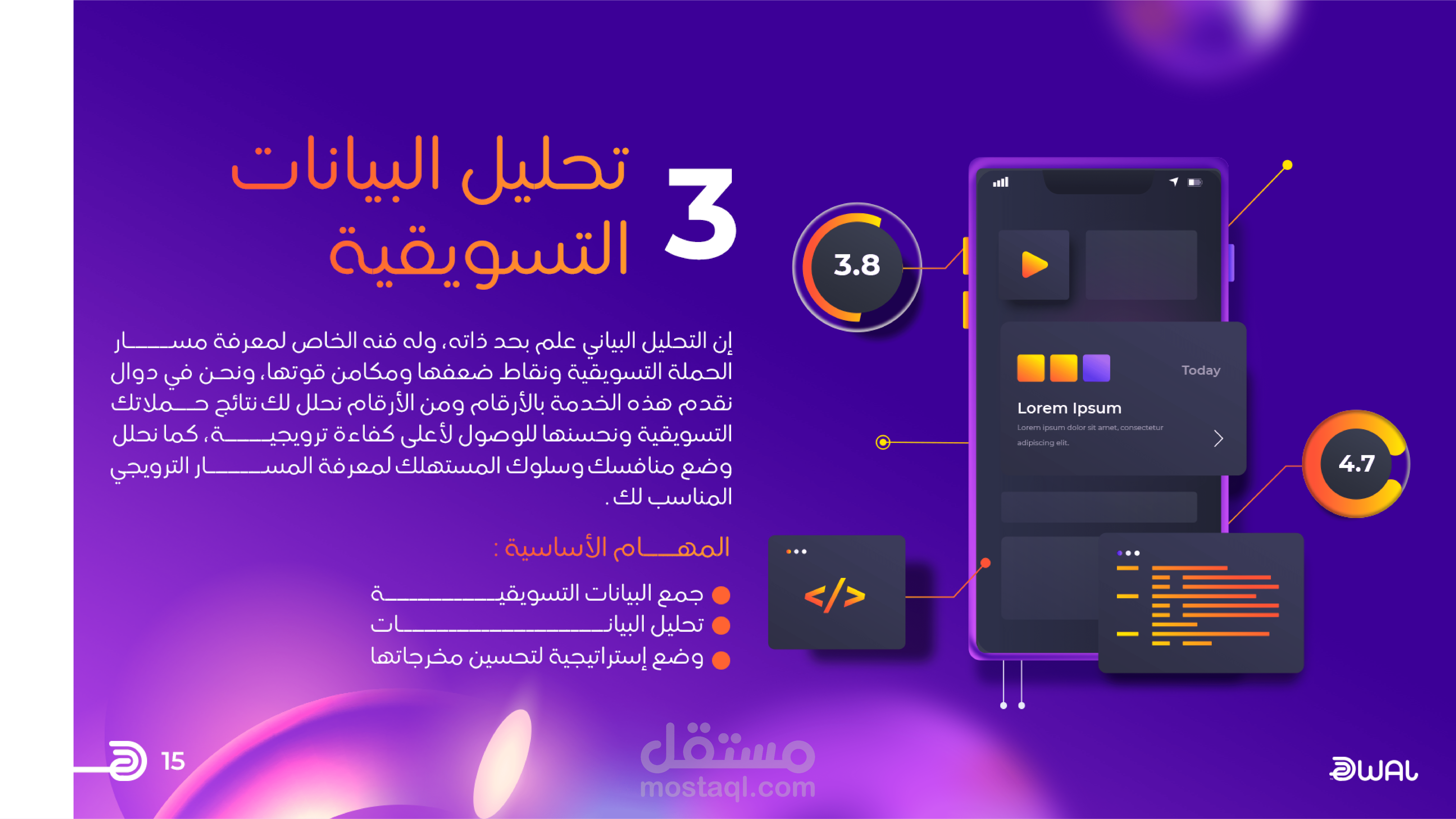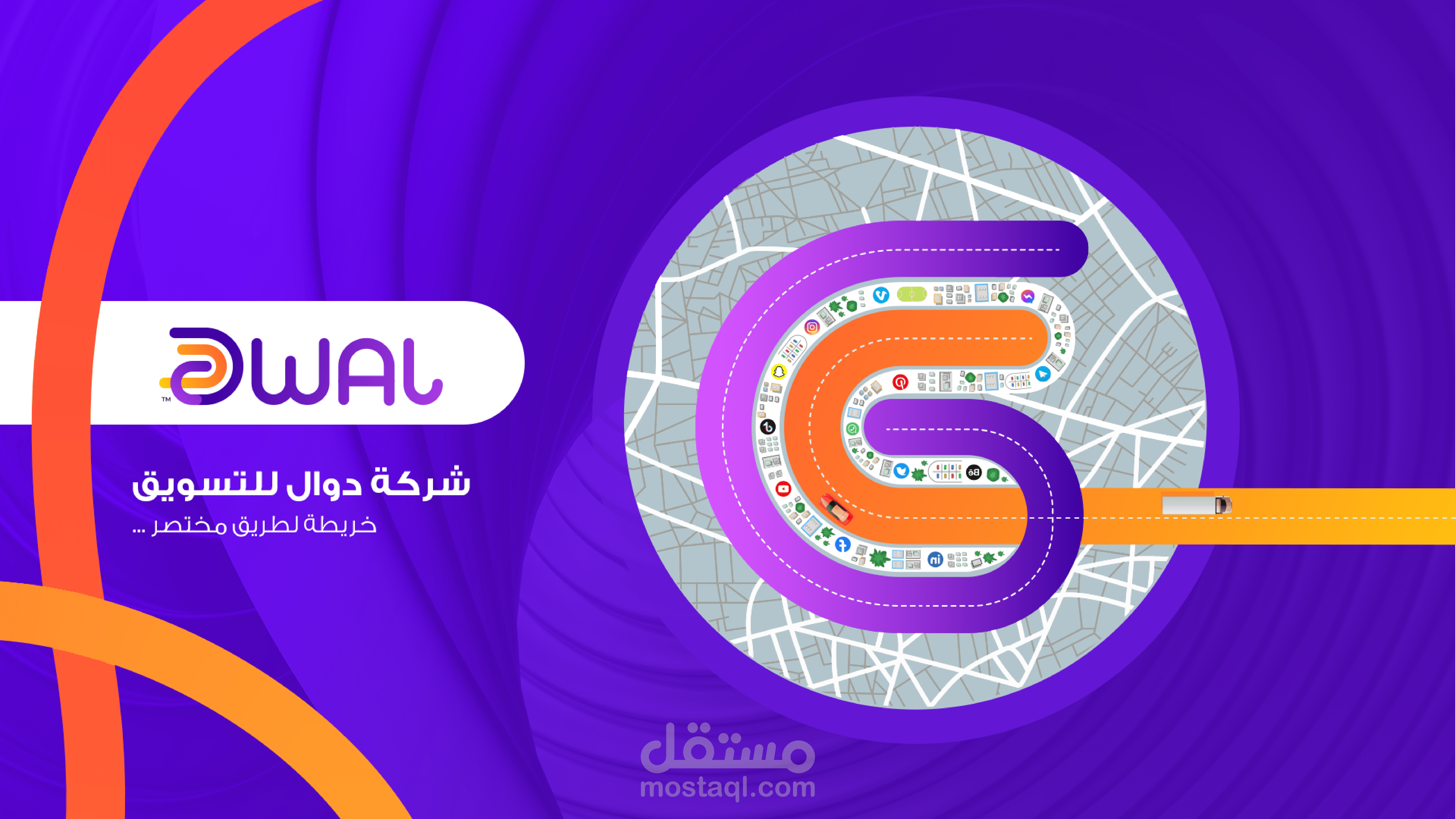 تصميم إبداعي حديث يعكس مفهوم التسويق الرقمي بطريقة بصرية مبتكرة، حيث تم تجسيد فكرة “الرحلة” من خلال طريق متعرج يمر عبر خريطة مليئة بالرموز والتطبيقات الرقمية، في إشارة ذكية إلى تنوع قنوات التسويق وتكاملها. يعتمد العمل على ألوان حيوية وجذابة تجمع بين البنفسجي والبرتقالي، مما يمنح التصميم طاقة ديناميكية ويعزز من قوة الهوية البصرية. تم توزيع العناصر بشكل متوازن مع استخدام أشكال دائرية وانسيابية تضيف إحساسًا بالحركة والاستمرارية، إلى جانب إبراز الشعار بطريقة واضحة ومميزة تعزز من حضور العلامة التجارية. التصميم مناسب للاستخدام في الحملات التسويقية، العروض التقديمية، ومنصات السوشيال ميديا، حيث يجمع بين البساطة والاحترافية مع لمسة إبداعية تلفت الانتباه وتعبر عن فكرة “الوصول السريع والذكي” في عالم التسويق الرقمي.