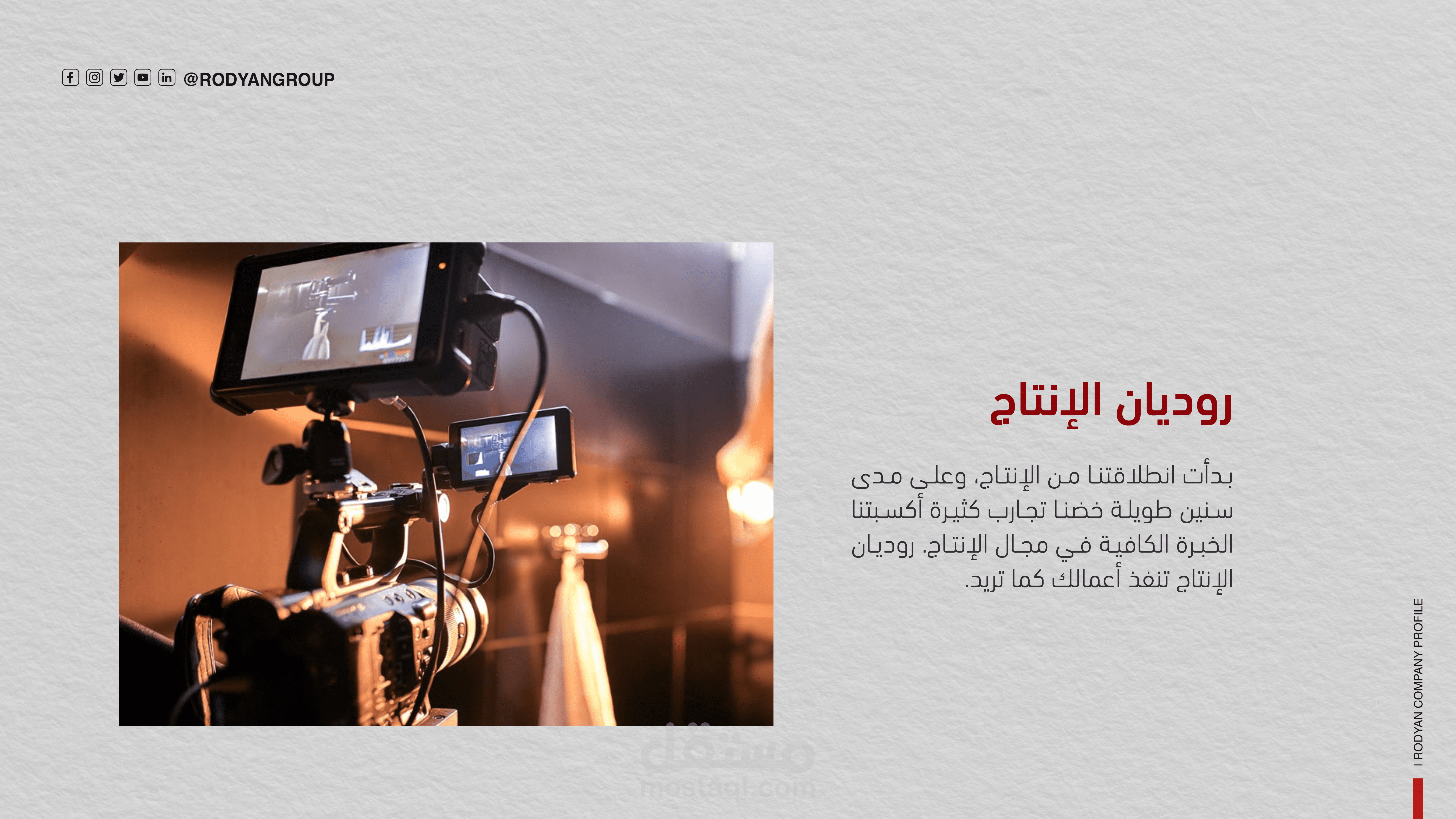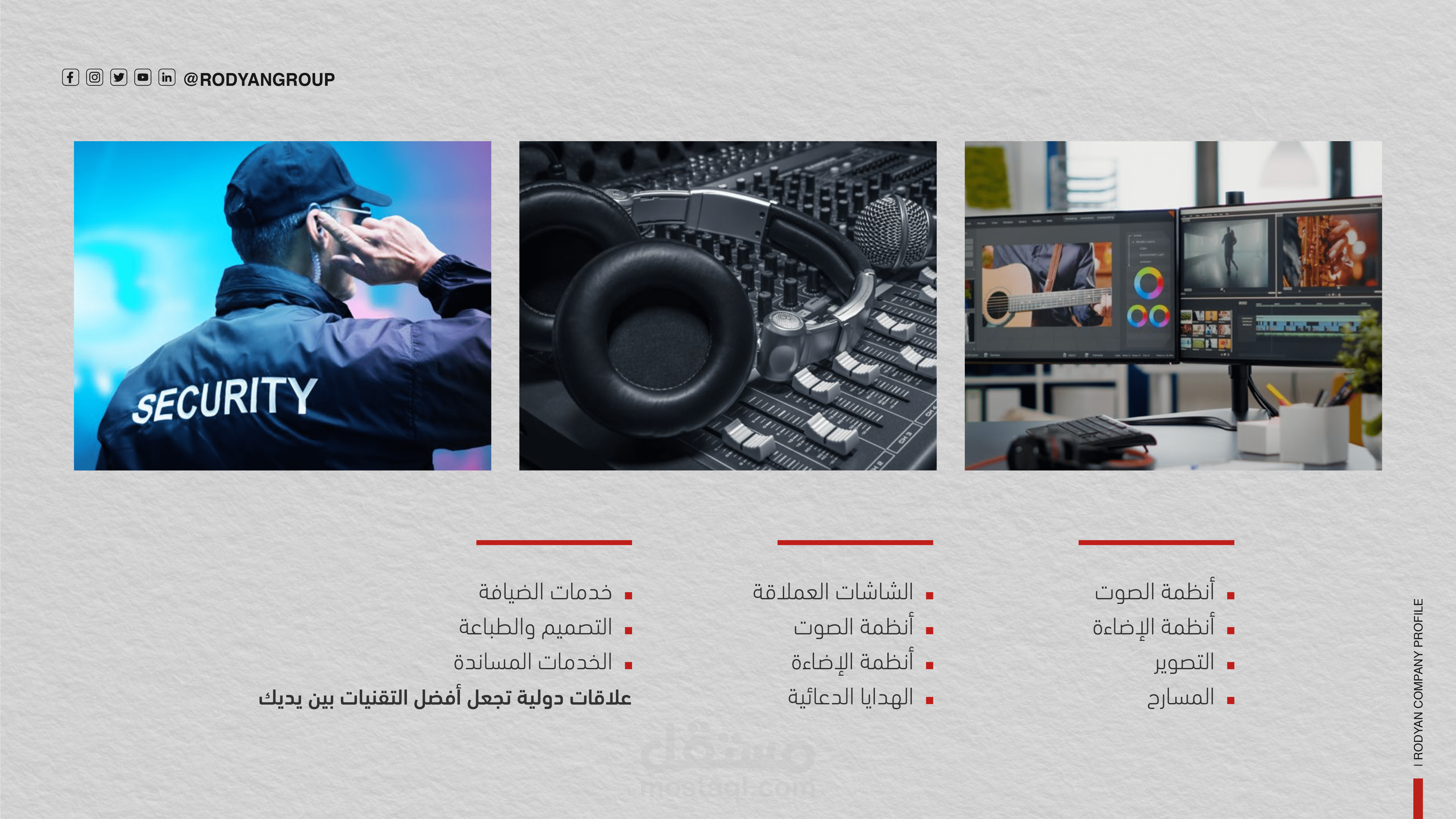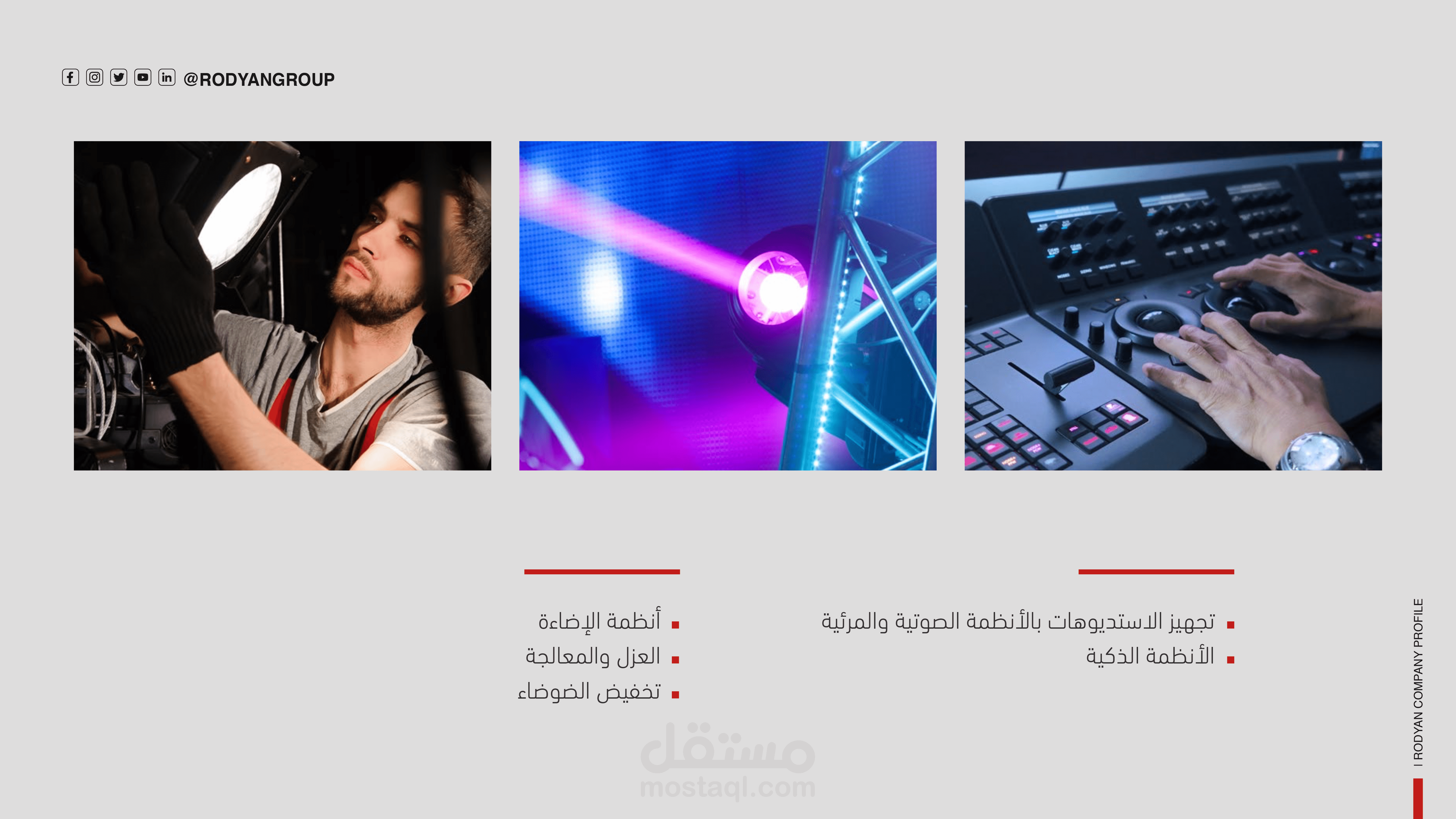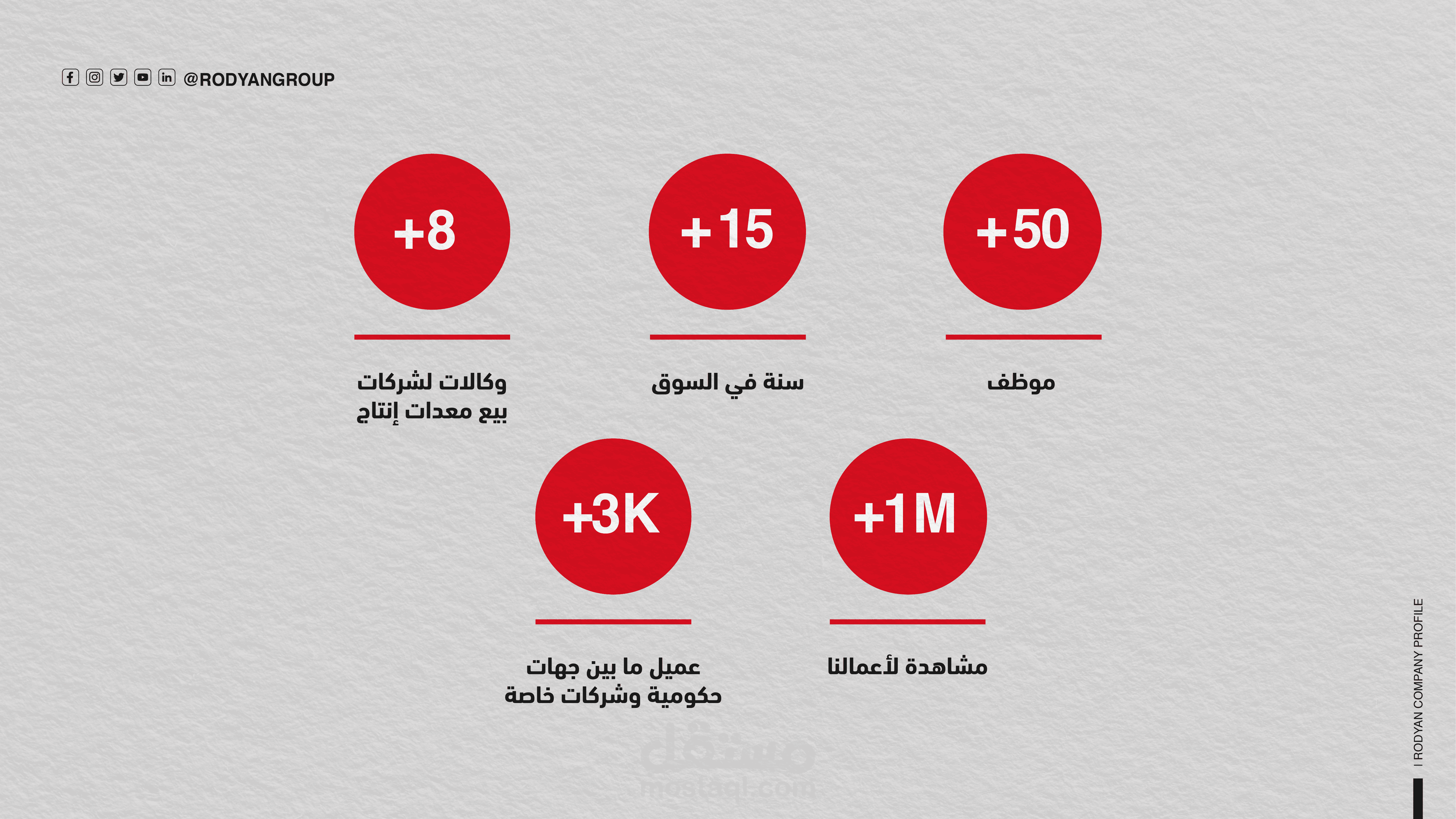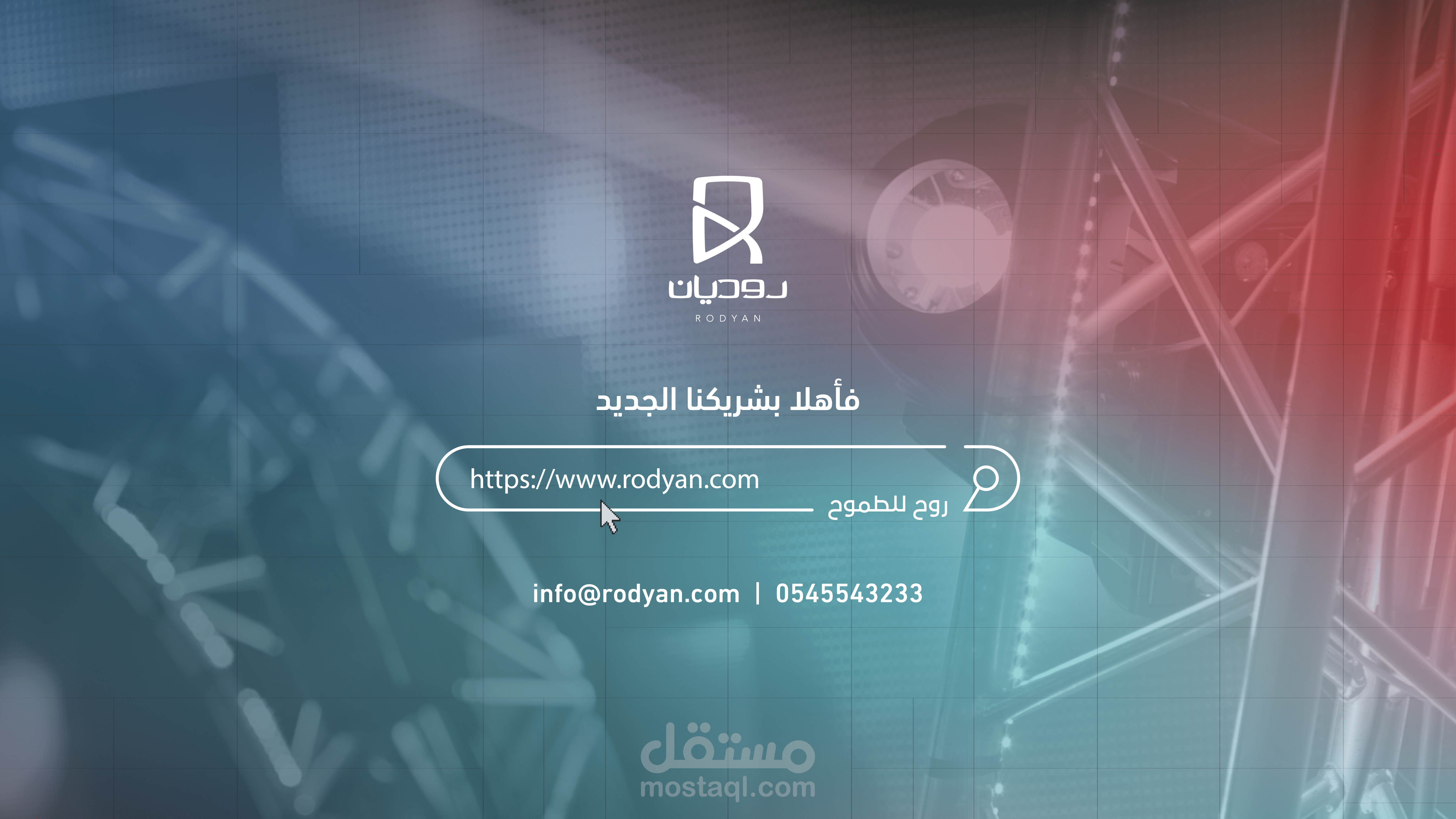 الخلفية والعمق البصري: تم استخدام خلفية بنمط "Grid" (شبكي) خفيف مع تداخل لصور واقعية لمعدات تقنية أو هندسية تحت تأثير "Blur"، مما يخلق عمقاً بصرياً (Depth) ويجعل العناصر النصية والشعار في المقدمة بوضوح عالٍ.