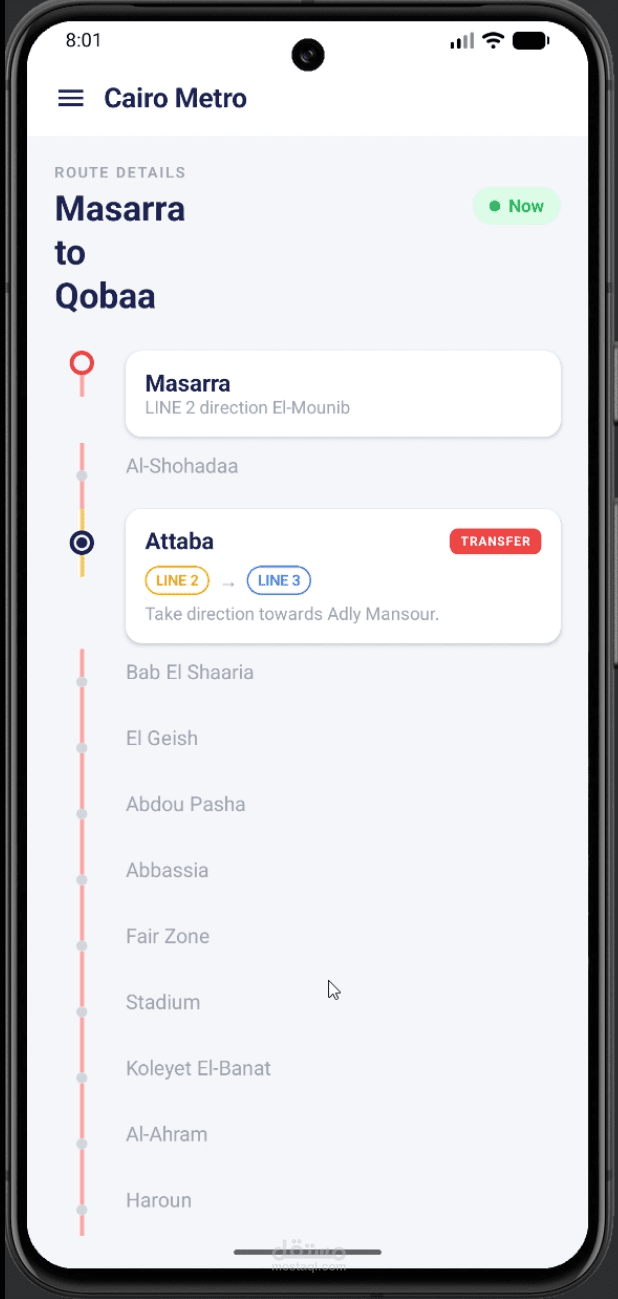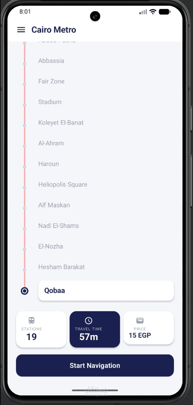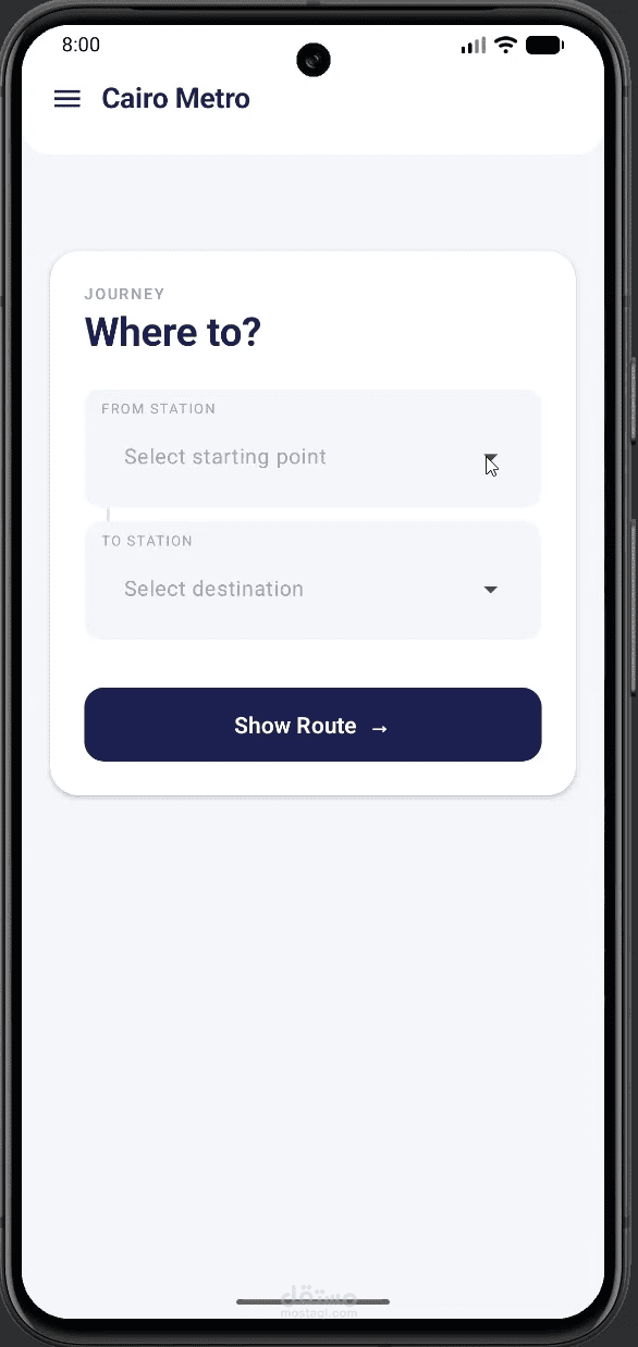 مشروع Cairo Metro Compose هو تطبيق موبايل تم تطويره باستخدام Jetpack Compose لمساعدة المستخدمين في معرفة مسارات مترو القاهرة بسهولة. يتيح التطبيق اختيار محطة البداية والنهاية، ثم يعرض أفضل مسار يتضمن عدد المحطات وأي تحويلات (Transfers) بين الخطوط والسعر والوقت المتوقع للوصول ، مع تمييز كل خط بلونه الخاص. يتميز التطبيق بواجهة حديثة وسلسة تعتمد على Compose، مما يوفر تجربة استخدام سريعة وبسيطة.