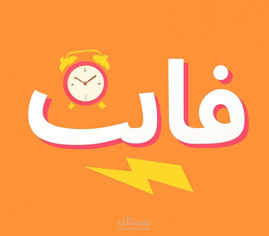 شعار فات معمول بروح شبابية مرتبطة بفكرة الأحداث والـ Events اللي “فاتتك”. التصميم بيجمع بين ساعة منبّه كارتونية مع كلمة “فات” بخط عربي عصري وظل لوني مميز، ومع برق أصفر تحت الكلمة يوصل إحساس بالسرعة واللحظة اللي راحت.