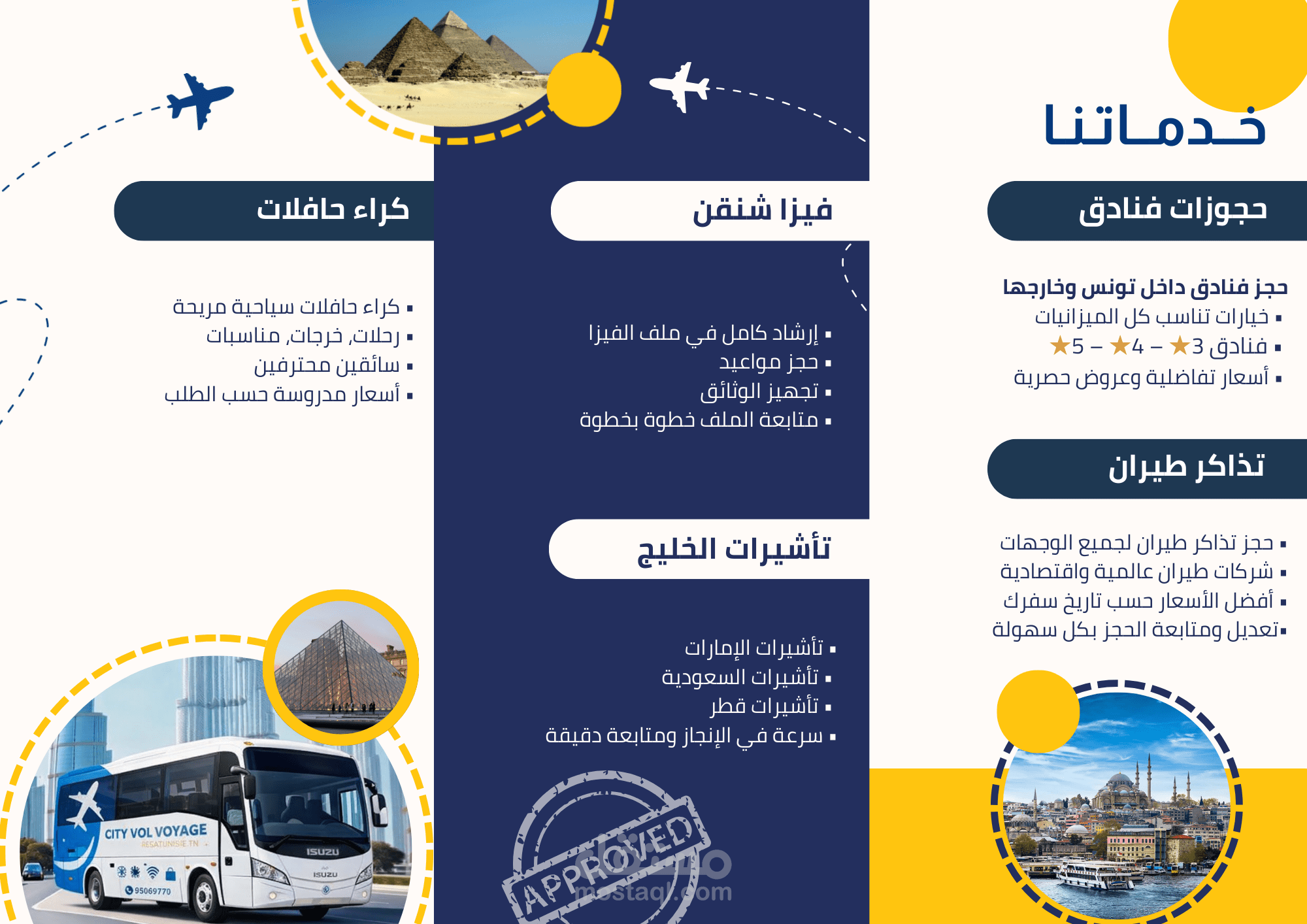 يُقسَّم البروشور إلى خمس خدمات أساسية موزَّعة بشكل منظّم. في الجانب الأيمن، تبرز خدمتا حجوزات الفنادق وتذاكر الطيران؛ إذ تشمل الأولى حجز فنادق داخل تونس وخارجها بخيارات تناسب جميع الميزانيات من ثلاث إلى خمس نجوم مع عروض تفاضلية حصرية، فيما تتضمّن الثانية حجز تذاكر لجميع الوجهات عبر شركات طيران عالمية واقتصادية بأفضل الأسعار حسب تاريخ السفر.