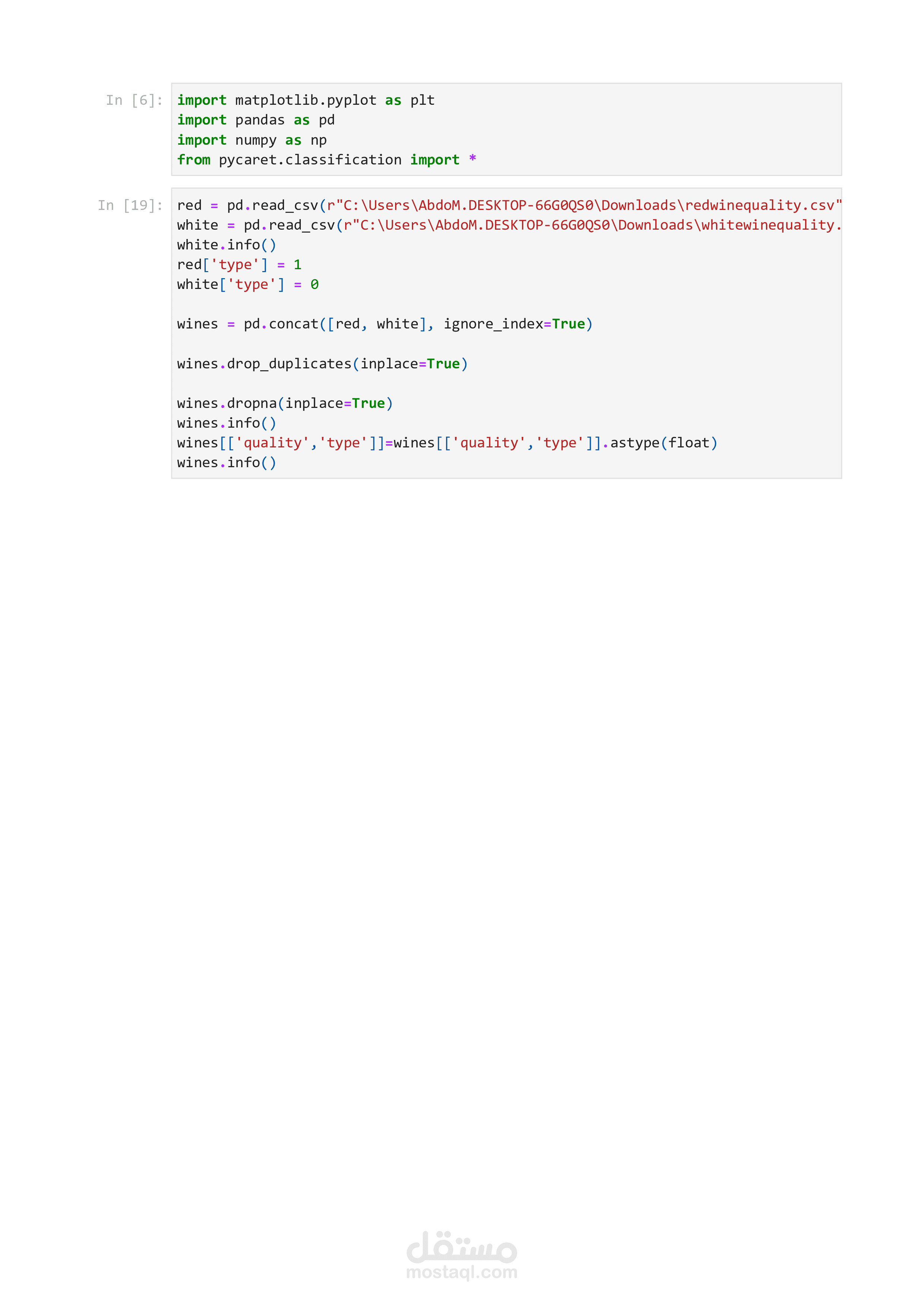 عندى بيانات عن النبيذ الاحمر والنبيذ الابيض قمت بضمهما معا ولكن قبل الضم اضفت عمود type حتى نميز بينهما فيما بعد ولكن بطبيعة الحال قمت بالتعرف على كلا منهما باستخدام ادوات بايثون المختلفه مثل-df.head(),df.info,value_countsوغيرها ثم بعد ذلك قمت بتنظيف البيانات باستخدام methods -dropna,drop_duplicatesثم قمت بتحويل جميع الارقام الىfloatحتى اسهل واسرع المهمه علىpycaret