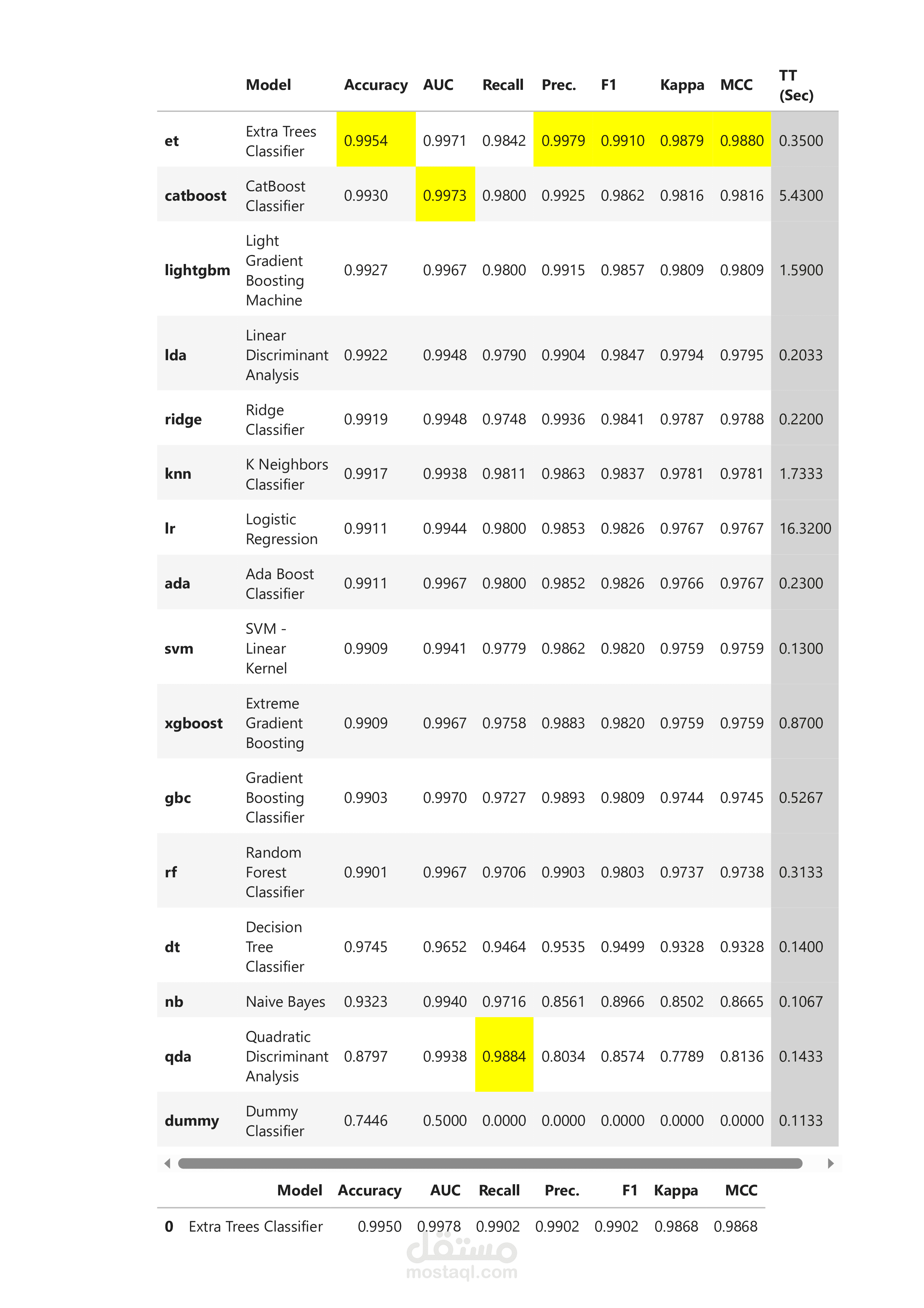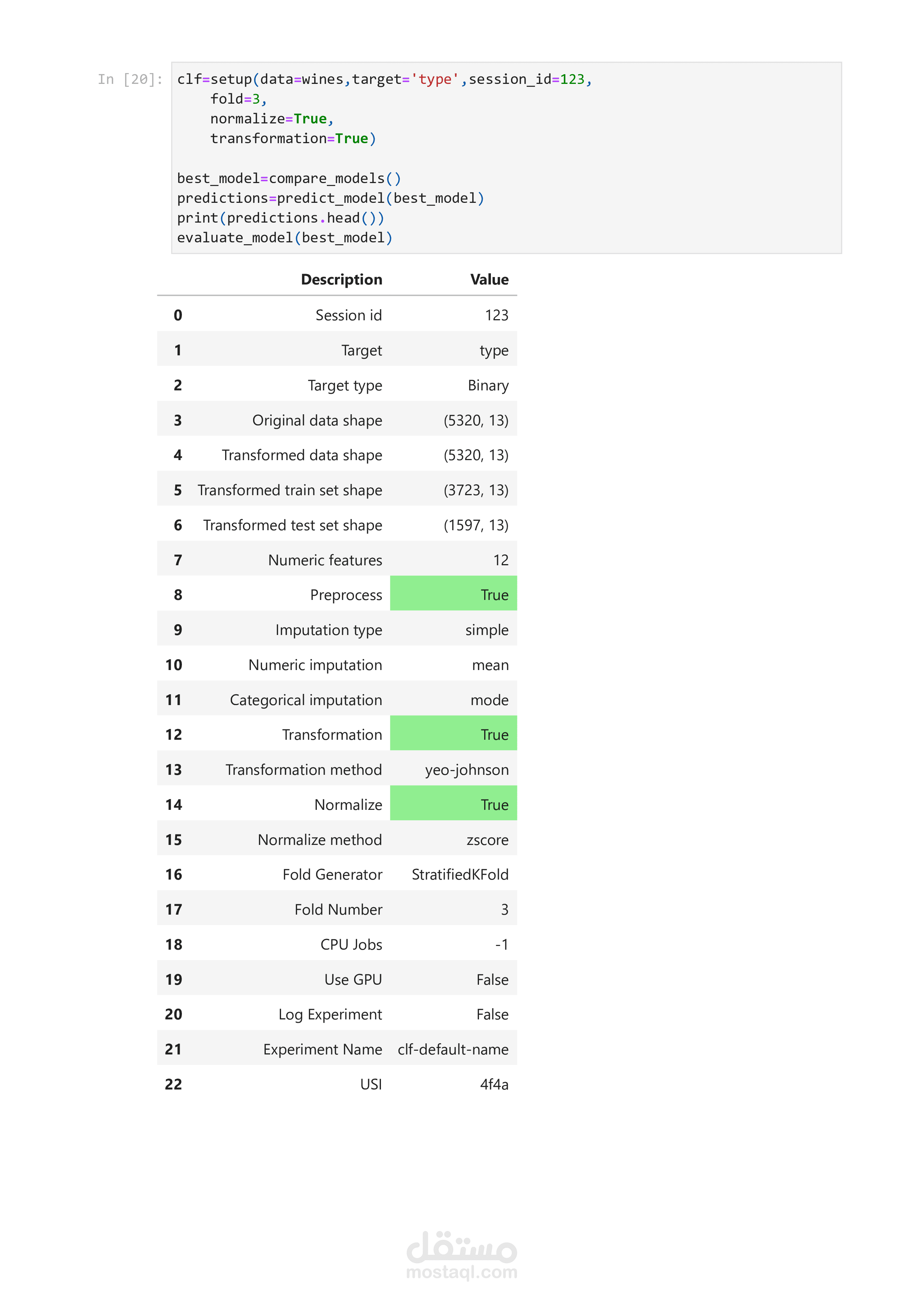 ثم قمت بتسطيب pycaret وخلال ذلك تم تحديد البيانات التى سيعمل عليها وهى wines والعمو الهدف type مع تقليل عدد fold لان default=10 وجهازى حالته سيئة كمااستخدمت True = normalize=True,transformation حتى يتم تحويل الارقام الكبيرة الى ارقام صغيره حول الصفر مع المحافظه على وزنها النسبى فتسهل على pycaret العمل ويكون اكثر دقة وماذكرته للتبسيط والهدف النهائى هو امكانية تحديد نوع النبيذ من خلال معرفة المواصفات المختلفة مثل نسبة الكحول وغيرها من المذكوره فى البيانات وذلك لاى بيانات جديده وسامحونى لانى مبعرفش احكى بس انا فاهم والحمد لله شغلى وبعرف اقوم بيه وكل شىء واضح فى صور وملفات العمل المرفقه.